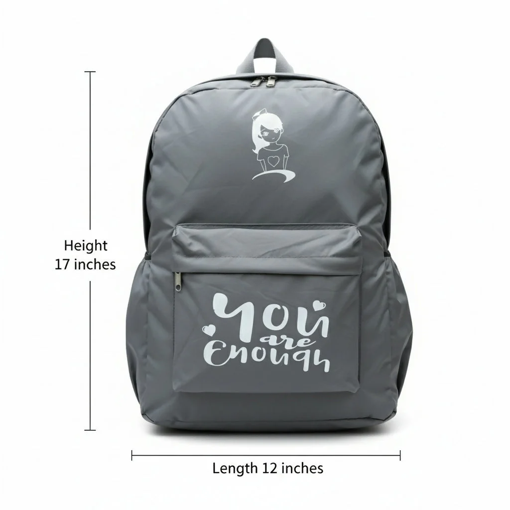 Carry confidence wherever you go with this laptop backpack for women. Made from durable, lightweight fabric, this stylish grey bag features a motivational quote and a cute printed girl design, perfect for everyday use.