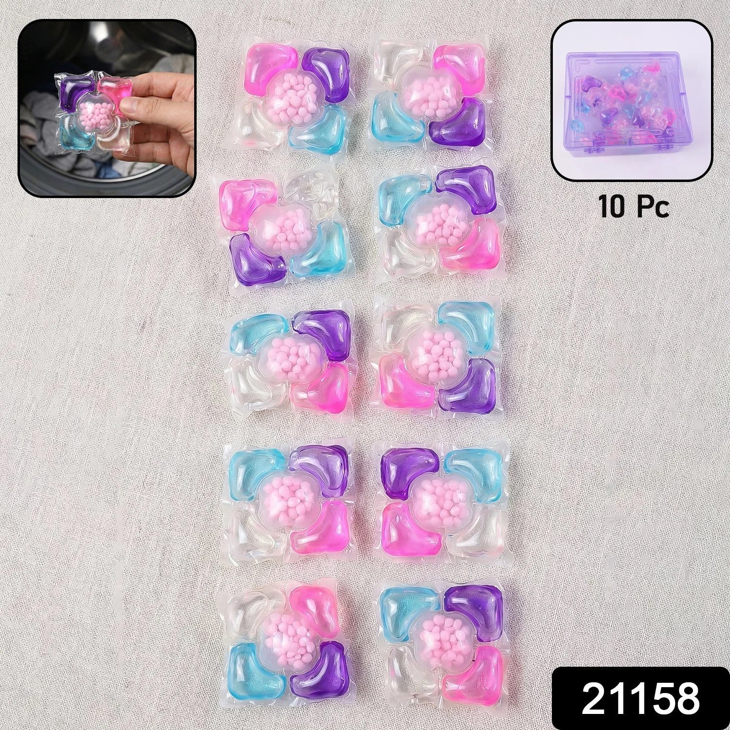 These multicolour laundry detergent pods are designed to make everyday clothes washing simple, efficient, and mess-free. Each pod contains a powerful concentrated cleaning formula that dissolves quickly in water and penetrates deep into fabric fibres to remove dirt, stains, and odours effectively. The pre-measured design ensures the right amount of detergent is used every time, preventing overuse and reducing wastage. Suitable for both automatic and semi-automatic washing machines, these pods provide consistent cleaning performance without the need for measuring liquid or powder detergent. Their compact and easy-to-store format makes them convenient for regular home use as well as travel purposes.
