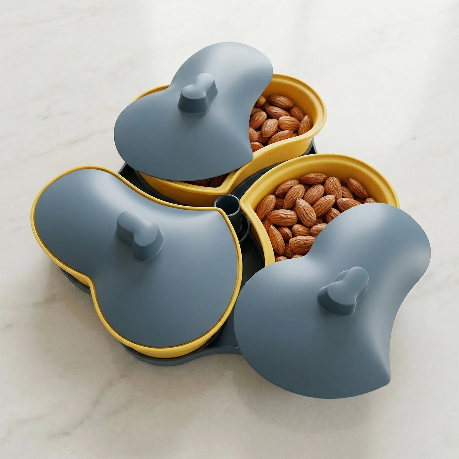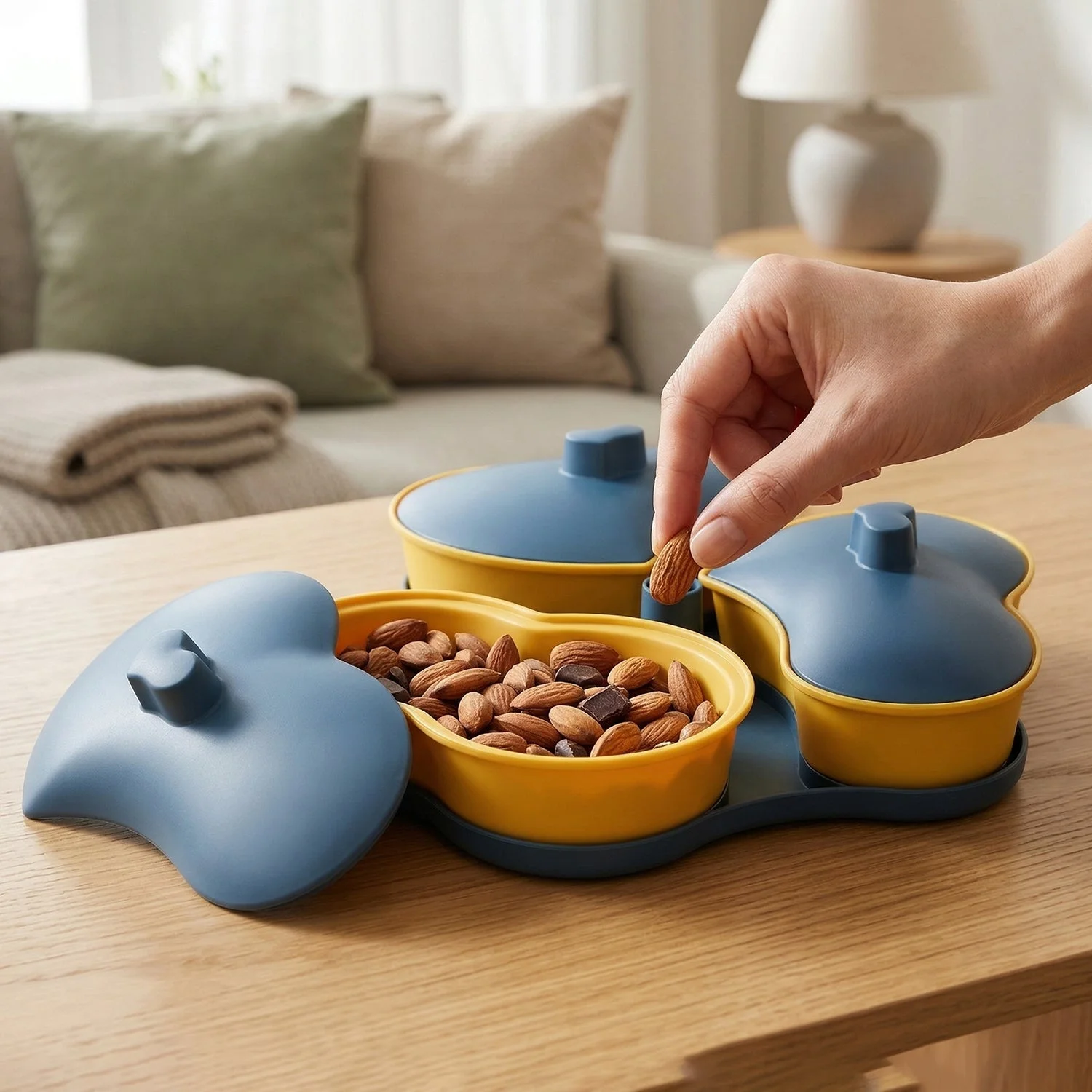 Serve and store your snacks in style with this multipurpose 3-section snack serving tray designed for convenience and elegance. Featuring separate compartments with individual lids, this container allows you to store different snacks, dry fruits, or candies without mixing them. The compact and stylish design makes it perfect for serving guests while keeping food fresh and hygienic. Ideal for daily use or special occasions, this tray enhances presentation while offering practical storage. A smart addition to your kitchen and dining setup for organized and hassle-free serving.