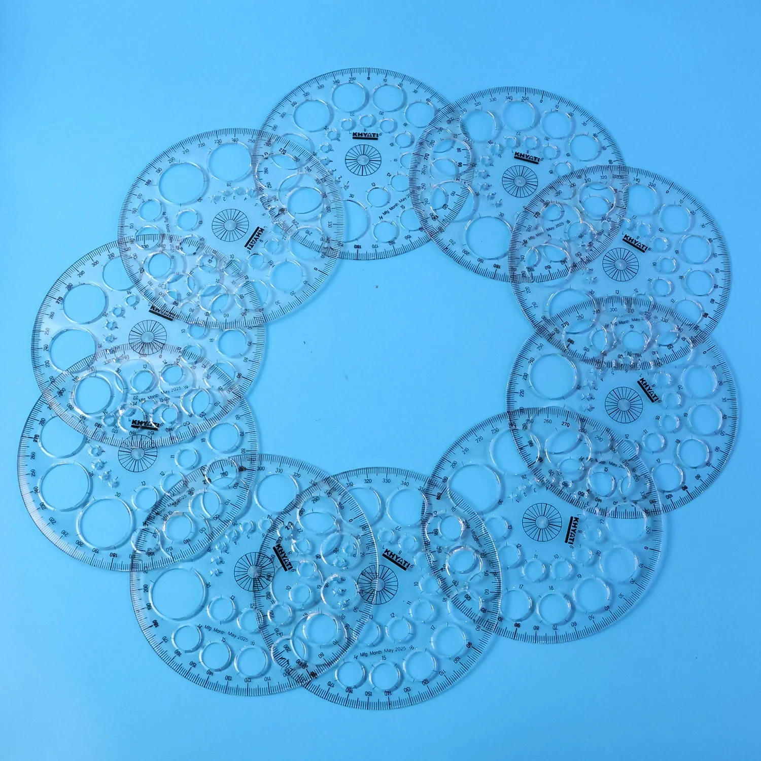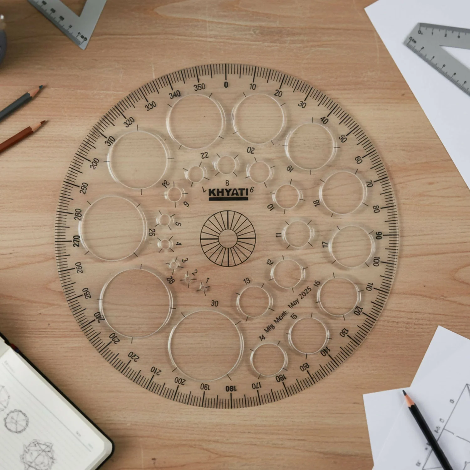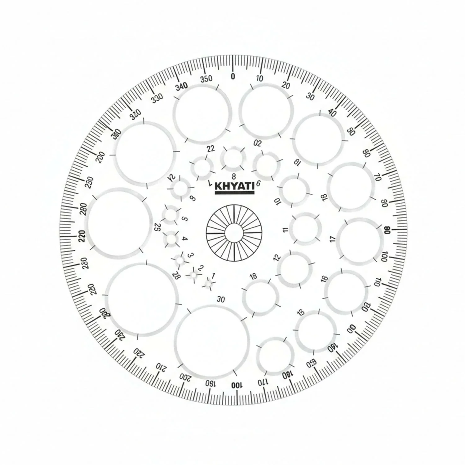This multipurpose circle drawing template protractor stencil is specially designed for accurate geometry work, technical drawing, and creative design needs. It features clearly marked degree measurements along the outer edge along with multiple circle cut-outs in different diameters, making it easy to draw precise circles and angles in one tool. Ideal for students, architects, engineers, designers, and artists, this stencil helps save time while ensuring neat and consistent results. The transparent body allows clear visibility of the drawing surface, improving accuracy during use. Perfect for school, college, office, and professional drafting applications.
