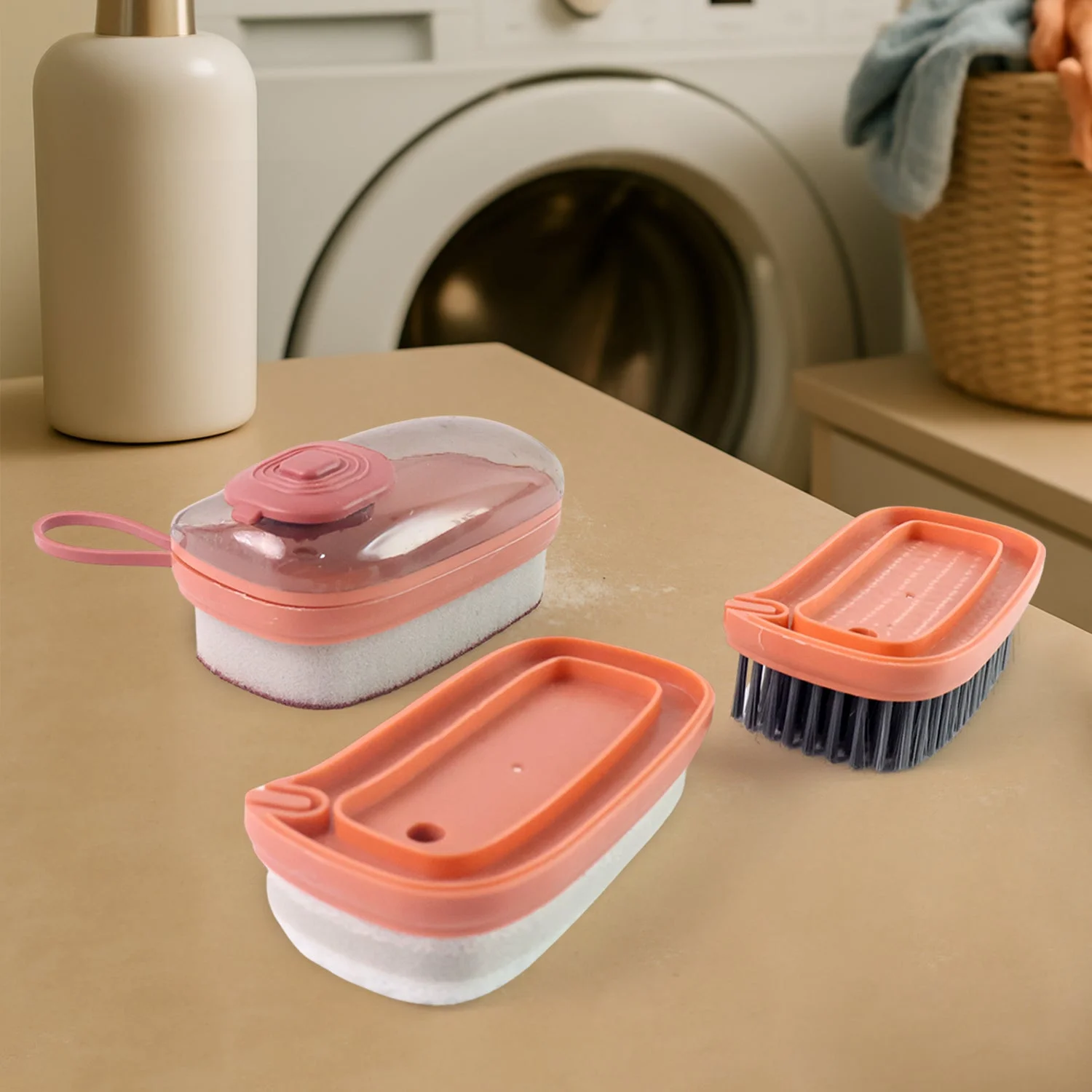 3-in-1 Set – Includes a hydraulic detergent dispenser brush, bristle scrub brush, and multipurpose sponge scrubber