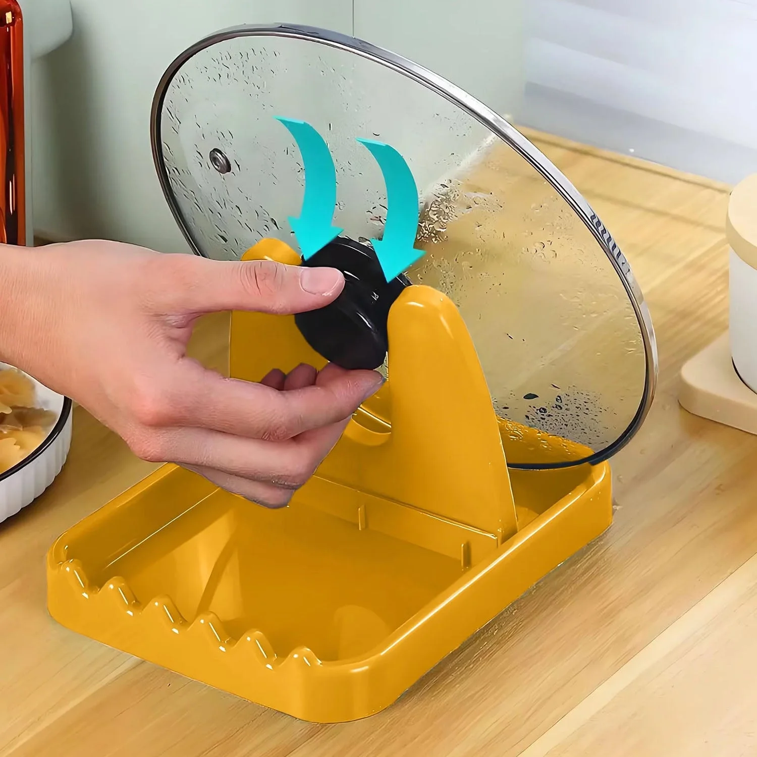 multipurpose kitchen lid and spoon holder, utensil rest stand, pot lid holder, spatula holder, cooking tool organizer, heat-resistant kitchen stand, countertop utensil holder, kitchen gadget for cooking area, multipurpose cooking tool stand, pot and pan lid rack, spoon and spatula rest, cookware organizer stand, kitchen tool holder