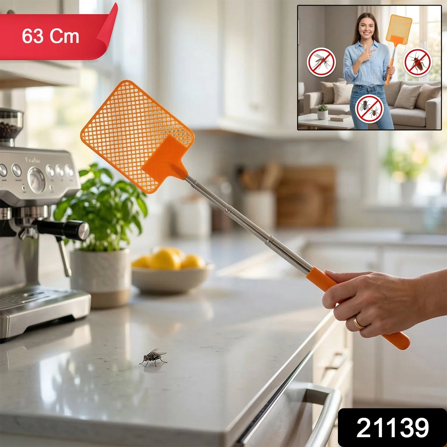 Multipurpose Plastic Fly Swatter With Extendable Handle 63 Cm 1 Pc – Long Reach Insect Killer Racket for Home Kitchen Office Mosquito Fly Control Tool