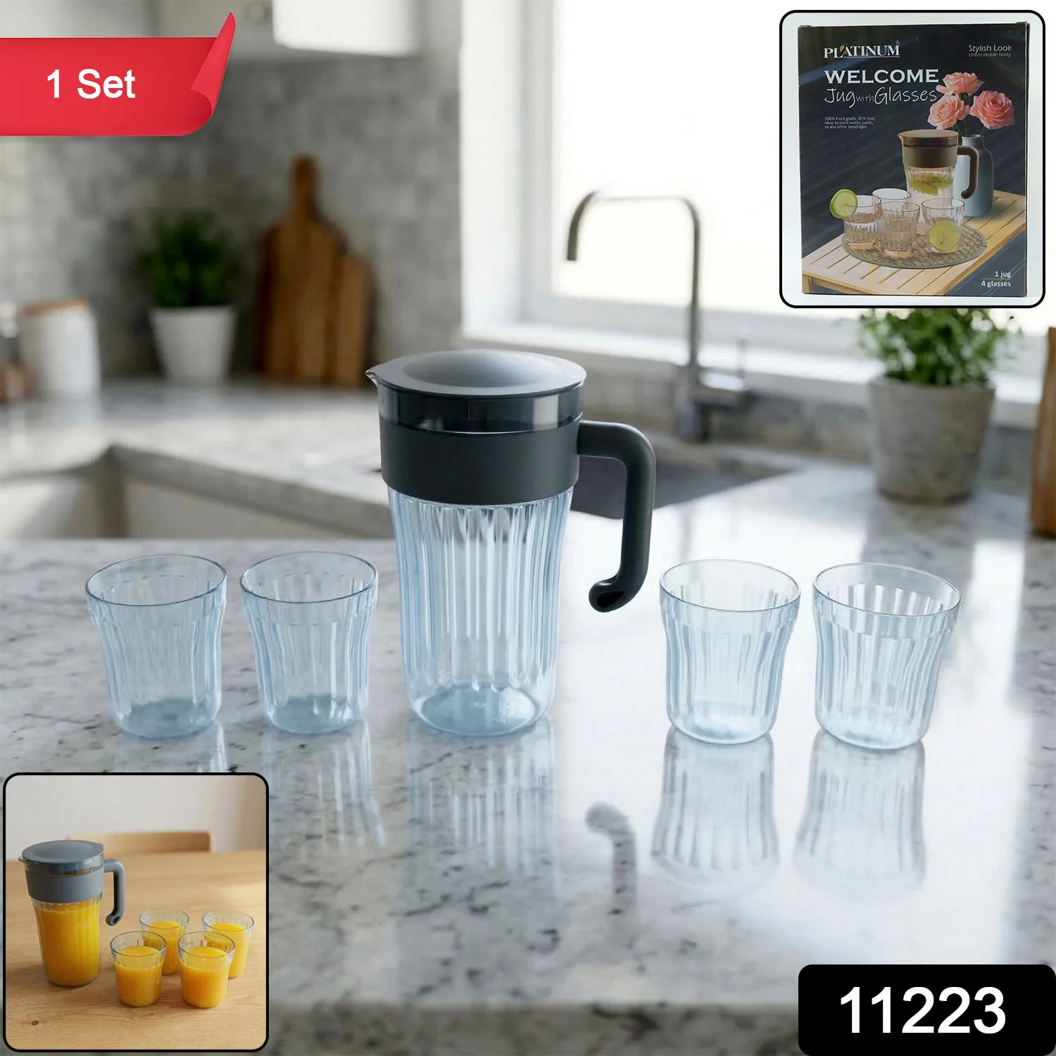 plastic water jug set, multipurpose beverage pitcher, juice serving jug with lid, 4 drinking glasses set, plastic pitcher with handle, cold drink serving set, lemonade pitcher set, water and juice serving set, kitchen dining table pitcher, reusable plastic beverage jug, family drink serving set, durable plastic jug with glasses, party serving pitcher set, lightweight drink pitcher, everyday kitchen serving set, juice and water pitcher set, spill proof beverage pitcher, plastic drinkware set, multipurpose kitchen pitcher