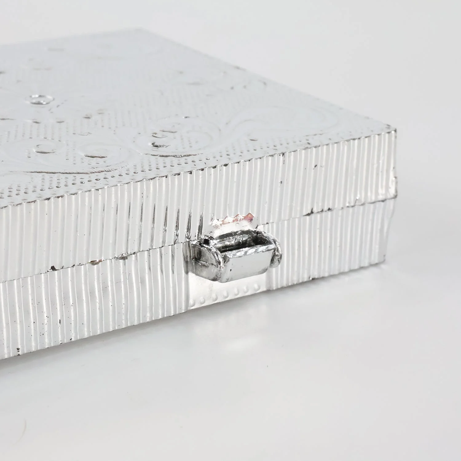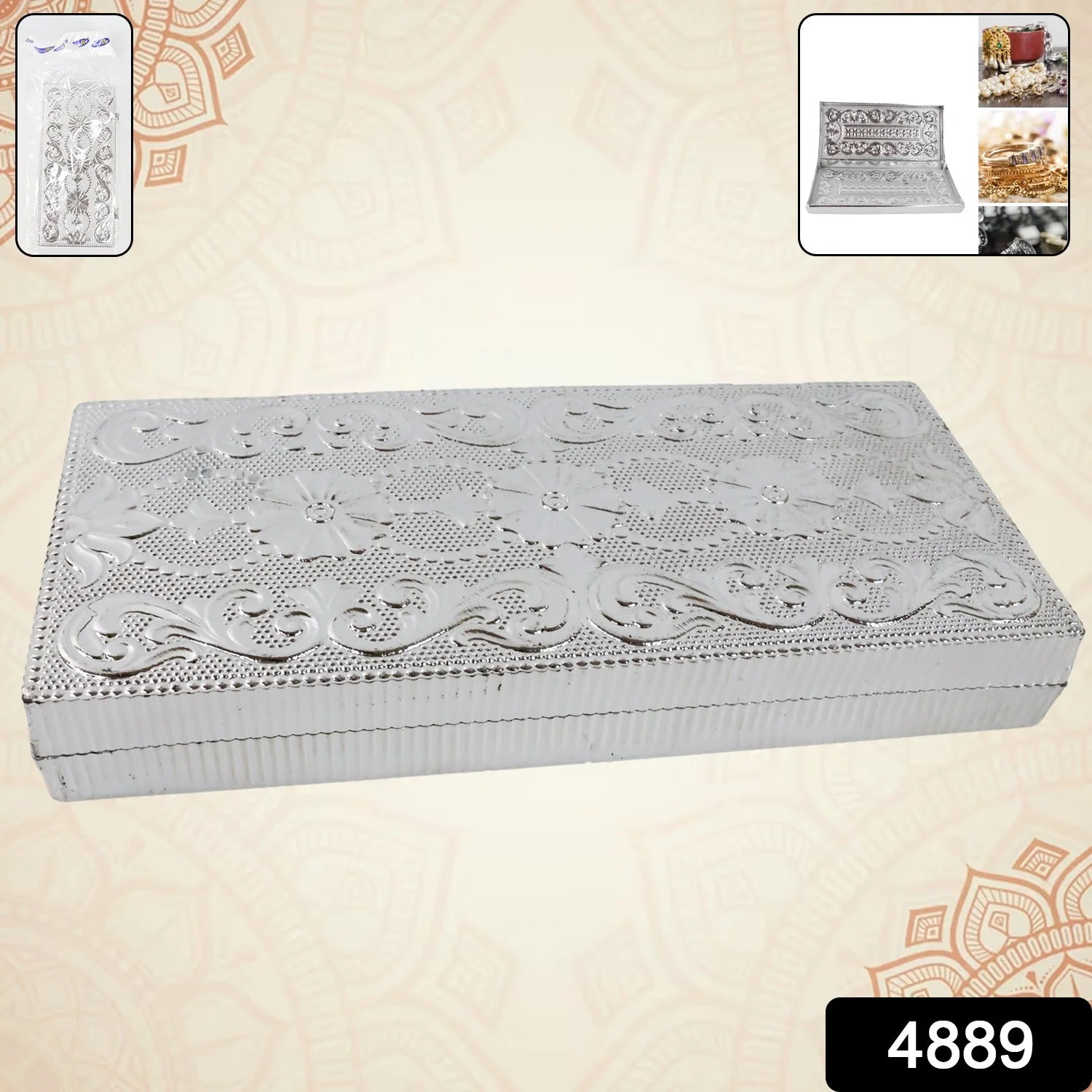 jewelry storage box , multipurpose storage case , angle box , ring holder box , necklace organizer , festival gift packing box , puja room storage , gift packaging box , silver embossed box , rectangle silver case , ornamental craft box