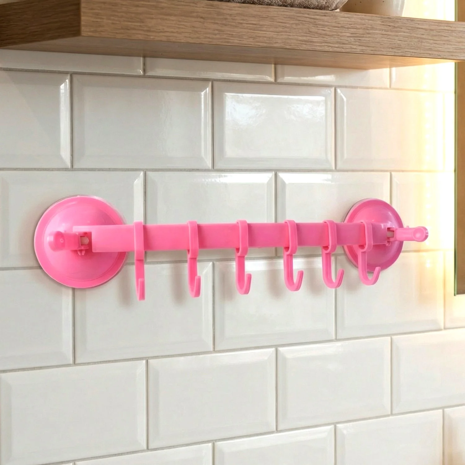 Multipurpose Wall-Mounted Plastic Hanging Rack with Strong Suction Cups & Multiple Hooks – No-Drill Organizer for Kitchen Utensils, Bathroom Accessories, Towels, Keys & Daily Essentials (6 Hook, 1 Pc)