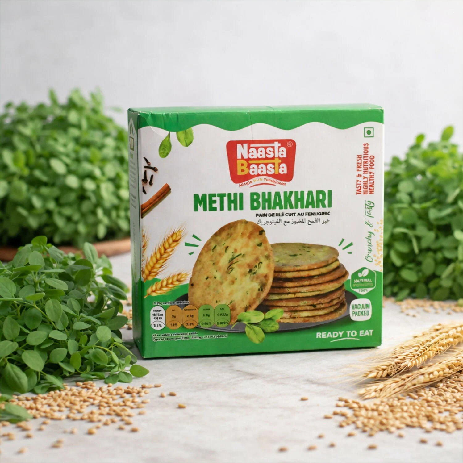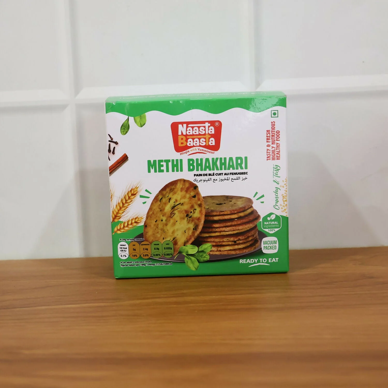 Enjoy the authentic taste of Naasta Baasta Methi Bhakhari, a crispy and flavorful snack infused with the distinctive taste of fenugreek leaves. This ready-to-eat bhakhari combines a crunchy texture with a mildly herbal flavor, making it a delicious and satisfying snack for any time of the day. Carefully prepared to deliver a balanced taste and crispiness, it is perfect for those who enjoy traditional savory snacks with a wholesome twist. The aromatic fenugreek flavor enhances every bite with a rich and comforting taste experience. Packed to maintain freshness and crunch, it is convenient to store and carry wherever you go. Ideal for tea-time snacking, travel, or quick hunger cravings, this bhakhari makes snack moments more enjoyable.
