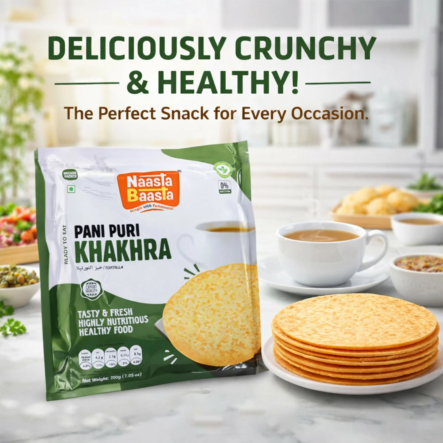 Naasta Baasta Pani Puri Khakhra is a deliciously crunchy and healthy ready-to-eat snack inspired by the authentic pani puri flavor, crafted to deliver crispy goodness in every bite