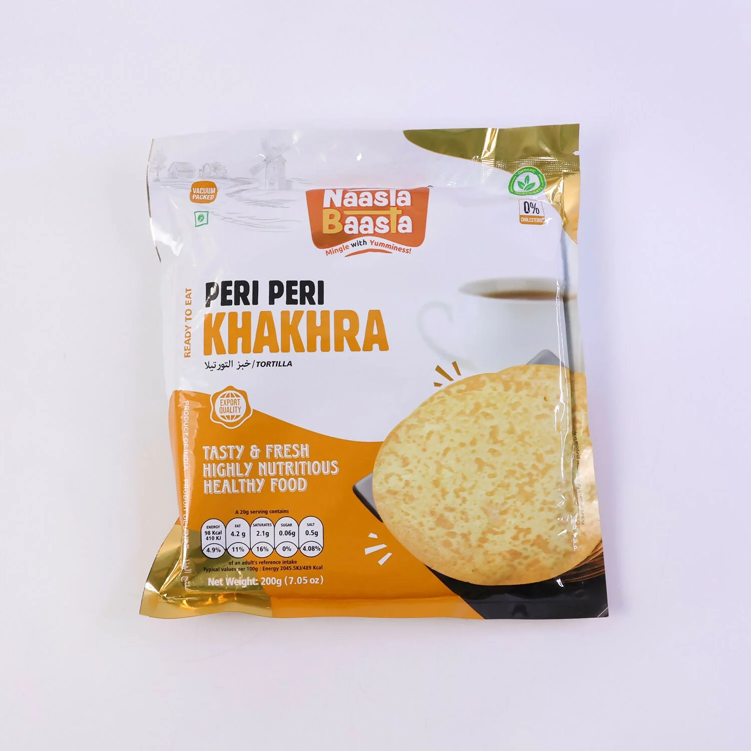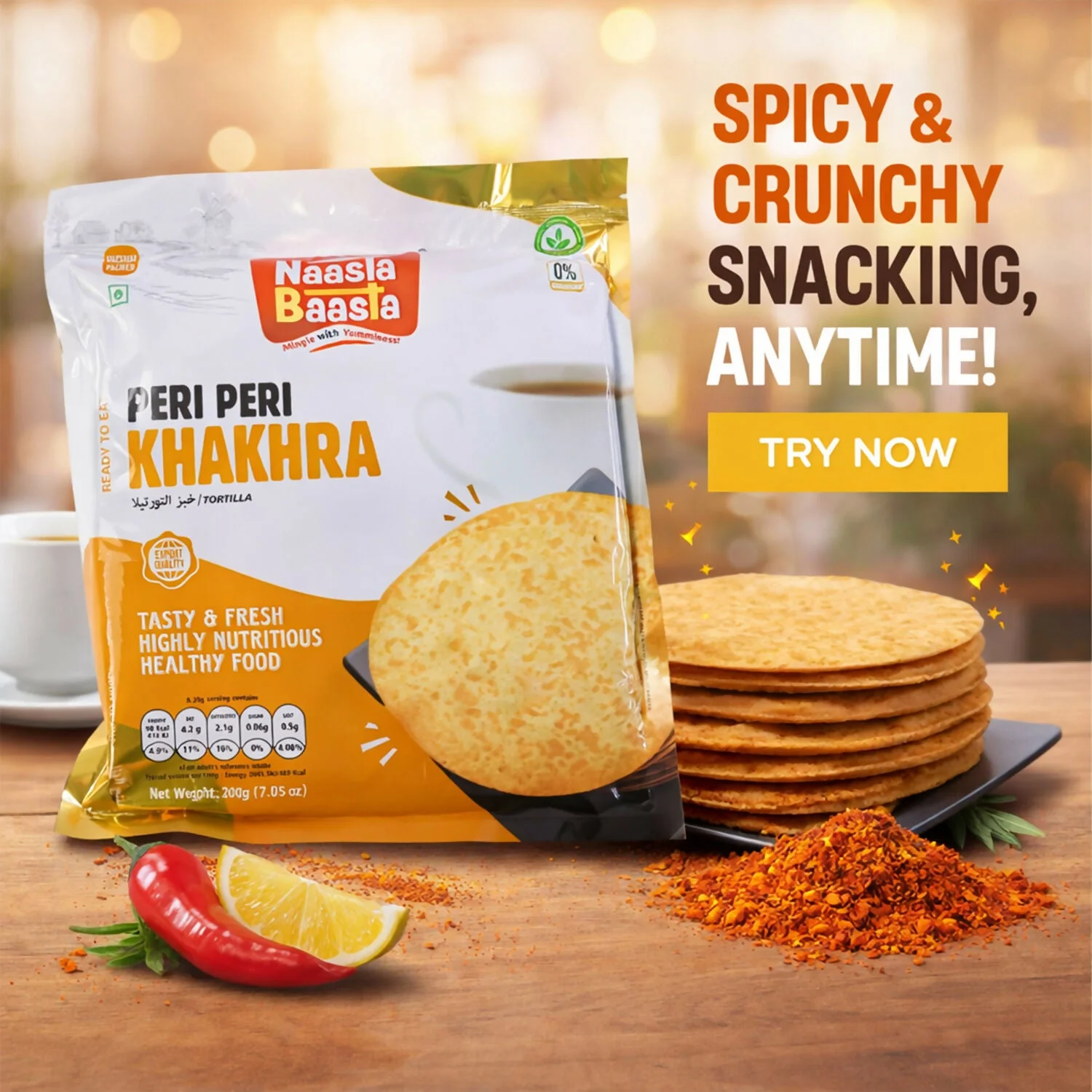 Enjoy the bold and exciting taste of Naasta Baasta Peri Peri Khakhra, a crunchy snack packed with a zesty peri peri flavor. This ready-to-eat khakhra delivers a satisfying crispy texture combined with a tangy and spicy taste that makes snack time more enjoyable. Perfect for those who love flavorful snacks, it offers a delicious balance of crunch and seasoning in every bite. The spicy peri peri blend enhances the taste with a vibrant and savory punch. Carefully packed to maintain freshness and crispiness, it is convenient to store and carry anywhere. Whether enjoyed during tea time, office breaks, or travel, this khakhra is a tasty snack option for any moment.