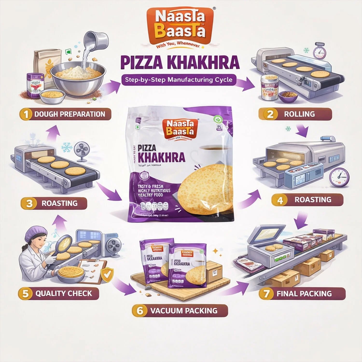 Naasta Baasta Pizza Khakhra is a ready to eat snack made with whole wheat and crafted to deliver a tasty and fresh experience