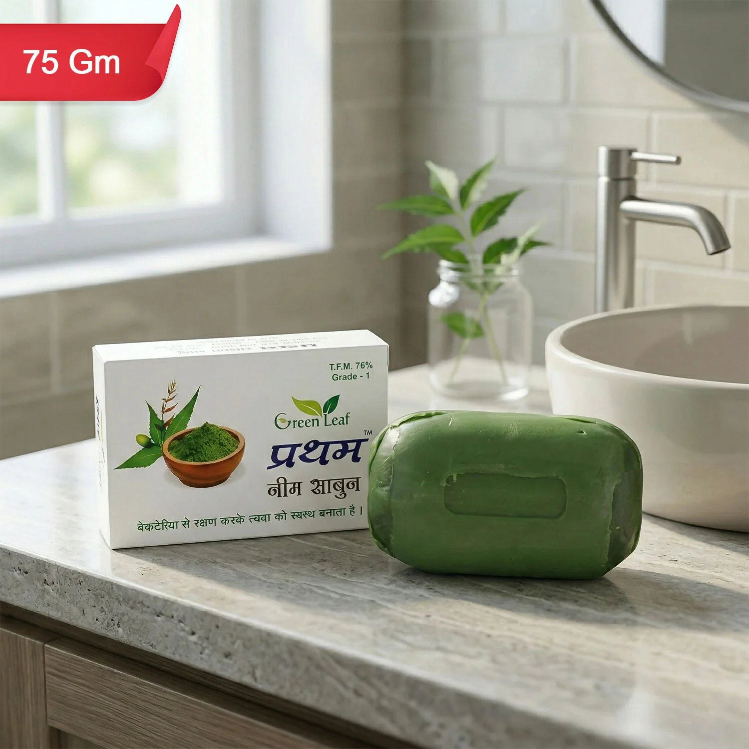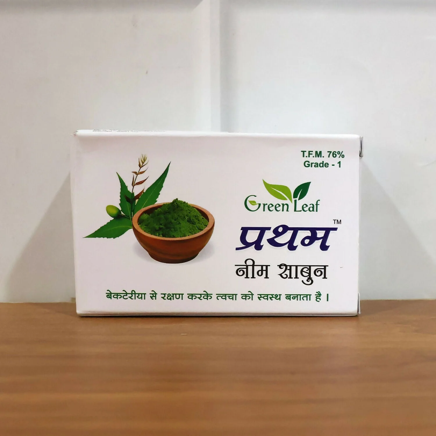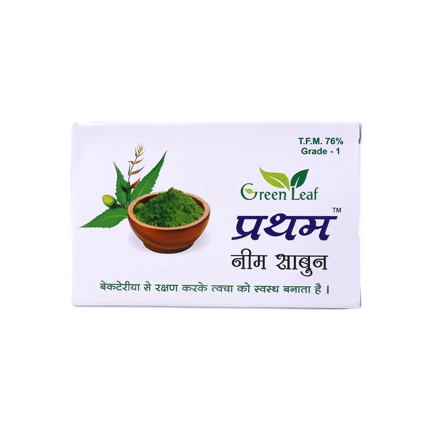 Green Leaf Prathem Neem Soap is a herbal bathing bar enriched with the natural goodness of neem to help cleanse and protect your skin. Formulated to support antibacterial care, it helps remove impurities, excess oil, and dirt while keeping the skin fresh and healthy. The rich lather gently cleanses the body and face without causing dryness. Ideal for daily use, this neem soap promotes clear-looking skin and a refreshed feel after every wash. Suitable for all skin types and perfect for maintaining everyday hygiene.