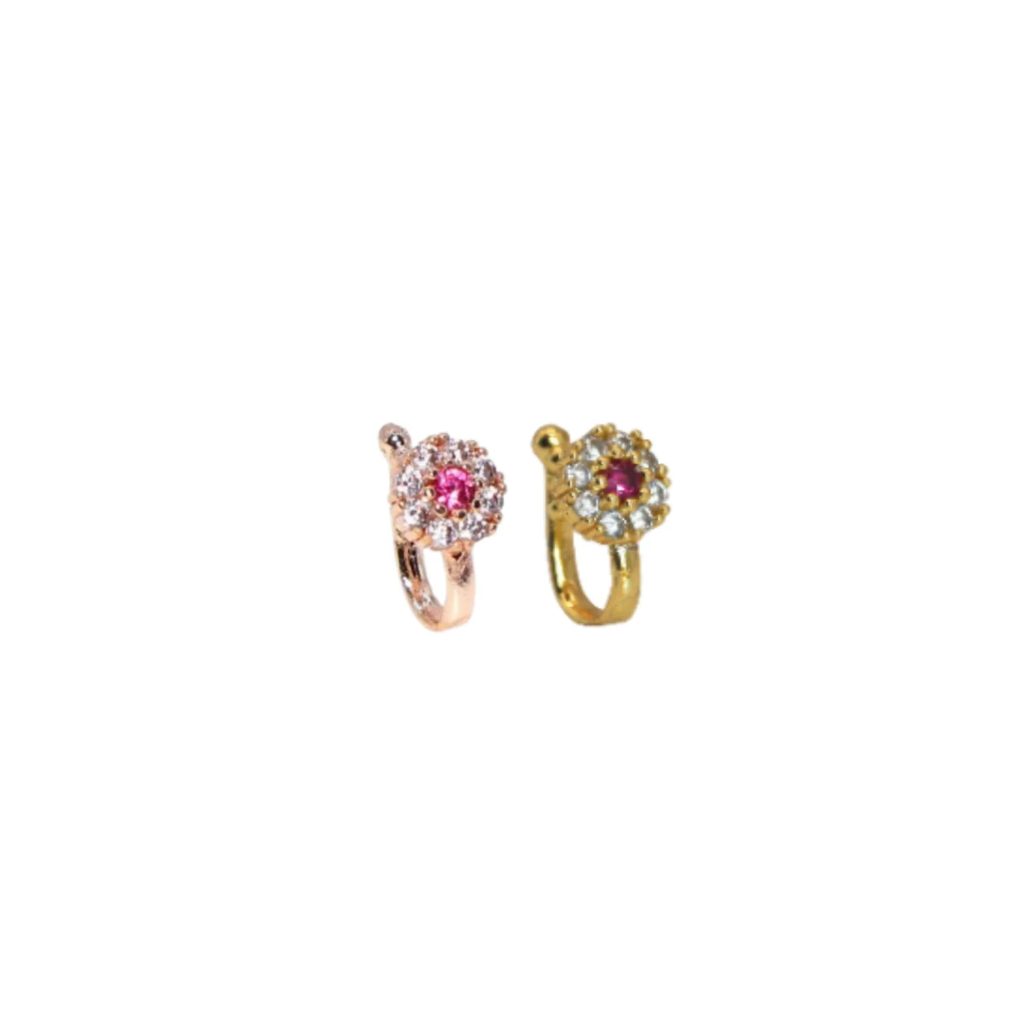 Keywords: Non-Piercing Nose Ring, Clip On Nath, Fake Nose Pin, Gold Plated, Rose Gold Jewelry, Floral Nose Ring, Pink Stone, CZ Jewelry, Temporary Piercing.