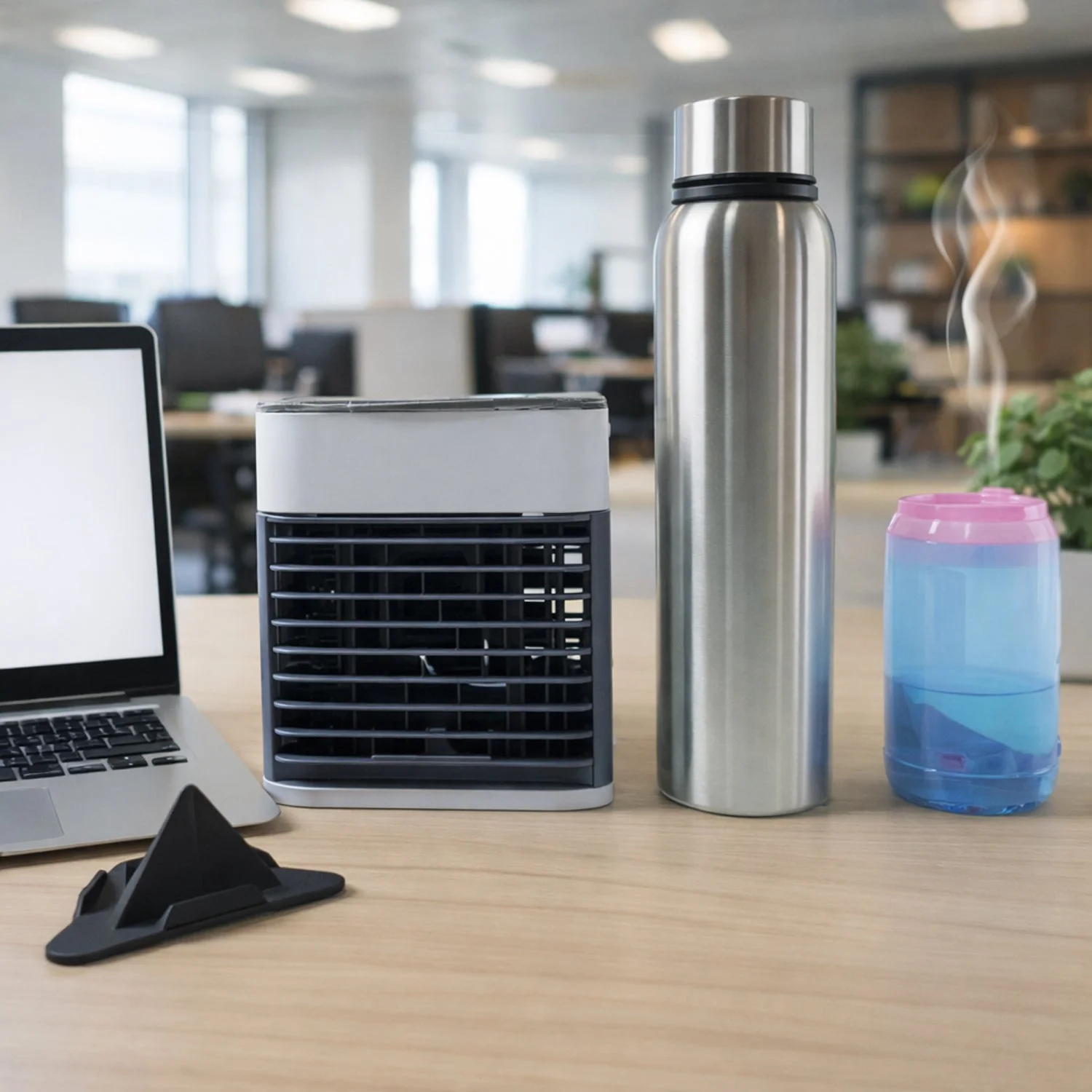 this office essentials combo is a practical and value-packed set designed to enhance daily comfort and productivity at work or home. the combo includes a compact desktop air cooler fan for personal cooling, a stainless steel water bottle suitable for hot and cold beverages, and a lightweight portable sipper bottle for easy hydration throughout the day. the space-saving design makes it ideal for desks, study tables, and small workspaces. this combo is suitable for regular office use, remote working setups, study environments, and gifting purposes.