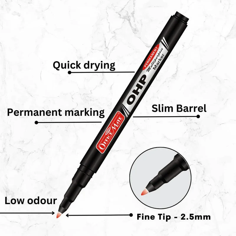 The Officemate OHP/CD DVD Red Marker Pen is a durable, fine-tipped marker designed for smooth and precise writing on multiple surfaces. Its quick-drying, fade-proof, and water-resistant ink ensures long-lasting clarity without smudging. The fine polyester fiber tip delivers accurate lines, while the slim, comfortable barrel provides excellent grip and control. Suitable for both professional and creative purposes, this marker pen writes effortlessly on OHP sheets, CDs, DVDs, glass, metal, wood, and plastic.