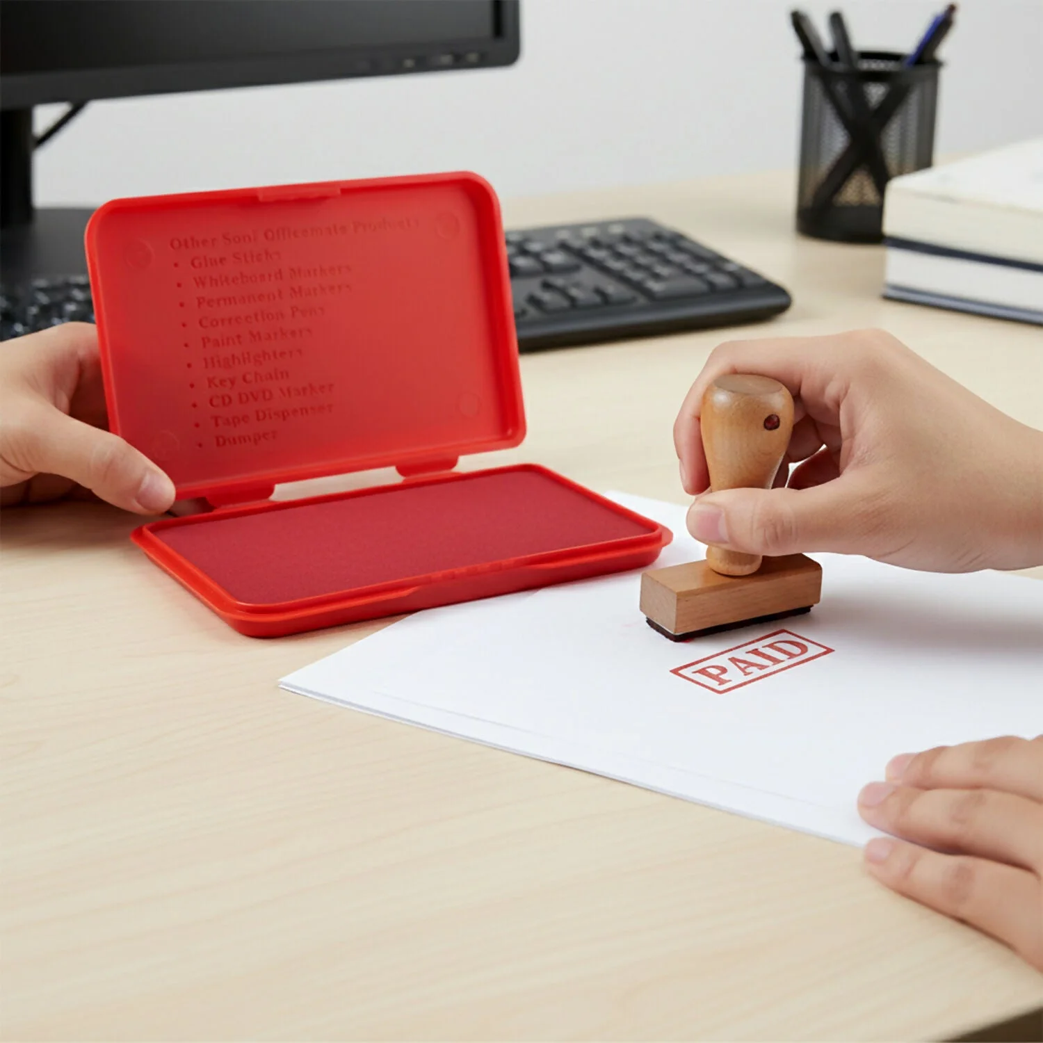 This red color stamp pad is designed to deliver clear, sharp, and consistent stamp impressions on documents. The smooth ink surface ensures even ink distribution, helping avoid patchy or faded marks during regular use. Its sturdy outer case protects the ink pad from dust and drying, making it suitable for long-term office use. Easy to open and handle, it supports effortless stamping without applying extra pressure. Ideal for offices, schools, banks, and official paperwork where clean and professional marking is required.