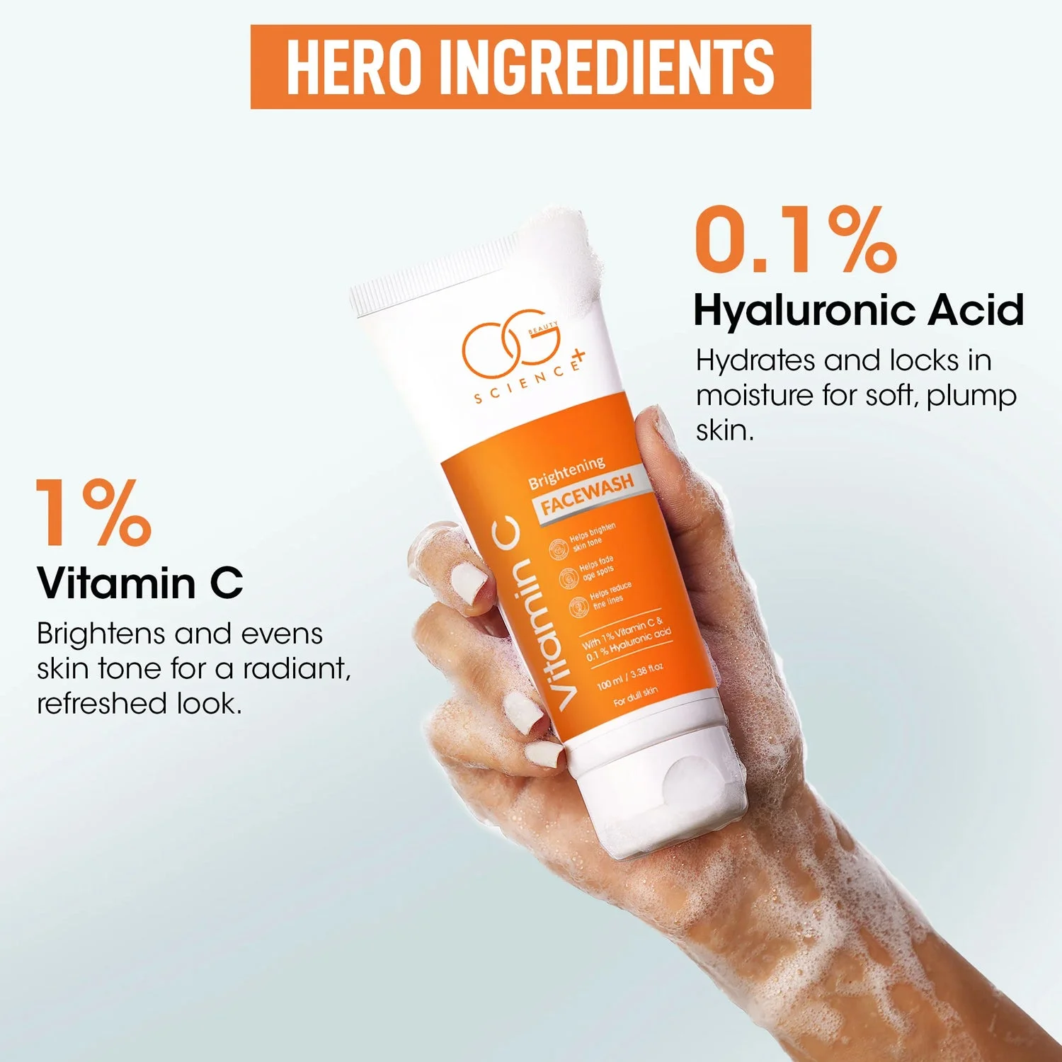 OG Beauty Vitamin C Brightening Facewash with Hyaluronic Acid – Deep Cleansing, Skin Brightening, Age Spot Reduction & Hydration – 100 ML Tube