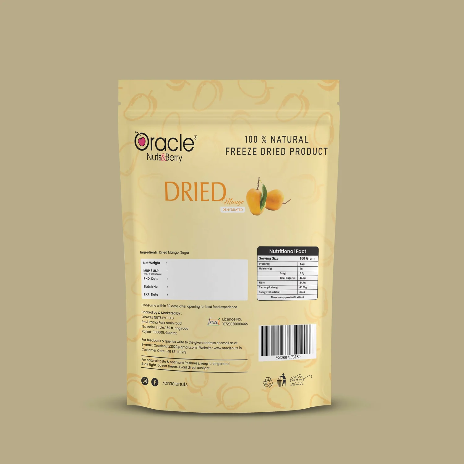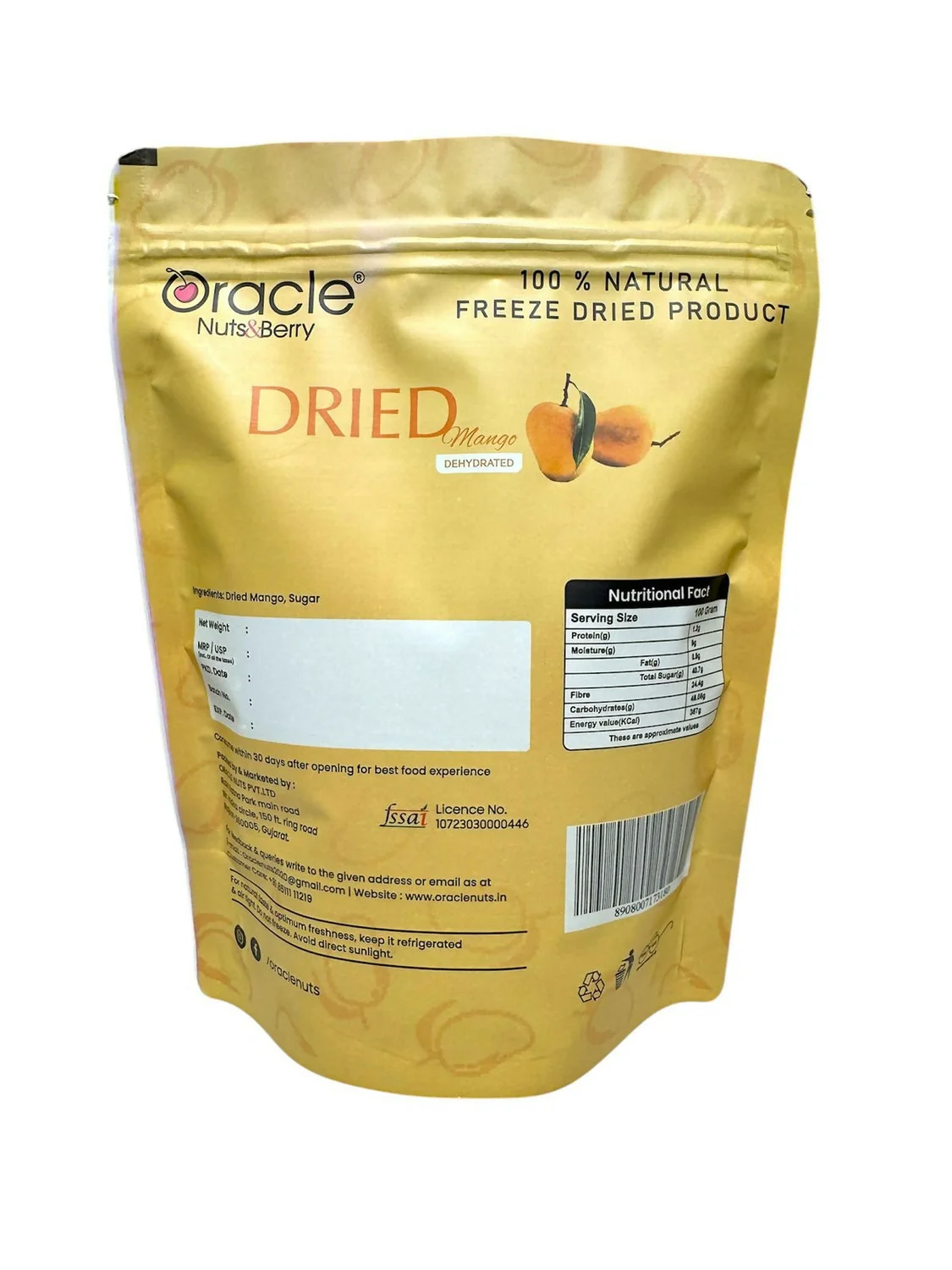 Oracle Dried Mango is a premium dehydrated fruit snack made from carefully selected naturally ripened mangoes. This 250gm pack offers a rich, sweet flavour with a soft chewy texture, ideal for everyday snacking. The dehydration process helps preserve the fruit’s natural taste and nutritional value. It can be enjoyed on its own or added to cereals, desserts, and baking recipes. Packed in a resealable pouch to maintain freshness and convenience.