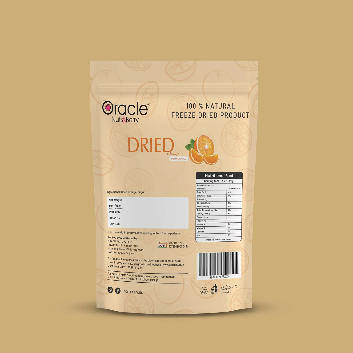 Oracle Dried Orange is a flavourful dehydrated fruit snack prepared from carefully selected fresh oranges. This 250gm pack delivers a naturally tangy taste with a satisfying chewy texture, making it ideal for healthy snacking. The gentle dehydration process helps retain the fruit’s original flavour and nutritional goodness. It can be enjoyed directly or used as a topping for cereals, desserts, and beverages. Packed in a resealable pouch to ensure long-lasting freshness and easy storage.