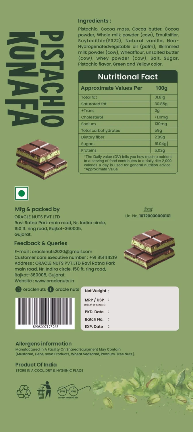 Indulge in the luxurious taste of the Oracle Nuts & Berry Dubai Pistachios Kunafa Bar Chocolate, crafted to bring the exotic Middle Eastern dessert experience in every bite. This 100gm premium chocolate bar combines the richness of roasted pistachios with crispy kunafa strands, encased in smooth, velvety chocolate. Each piece delivers a perfect balance of nutty, crunchy, and chocolaty indulgence, making it a delightful treat for gifting or self-enjoyment.