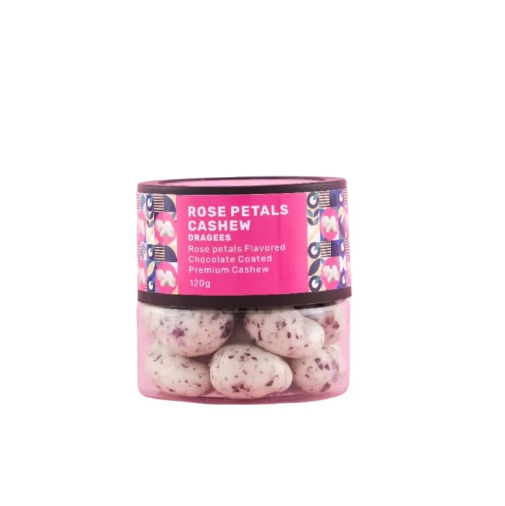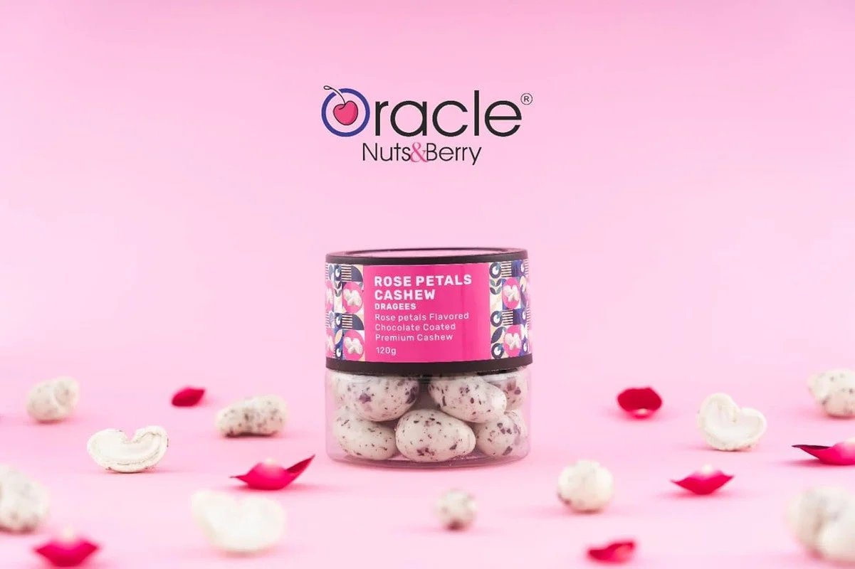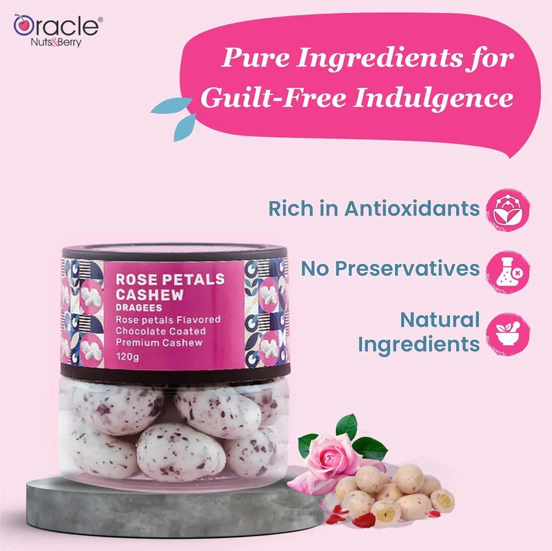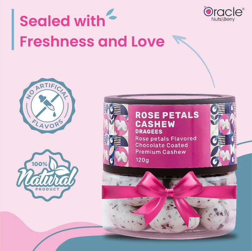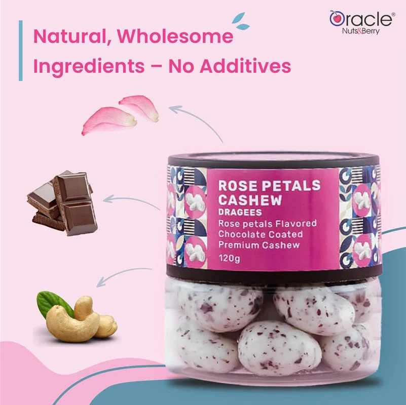 Indulge in the luxurious taste of Oracle Nuts & Berry Rose Petals Cashew Dragees, a delightful fusion of premium cashews coated in rich chocolate with the exotic flavor of rose petals. Perfectly crafted for those who love gourmet indulgence, these dragees offer a unique balance of crunch, creaminess, and aromatic sweetness. Whether as a personal treat, a thoughtful gift, or a special addition to celebrations, these rose-flavored chocolate-coated cashews bring elegance and taste to every moment.