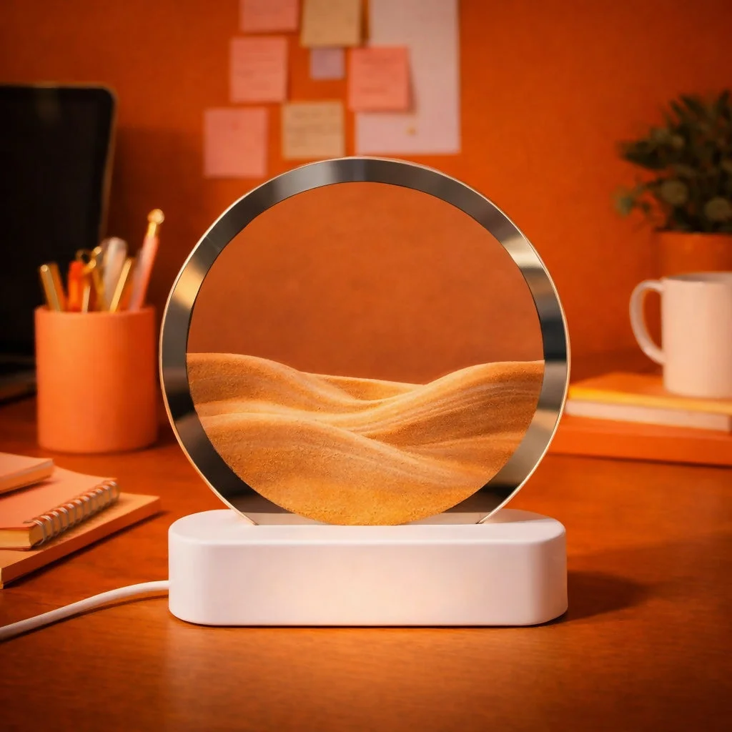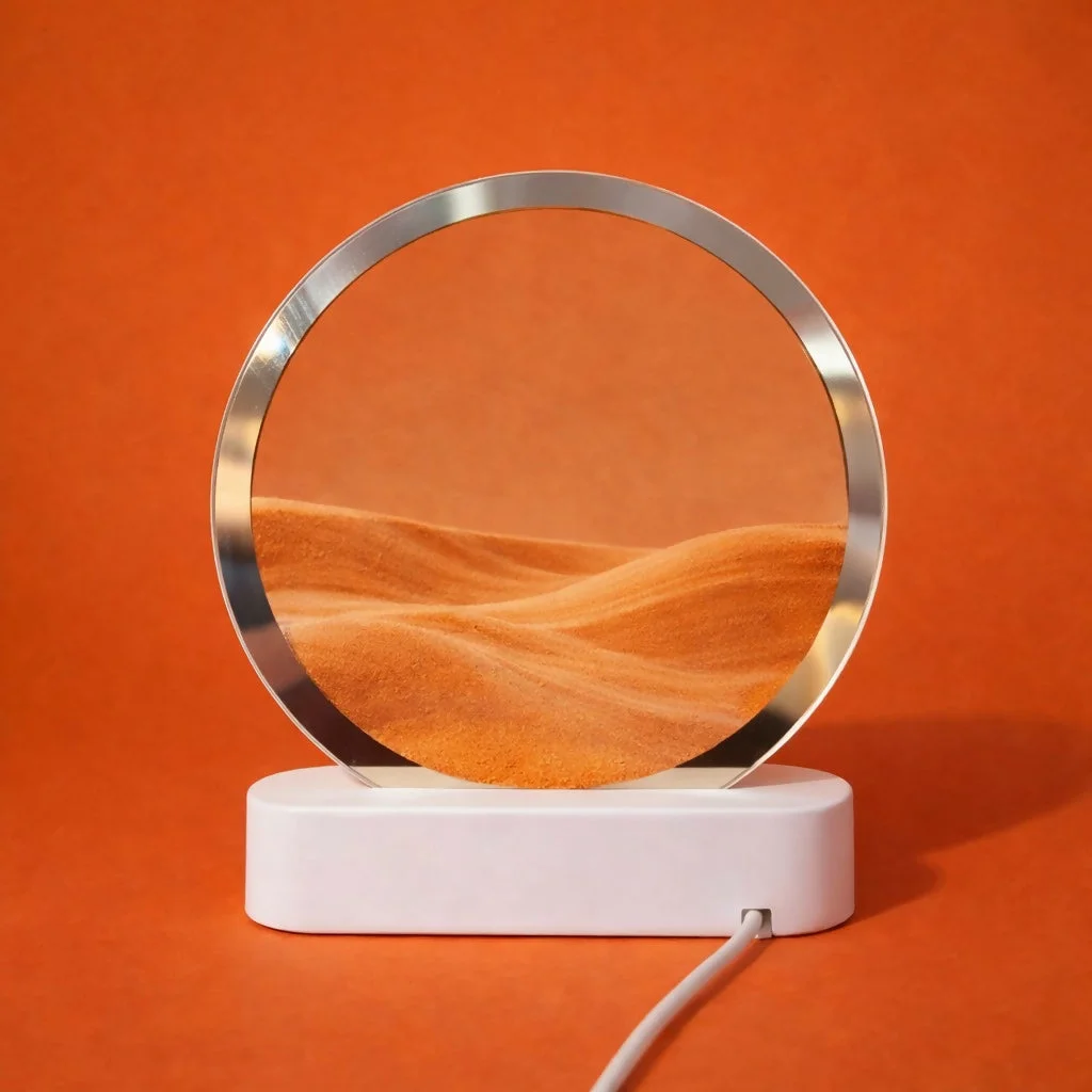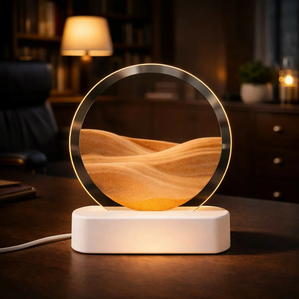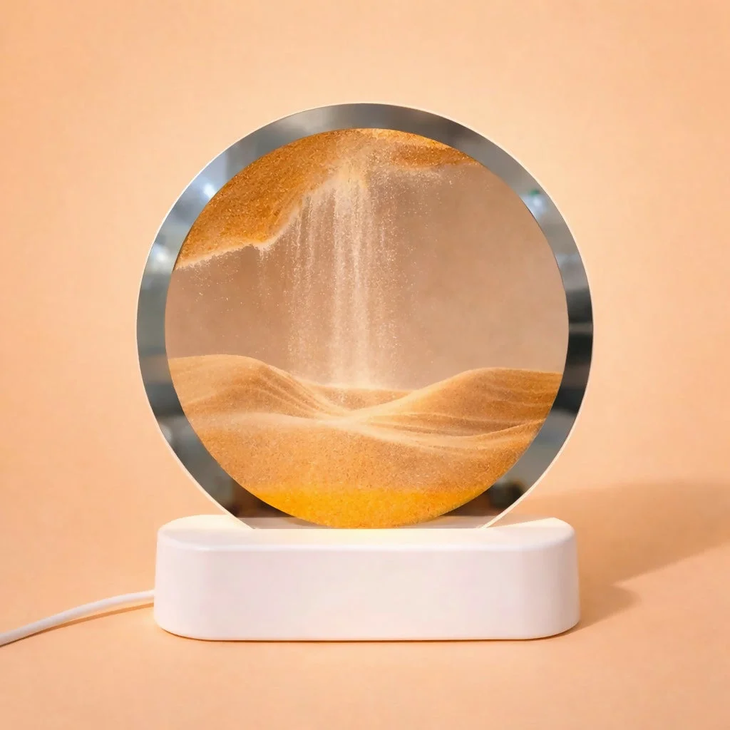 sand art lamp, moving sand lamp, LED decorative lamp, flowing sand art, ambient light lamp, desk lamp décor, relaxing lamp, bedside night light, modern home décor, office table lamp, unique gift lamp