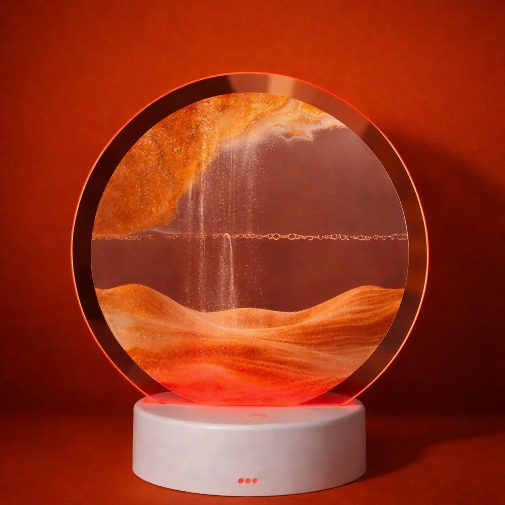 Elevate your décor with this stunning moving sand art LED lamp that creates ever-changing scenic patterns. The circular acrylic design showcases flowing sand that forms beautiful landscapes each time it is flipped, offering a relaxing and visually soothing experience. Enhanced with soft LED lighting, it adds warmth and elegance to any space. Perfect for bedrooms, living rooms, or office desks, this lamp blends modern design with calming functionality, making it an ideal décor piece and thoughtful gift.