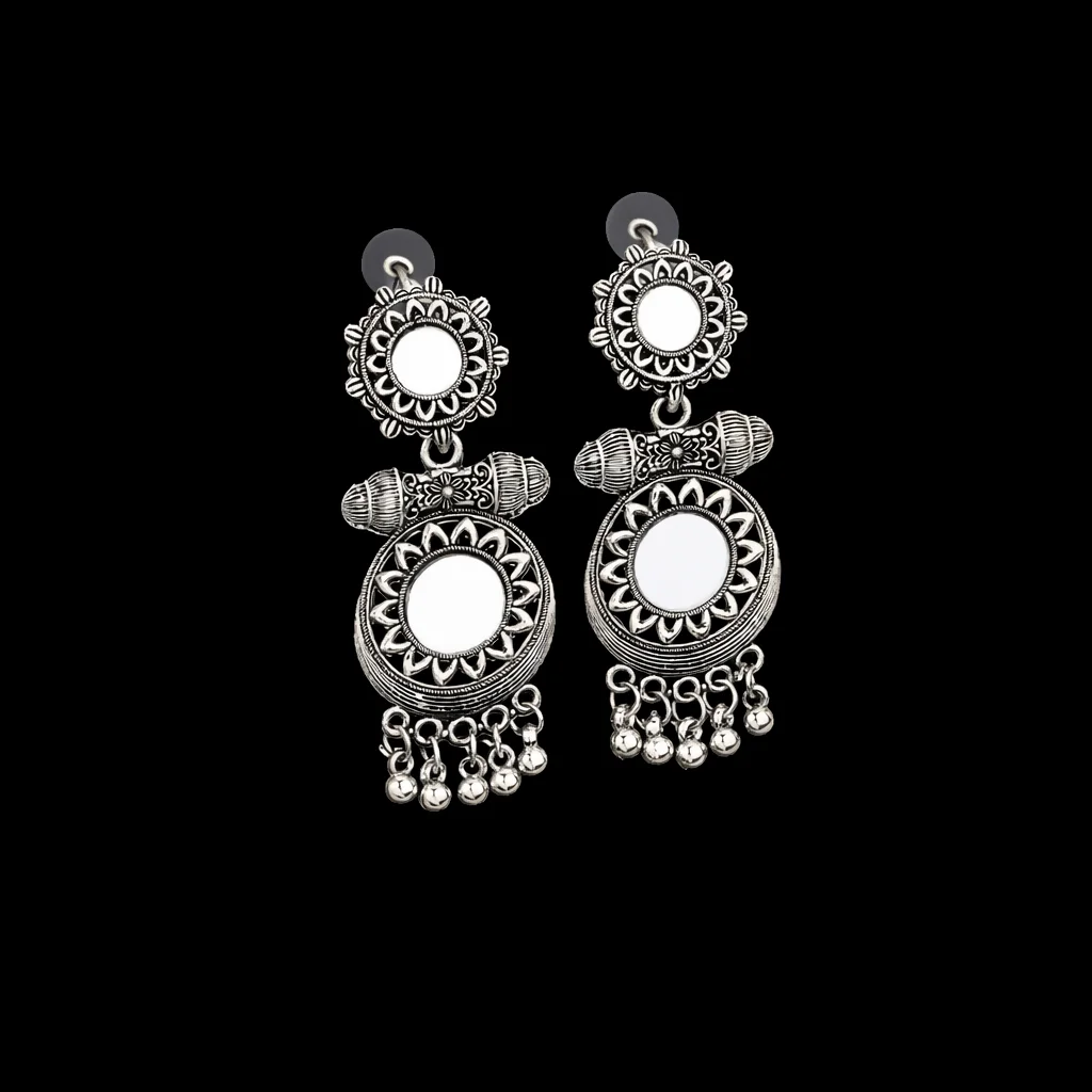 Beautiful oxidised silver earrings with elegant round mirror work and detailed ethnic carving.Elegang design light weight Earrings with gungroo crafted. Perfect design for traditional wear like kurti saree etc.