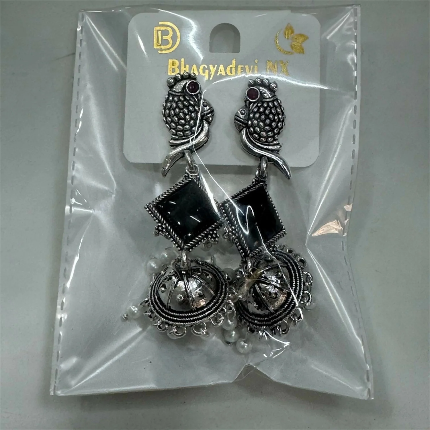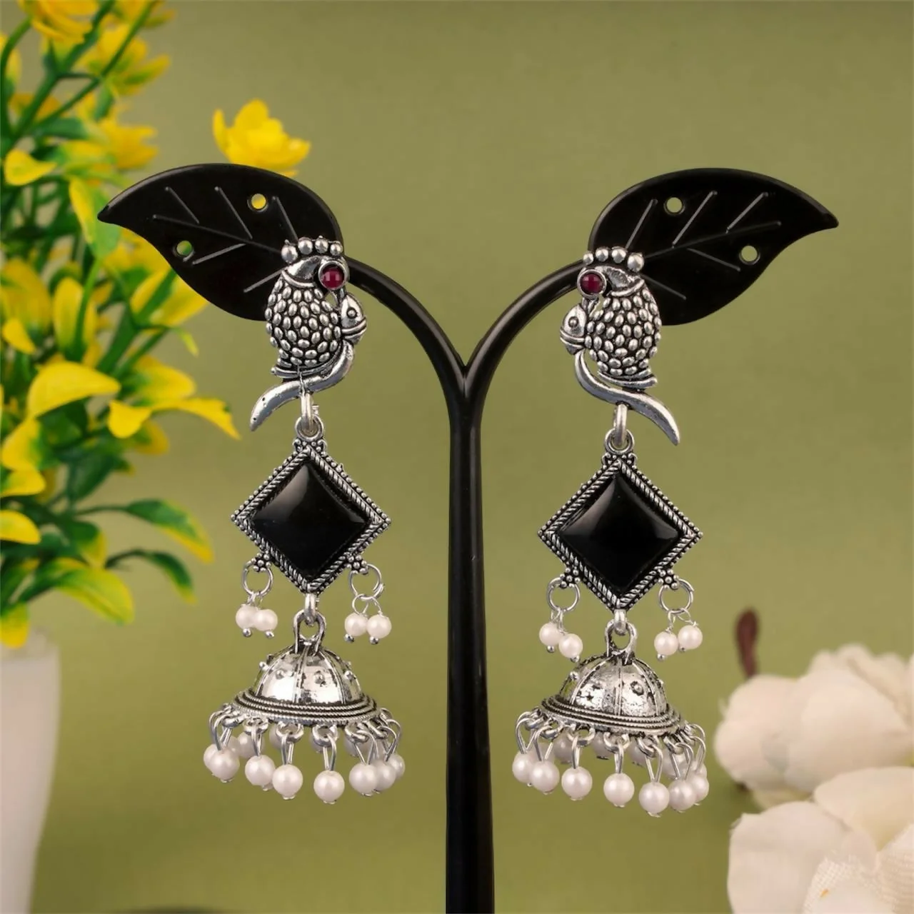Add a touch of traditional charm to your look with these beautifully crafted oxidised silver jhumka earrings. Designed with an elegant parrot motif, black square stone, and dangling pearl beads, this pair blends ethnic artistry with modern appeal. Lightweight, skin-friendly, and perfect for daily wear, festive events, parties, or gifting.Oxidised earrings, parrot design earrings, black stone jhumka, pearl dangler earrings, traditional earrings for women, ethnic jewellery, party wear jhumka,earrings, oxidised jhumki, festive jewellery.