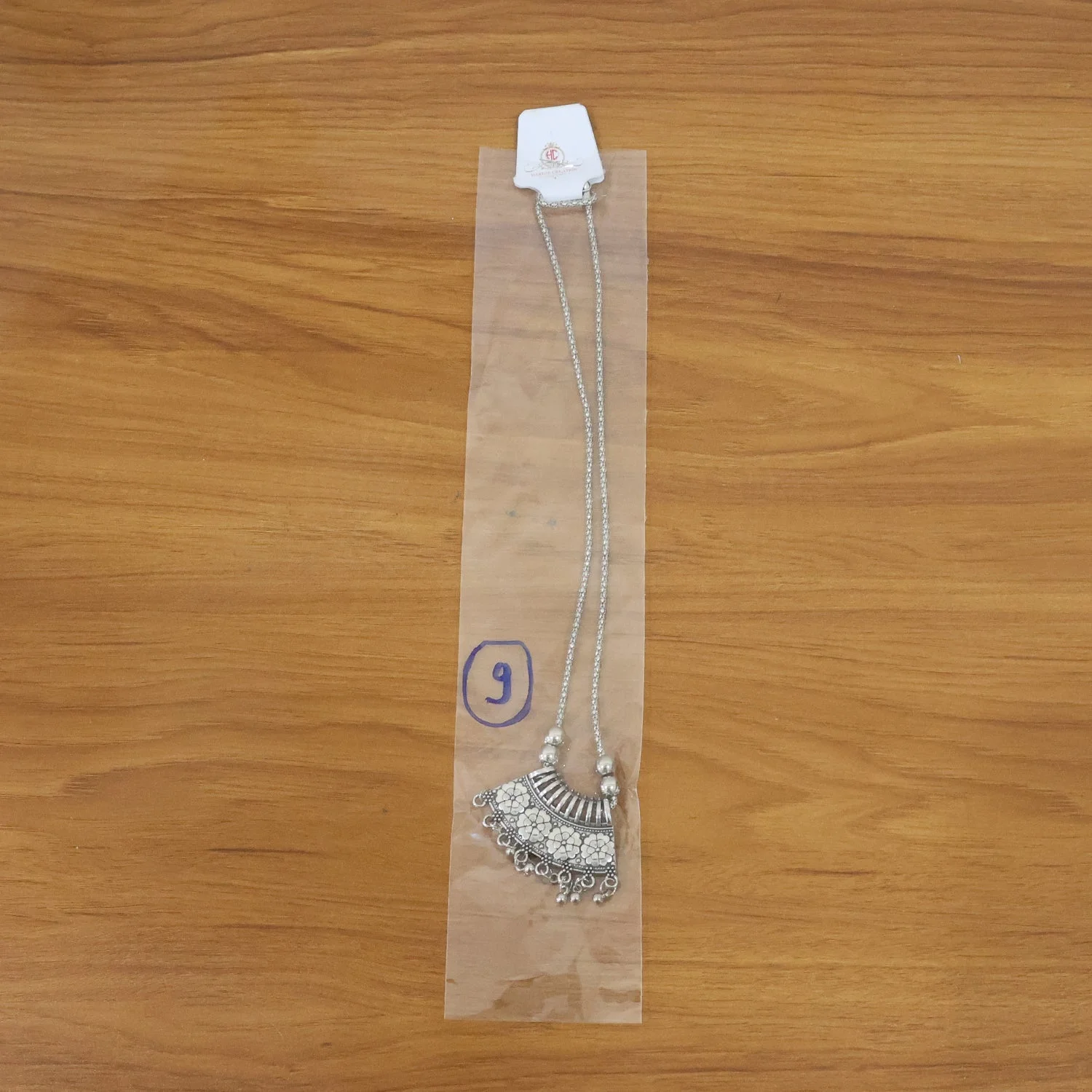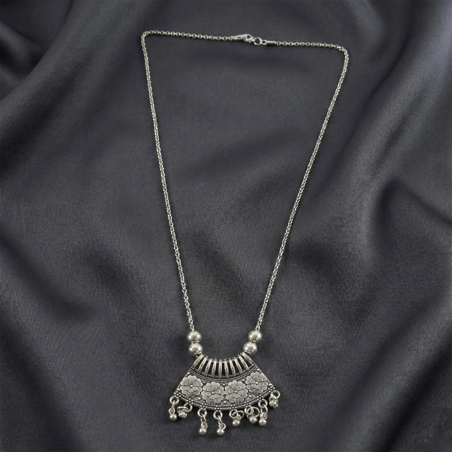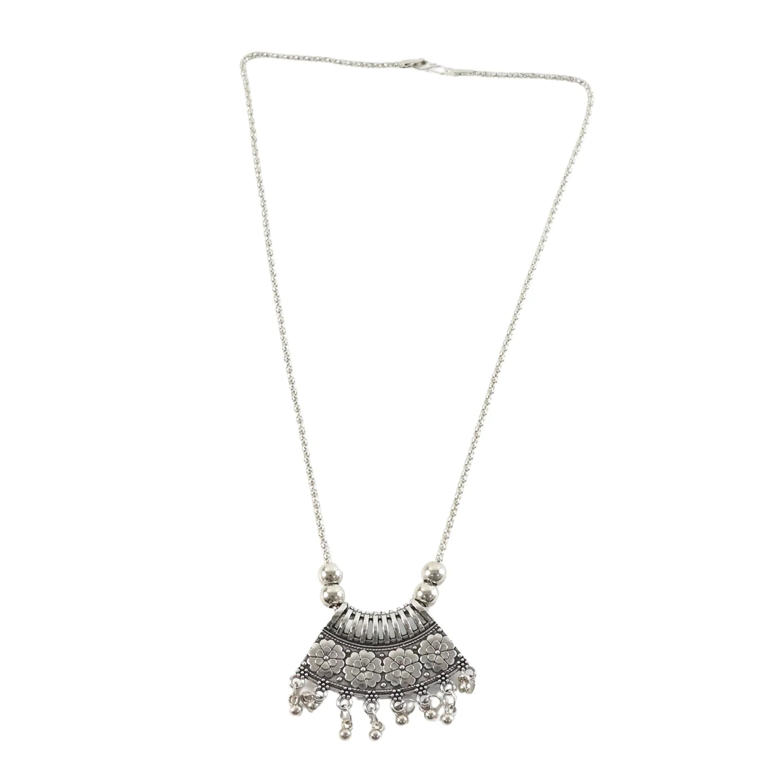 This beautifully crafted oxidised silver finish necklace features an elegant chandelier-style pendant adorned with detailed floral motifs and delicate dangling bead accents. The curved pendant design is complemented by a linked metal chain with spherical bead highlights, giving the necklace a rich handcrafted appearance inspired by traditional ethnic jewellery. Designed to sit gracefully on the neckline, it adds character and depth to both festive and everyday outfits. The antique-style finish enhances its timeless appeal, making it a versatile accessory for ethnic wear lovers who appreciate intricate detailing and classic aesthetics.