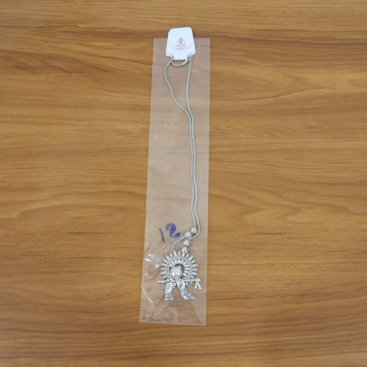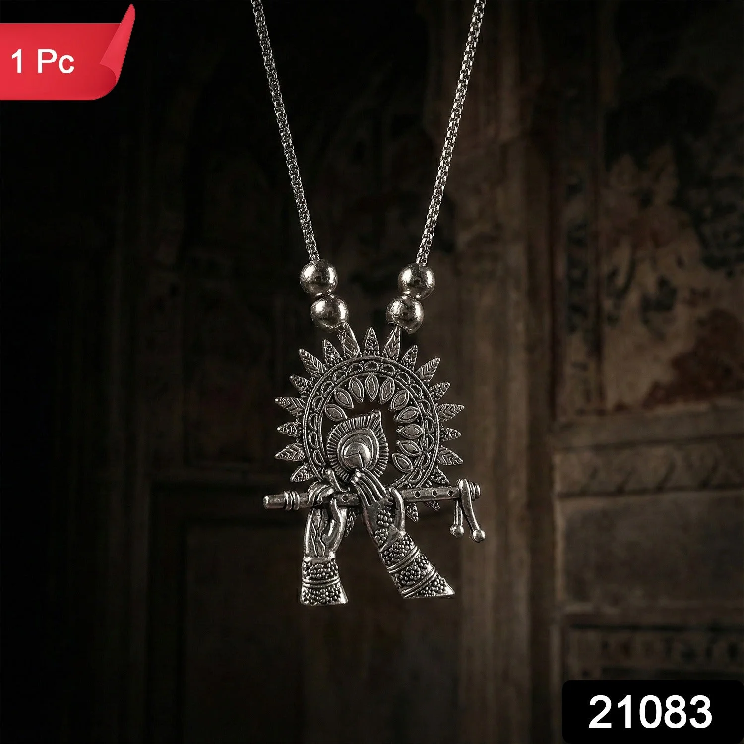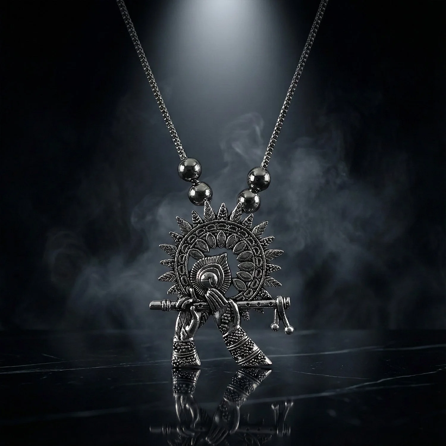 This striking oxidised silver finish necklace features an intricately crafted pendant inspired by Lord Krishna playing the flute, symbolizing divine love, harmony, and spirituality. The pendant is designed with a detailed sunburst halo backdrop, enhancing its sacred and artistic appeal. Fine handcrafted elements, including textured detailing and subtle dangling accents, give the necklace a rich antique character. Paired with a sturdy linked chain and decorative metal beads, this necklace beautifully complements traditional attire while making a meaningful style statement rooted in Indian heritage.