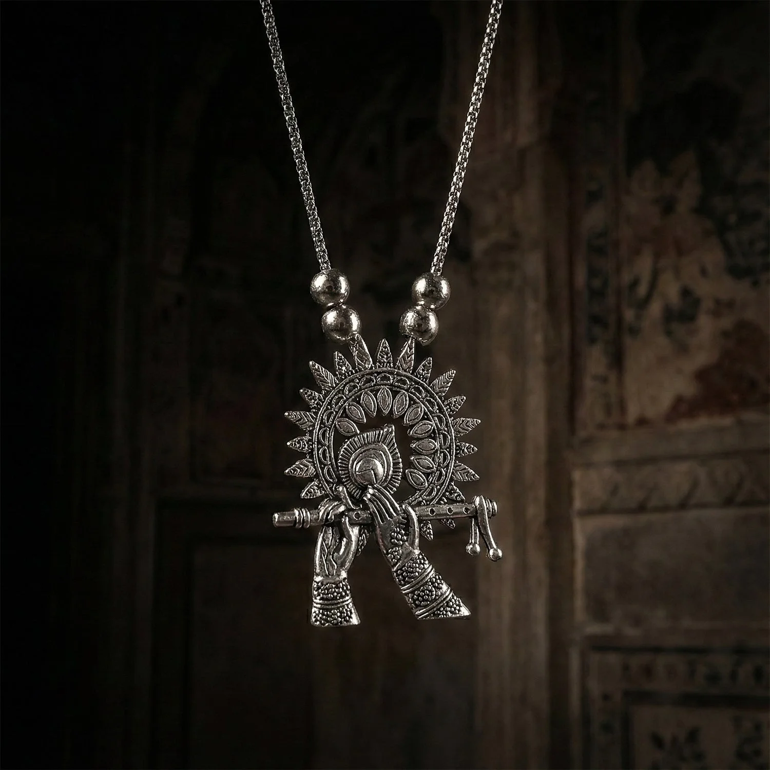 oxidised silver krishna flute pendant necklace, krishna bansuri pendant necklace, lord krishna jewellery necklace, oxidised silver finish necklace, spiritual pendant necklace, ethnic krishna jewellery, traditional indian necklace, sunburst halo pendant necklace, flute motif pendant, handcrafted dangling pendant necklace, oxidised silver ethnic jewellery
