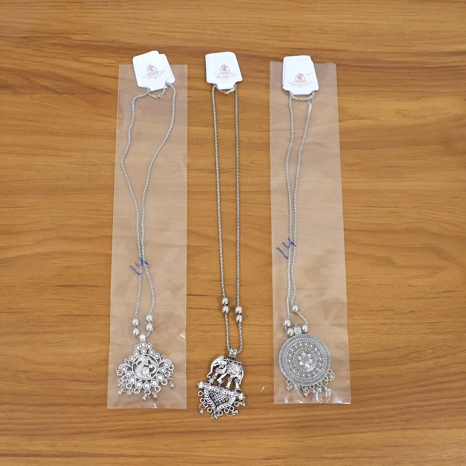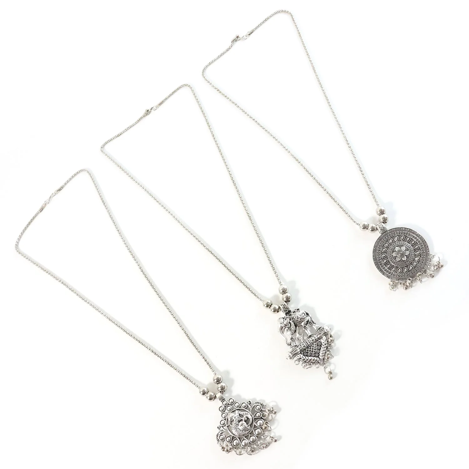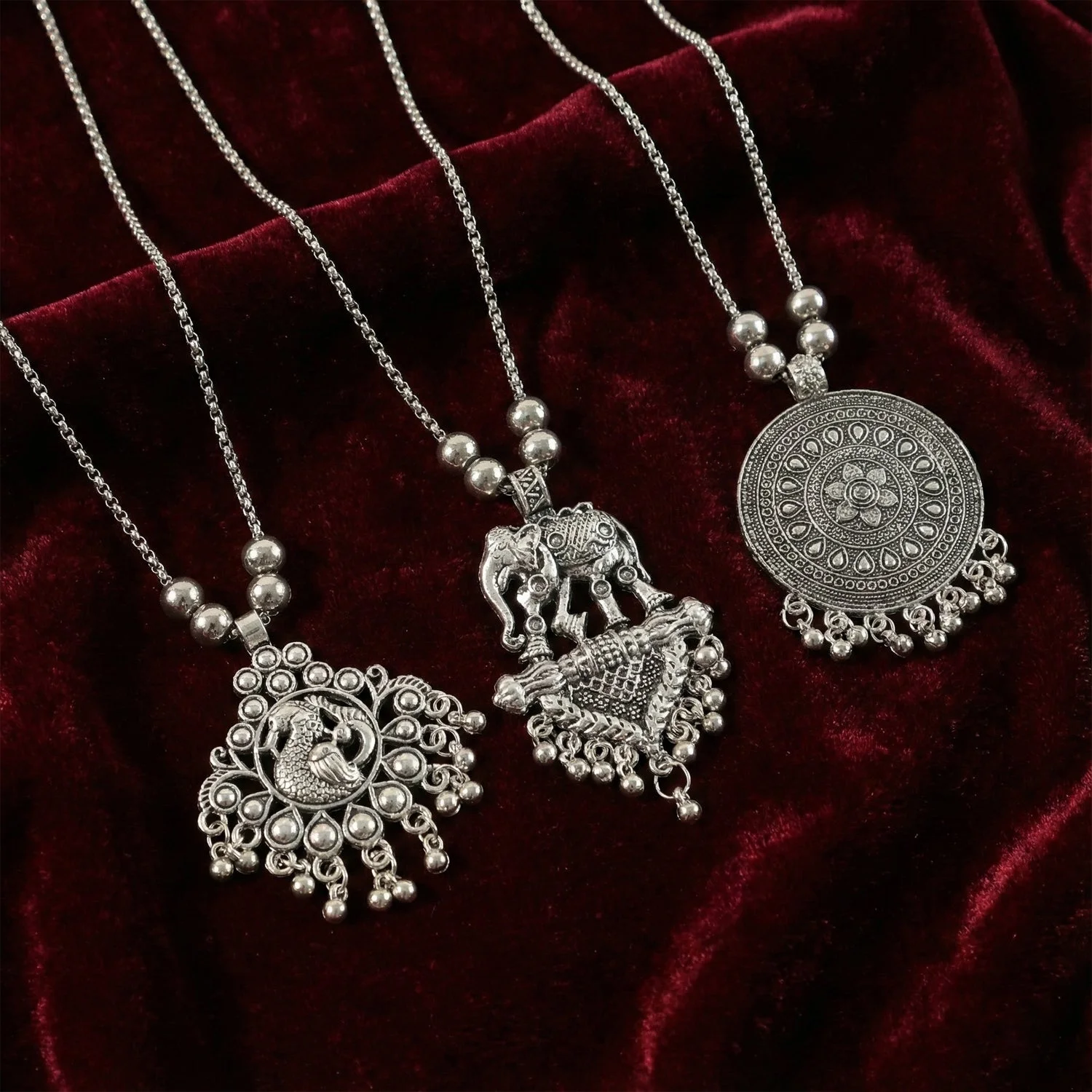 Oxidised Silver Finish Traditional Pendant Necklace – Mix Design Assorted Ethnic Motifs Including Peacock, Elephant & Mandala Pattern for Women (1 Pc)