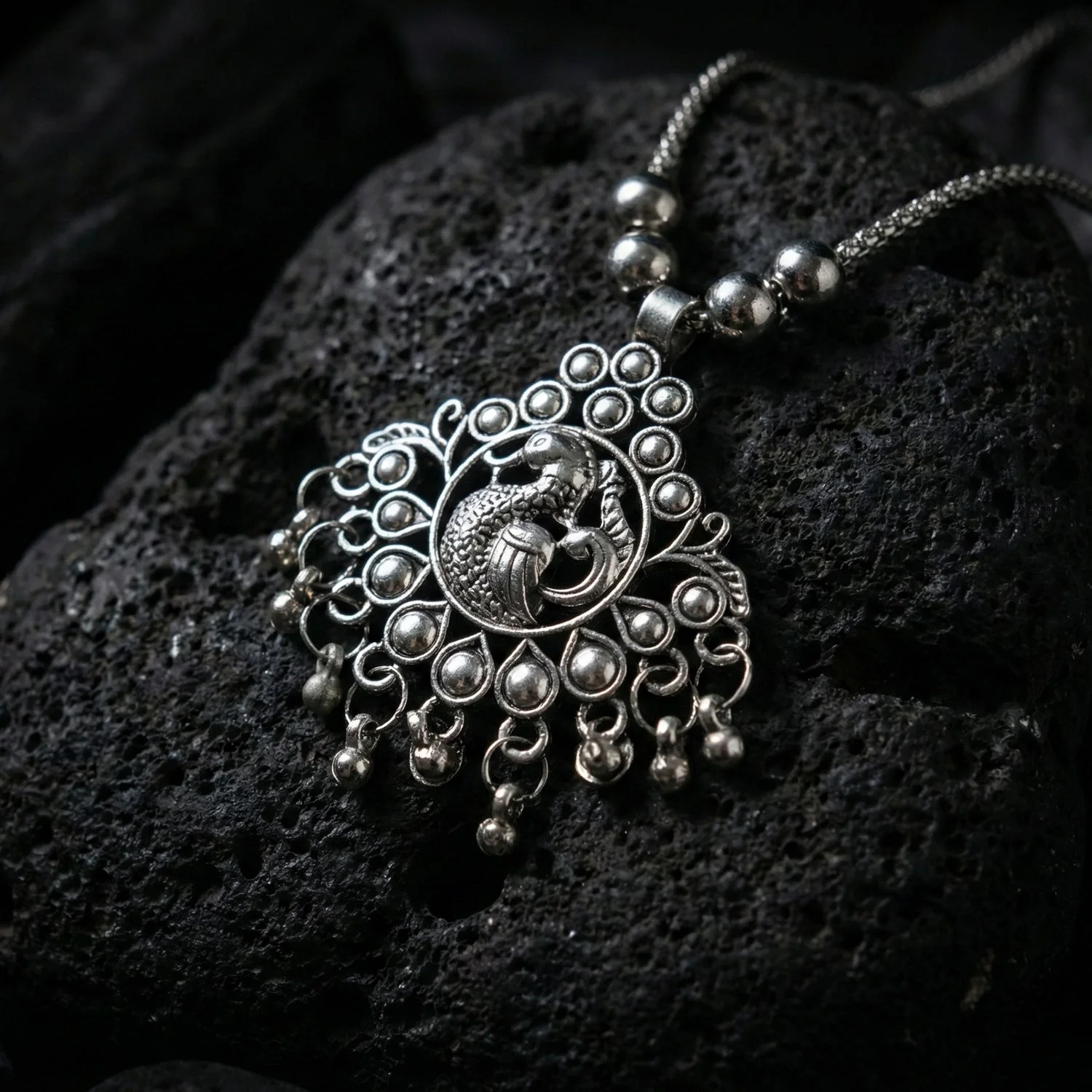 oxidised silver pendant necklace, traditional pendant necklace, ethnic design necklace, peacock motif necklace, elephant motif pendant, mandala pattern necklace, women’s oxidised silver jewelry, boho style necklace, ethnic fashion jewelry, silver finish necklace, handcrafted pendant necklace