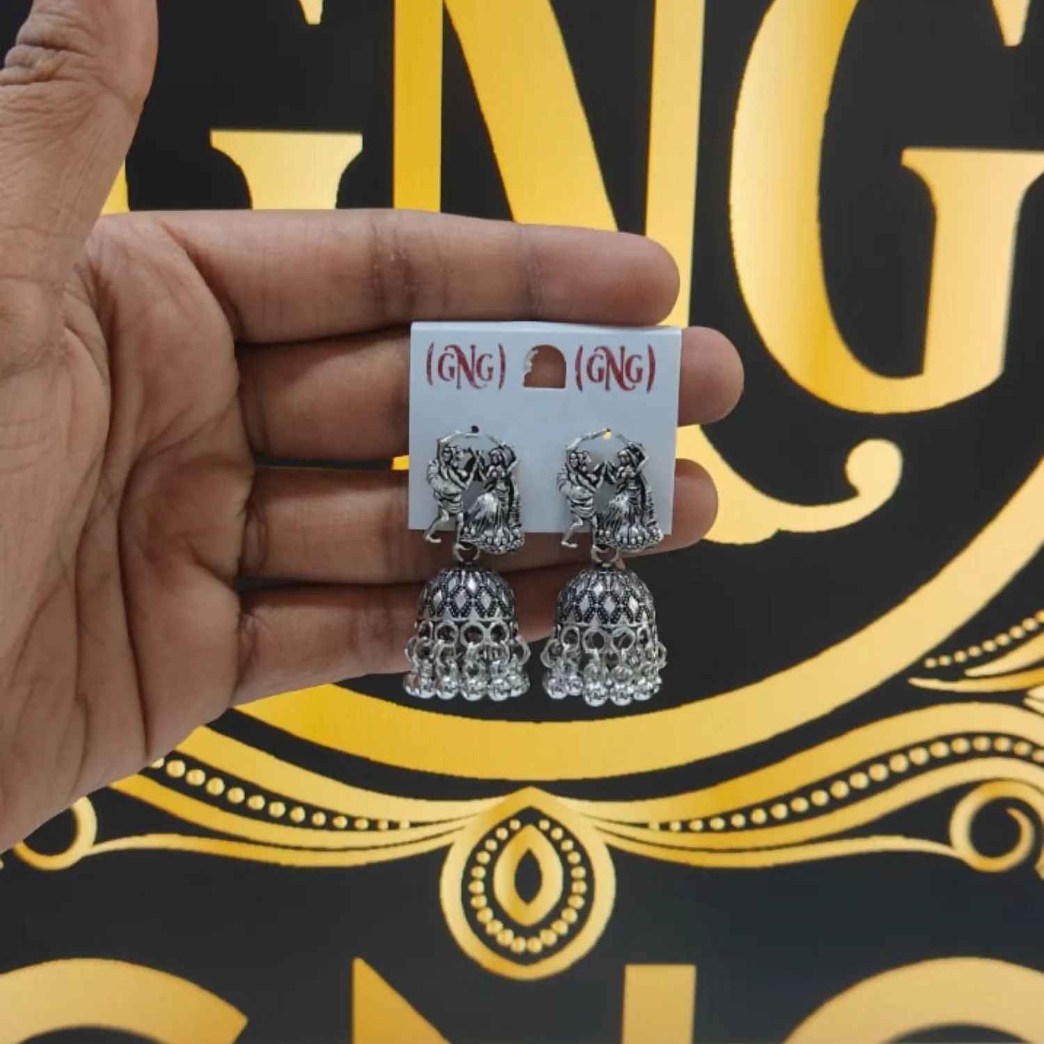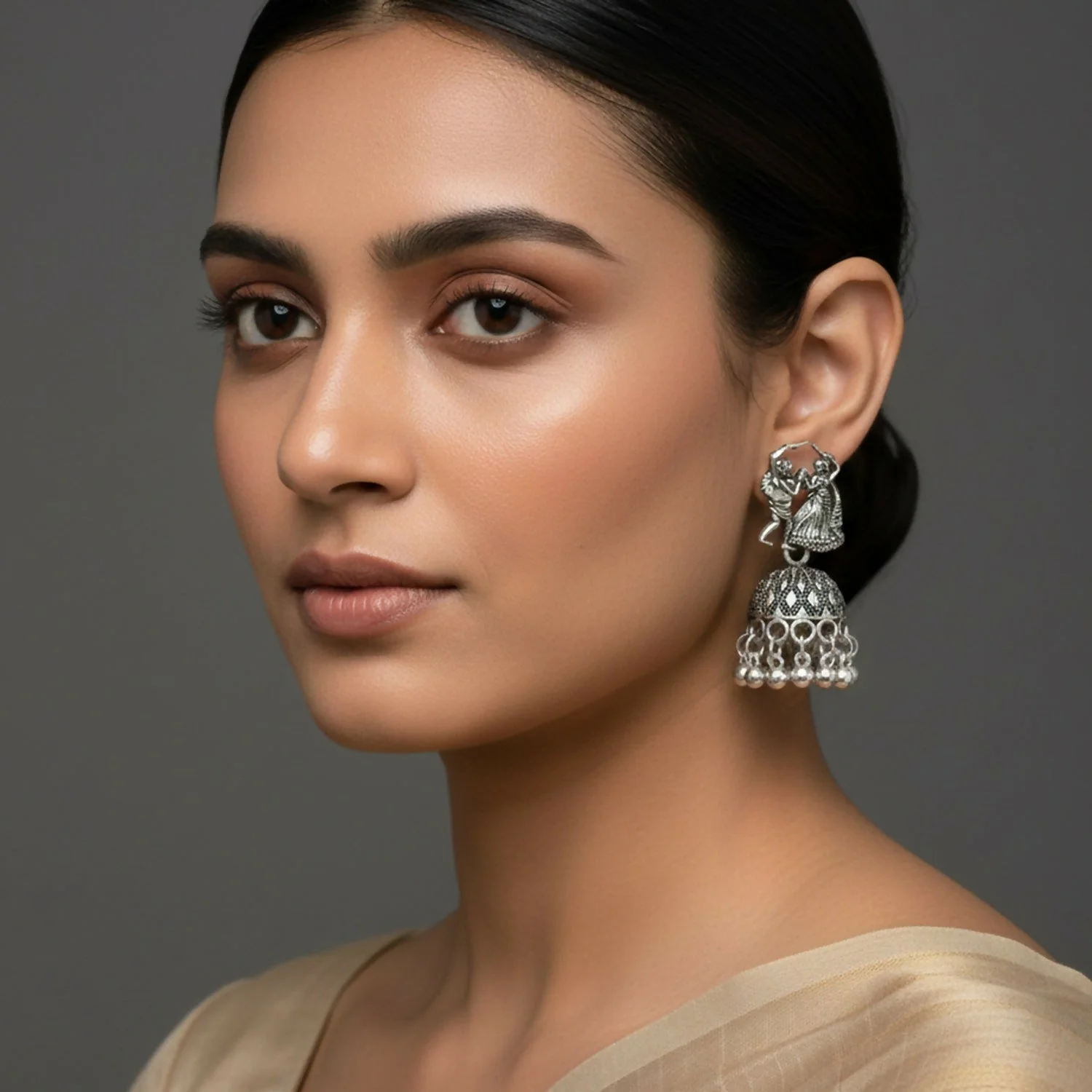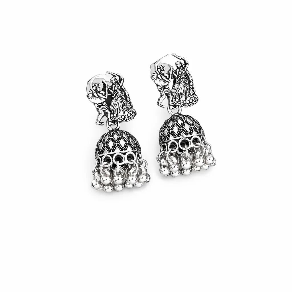 Beautiful oxidised silver jhumka earrings featuring a traditional dancing couple (folk / garba style) motif with detailed antique finishing. The dome-shaped jhumka with ghungroo hanging adds a graceful ethnic charm. Lightweight, comfortable and perfect to enhance traditional looks.