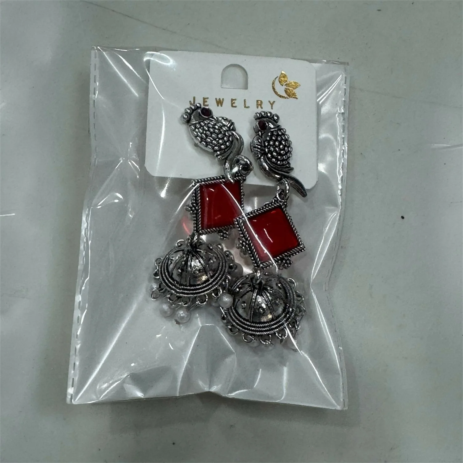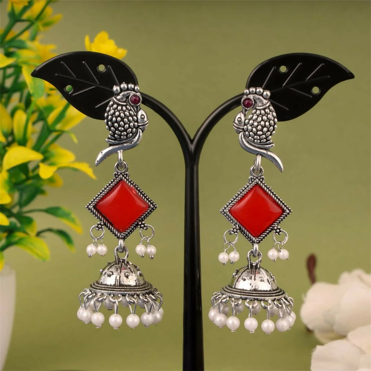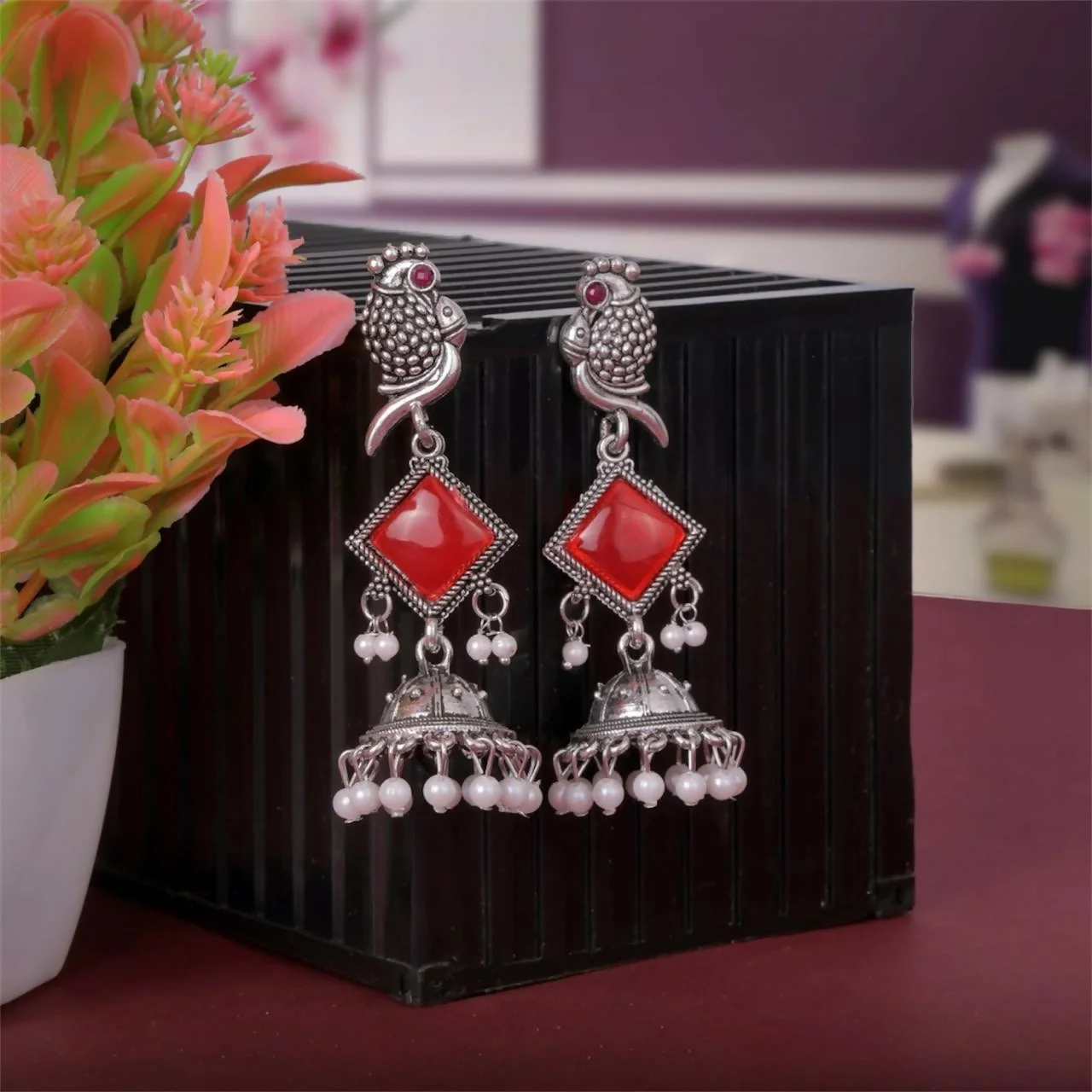 These stunning oxidised silver jhumka earrings feature a unique parrot-shaped top, a vibrant red square stone, and beautifully crafted pearl beaded jhumkas. Designed to enhance your ethnic and festive looks, these earrings are lightweight, comfortable, and perfect for daily wear, traditional functions, weddings, parties, and gifting.Red stone earrings, oxidised jhumka, parrot design earrings, traditional earrings for women, oxidised silver jewellery, ethnic jhumki, party wear jhumka, oxidised earrings for girls, pearl dangler earrings.
