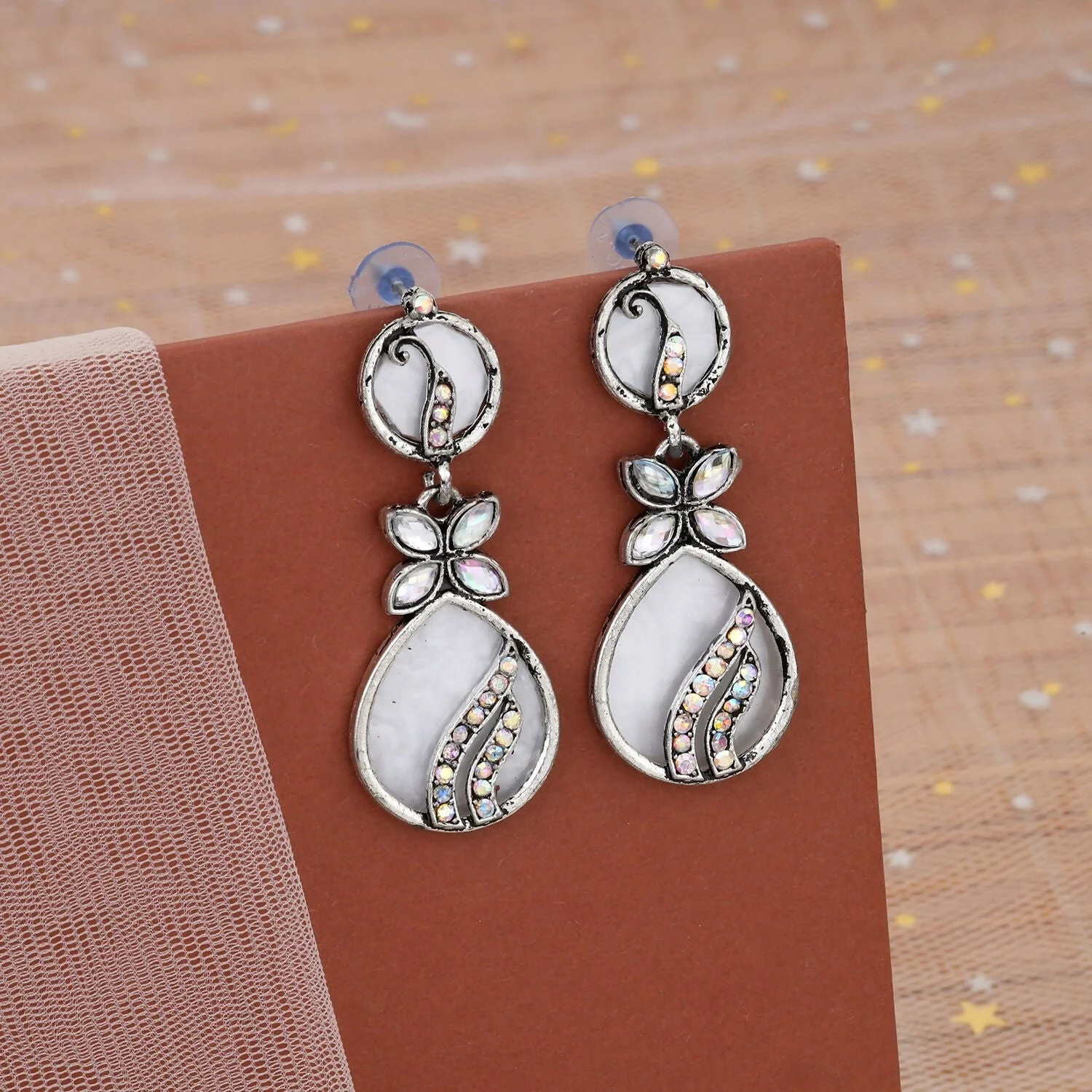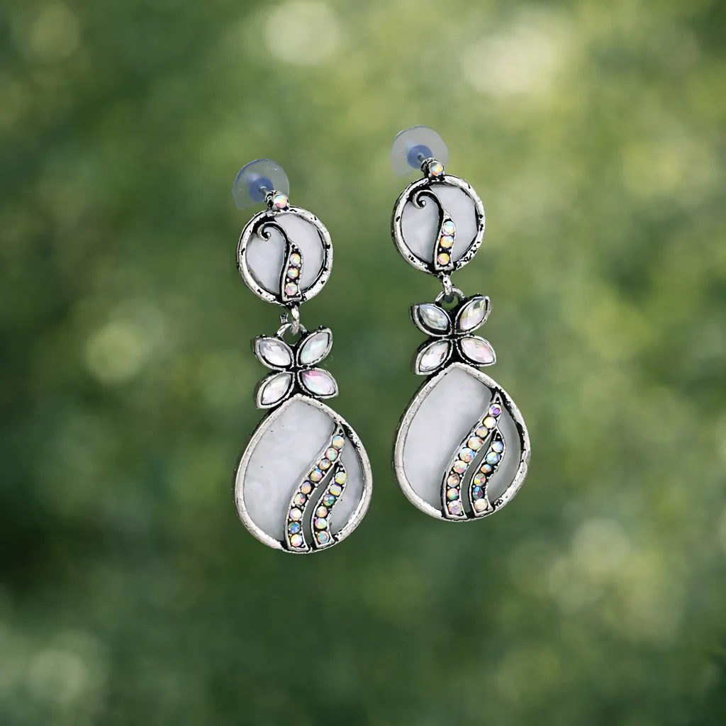 Enhance your elegance with these stunning oxidised silver-tone earrings featuring a graceful white stone base and sparkling crystal detailing. The floral connector and soft drop design give a classy yet traditional look, perfect for modern ethnic styling.