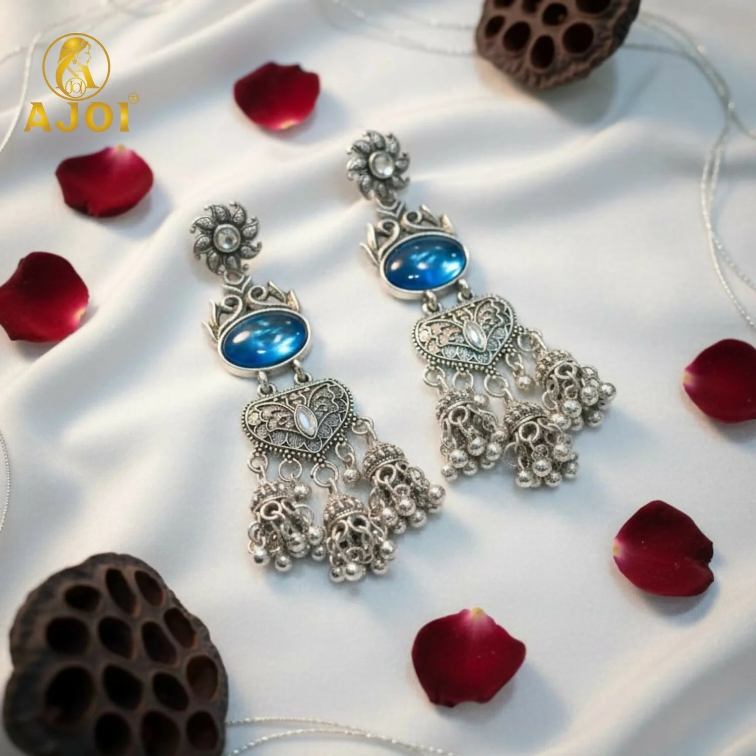 Bring timeless elegance to your ethnic jewelry collection with Oxidized Silver Turquoise Jhumka Earrings, a perfect blend of traditional artistry and contemporary charm. These beautifully handcrafted earrings feature an intricate floral stud at the top, followed by a striking turquoise-colored stone centerpiece that adds a vibrant pop of color.