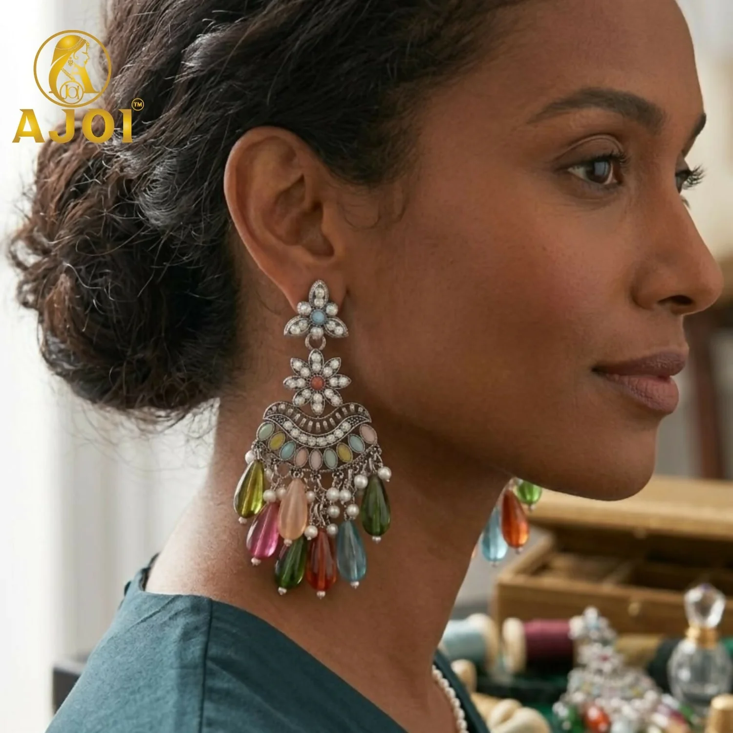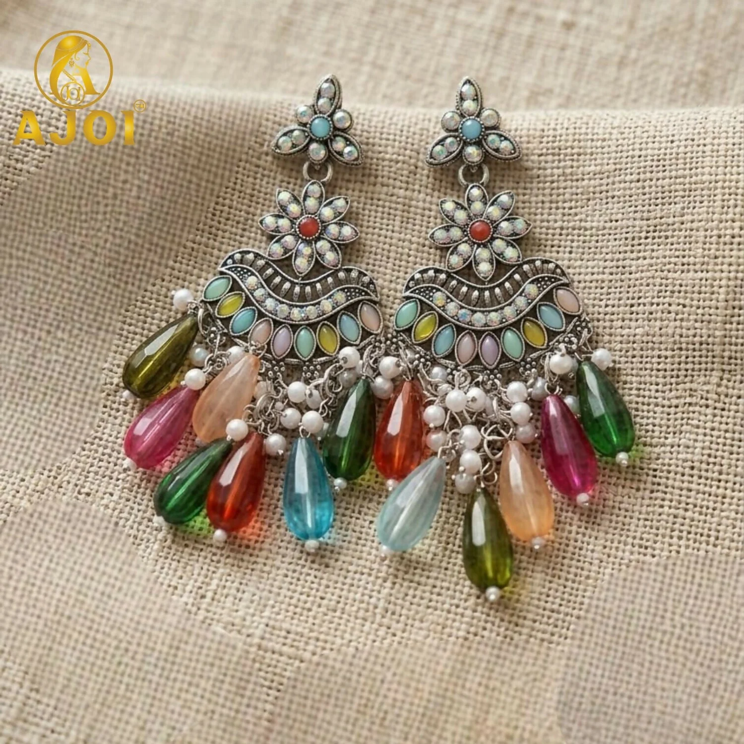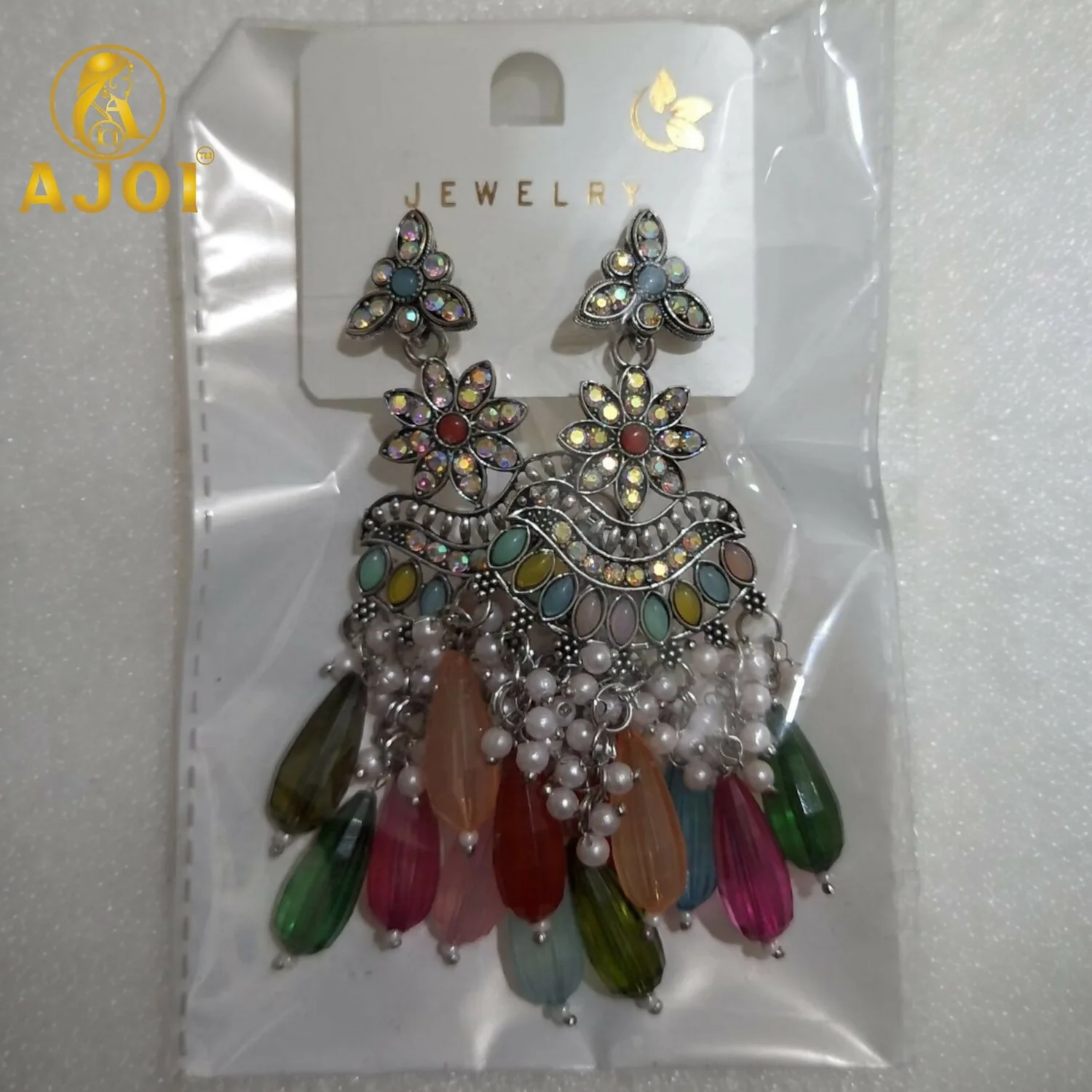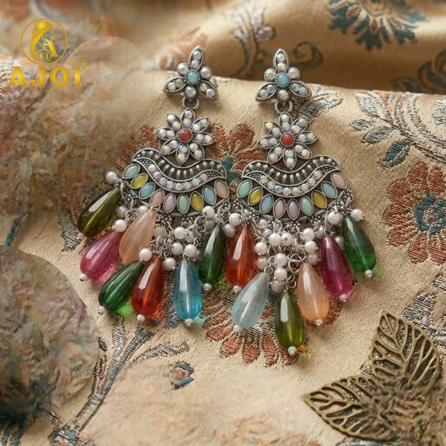 Be the first to review Oxidized Floral Earrings with Multicolor Drop Beads & Pearl Tassels!