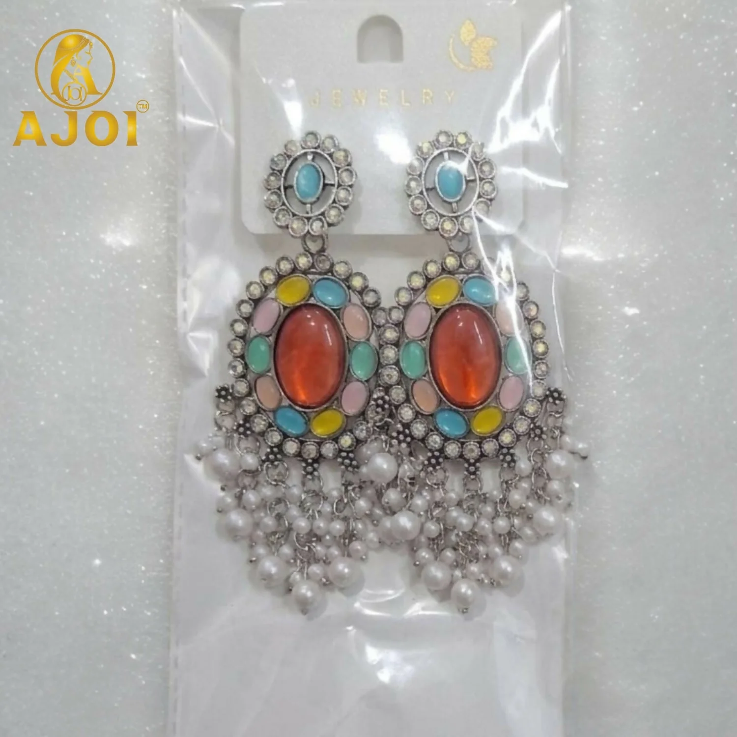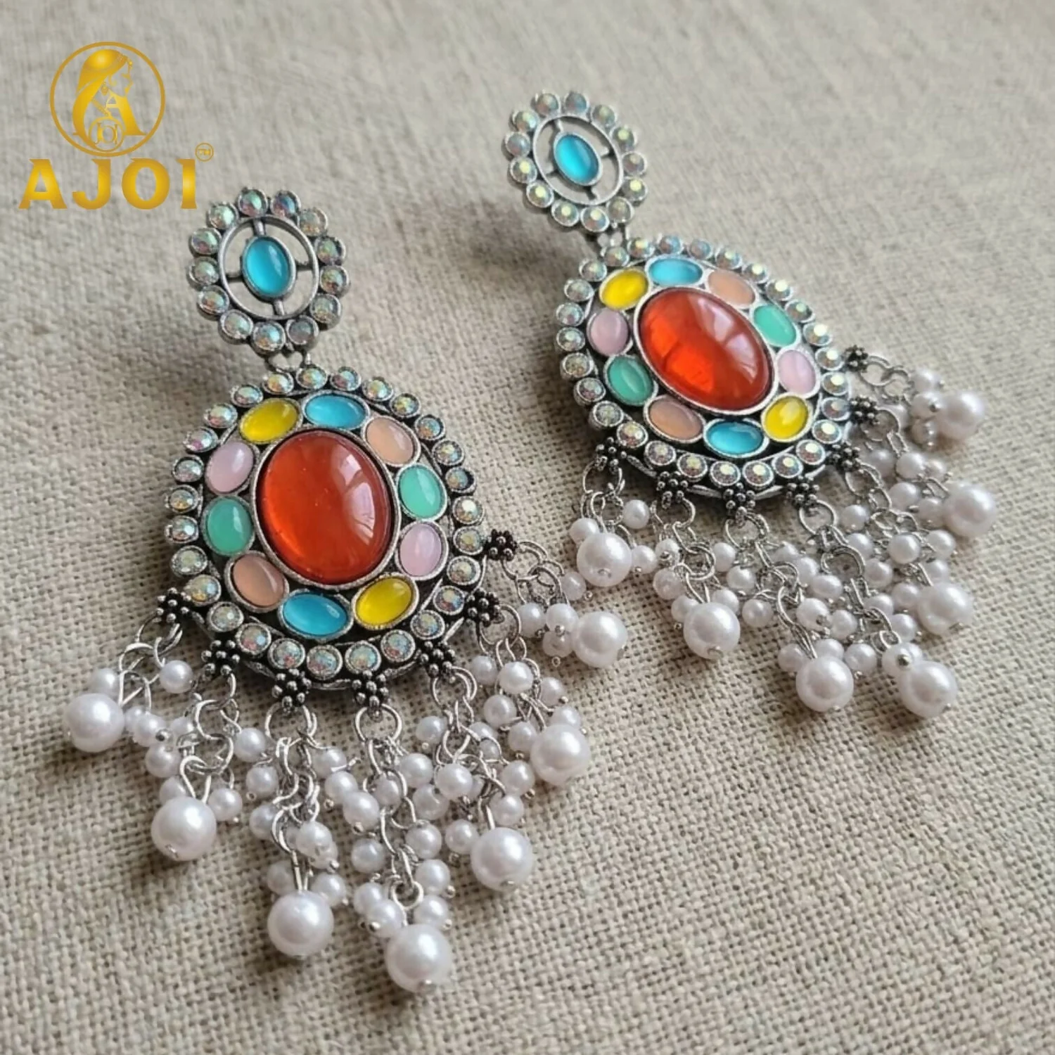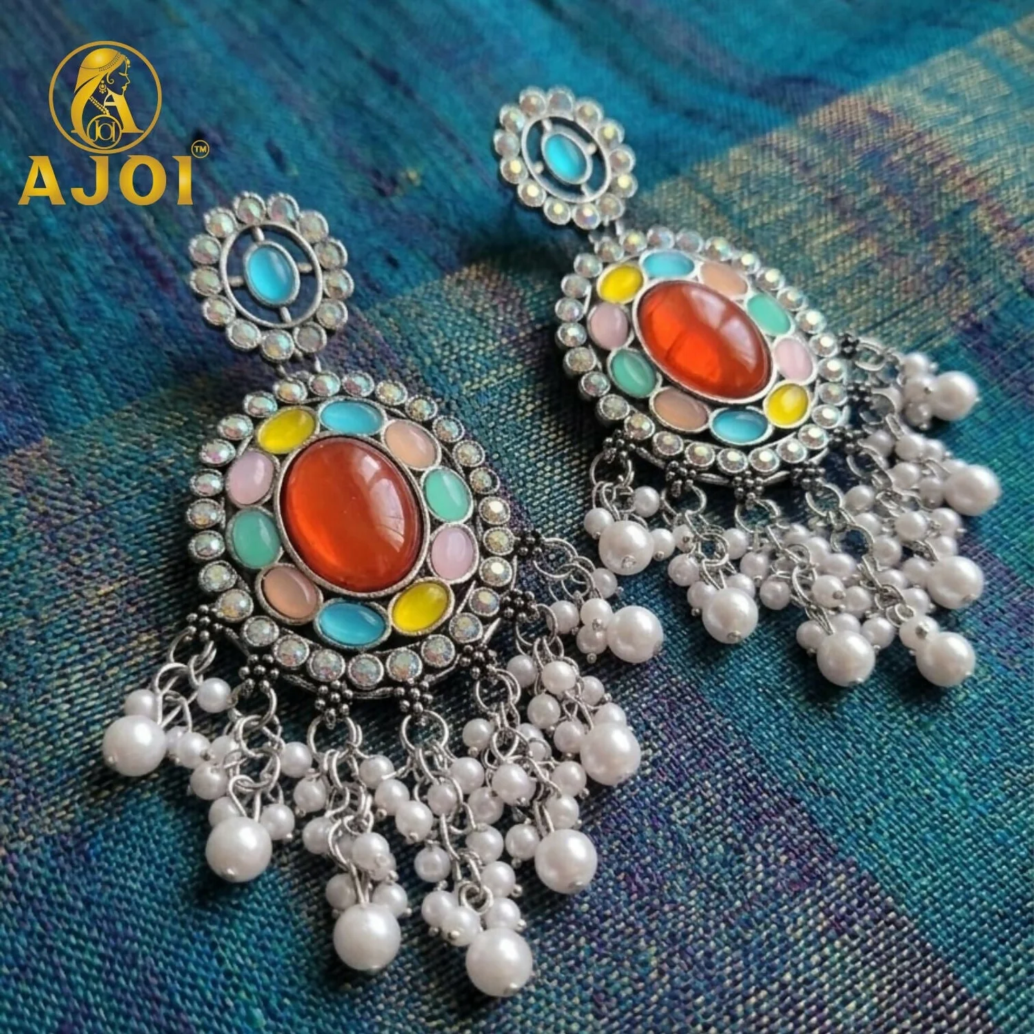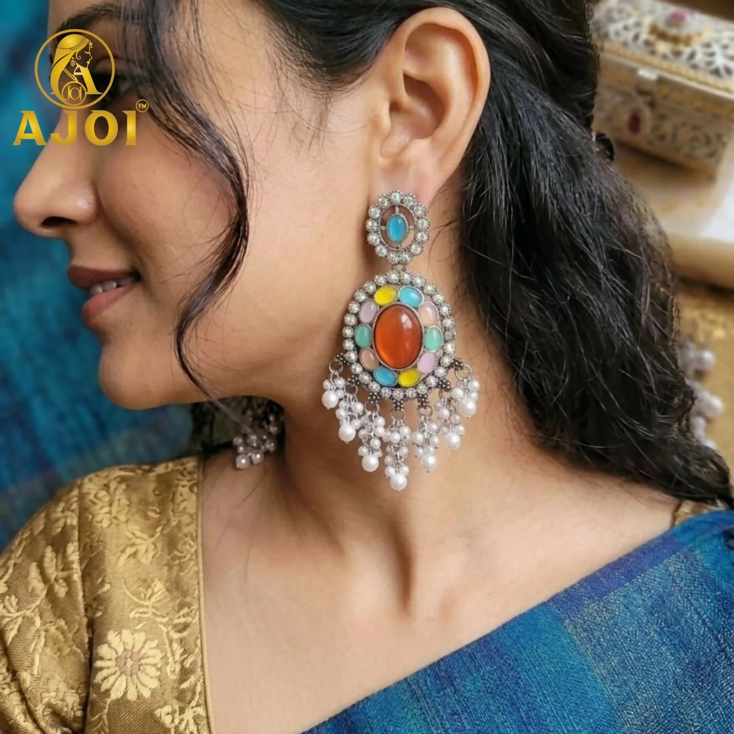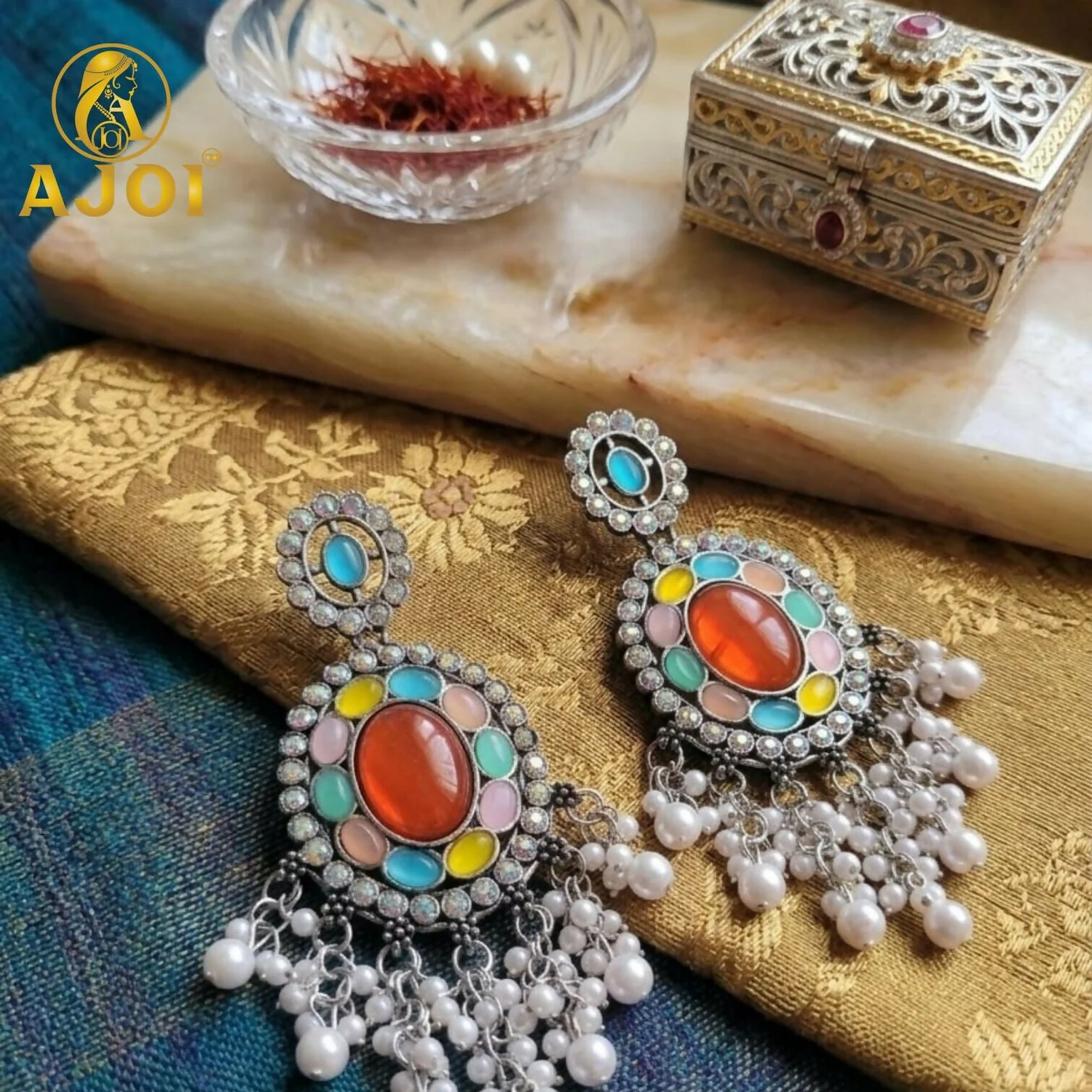 Be the first to review Oxidized Oval Earrings with Multicolor Stones & Pearl Tassel Drops!