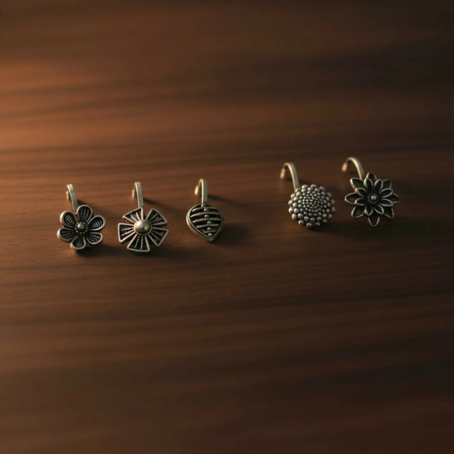 Enhance your traditional beauty with this stylish pack of 5 oxidized silver nose pins, featuring elegant and unique designs inspired by floral, geometric, and textured patterns. Each nose pin is carefully crafted to give a rich antique silver look that perfectly complements ethnic and fusion outfits.