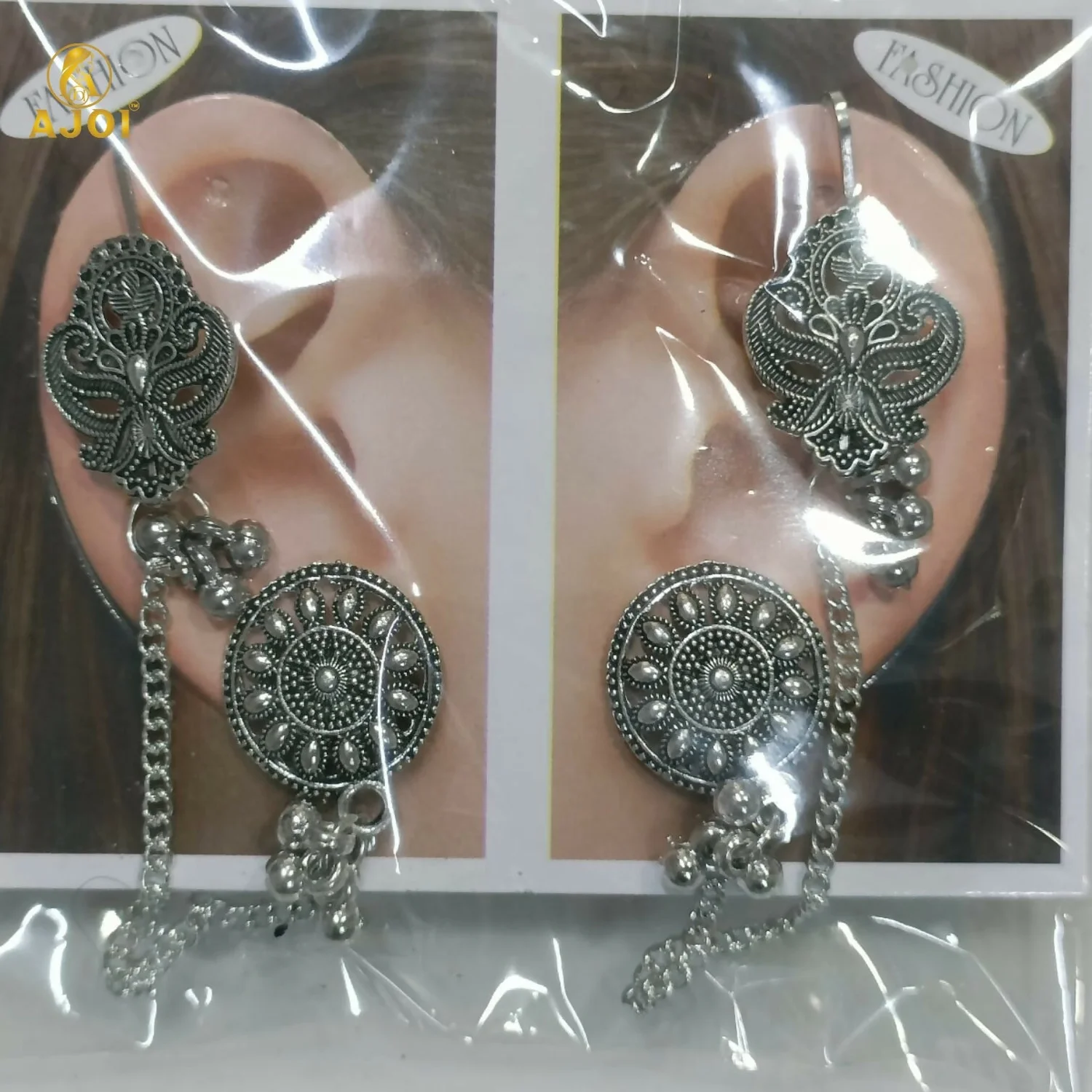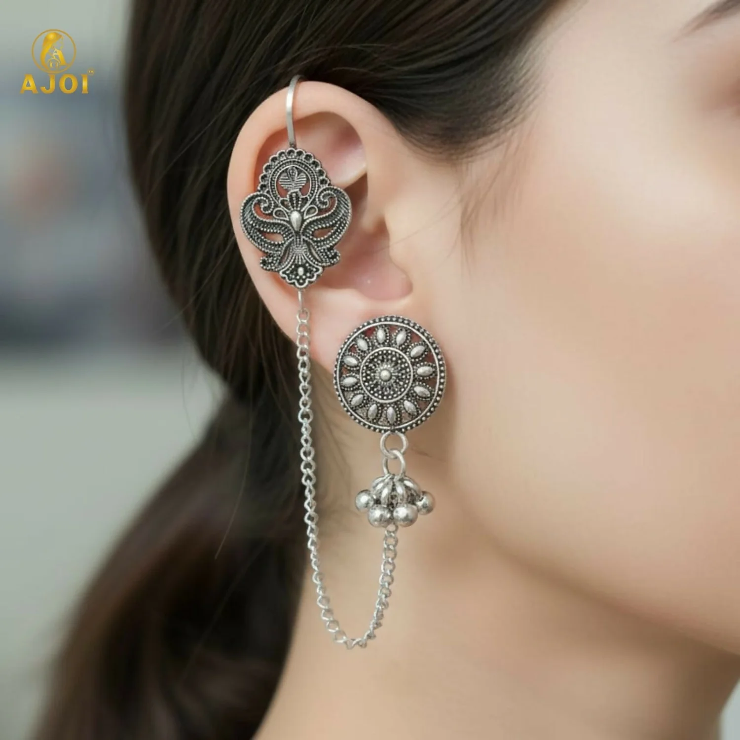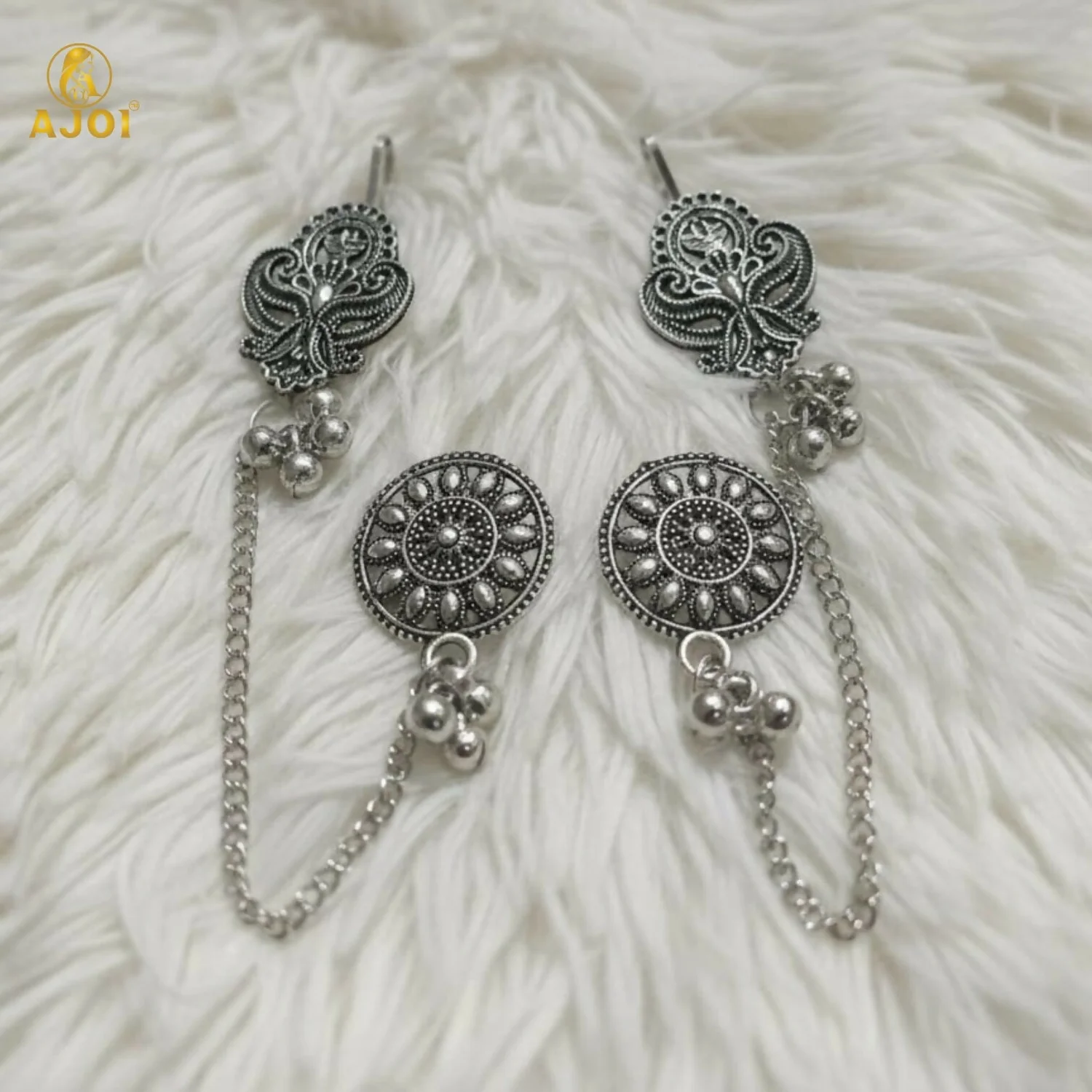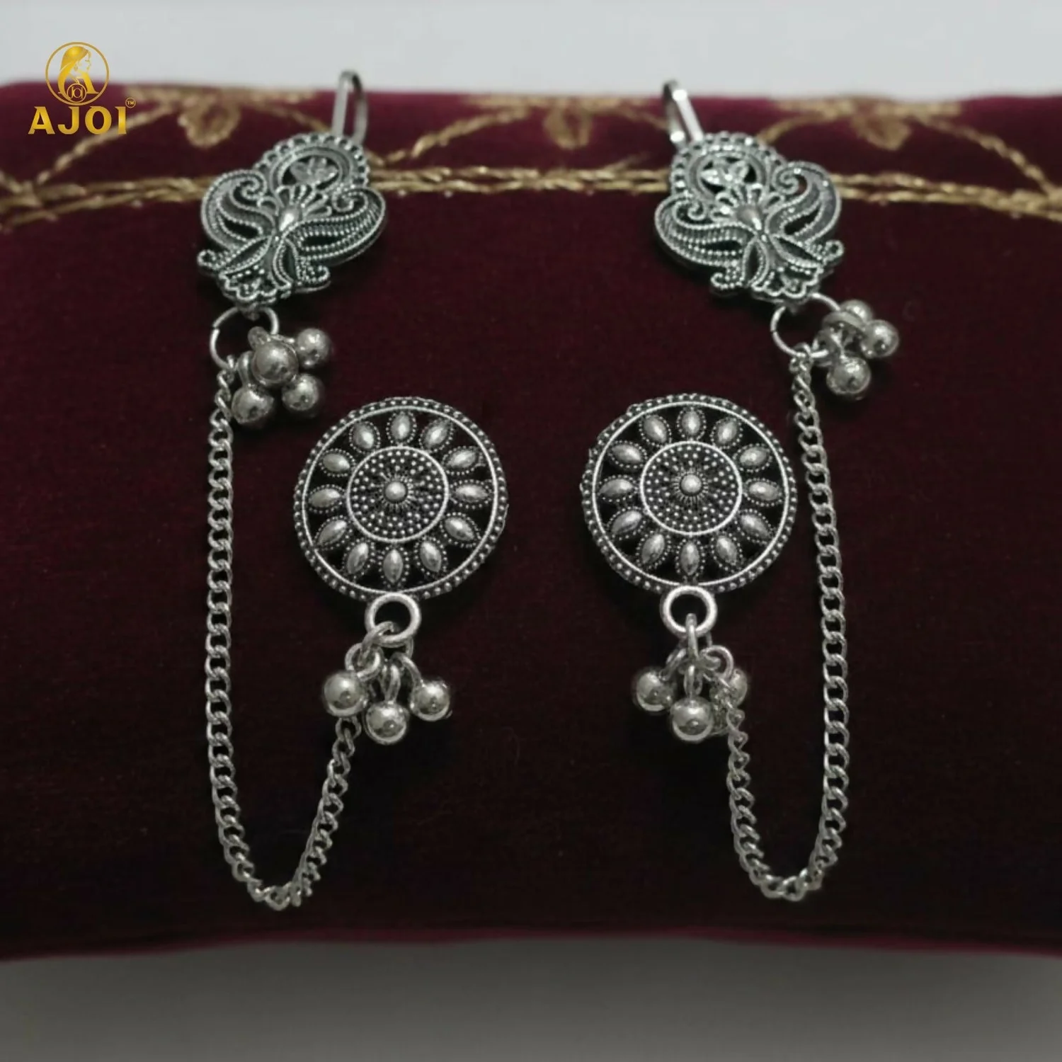 Enhance your ethnic charm with these beautifully crafted Oxidized Silver Chain Drop Earrings. Designed with intricate traditional detailing, these earrings feature a floral mandala motif paired with delicate ghungroo beads and a stylish side chain that adds a unique Indo-tribal touch.