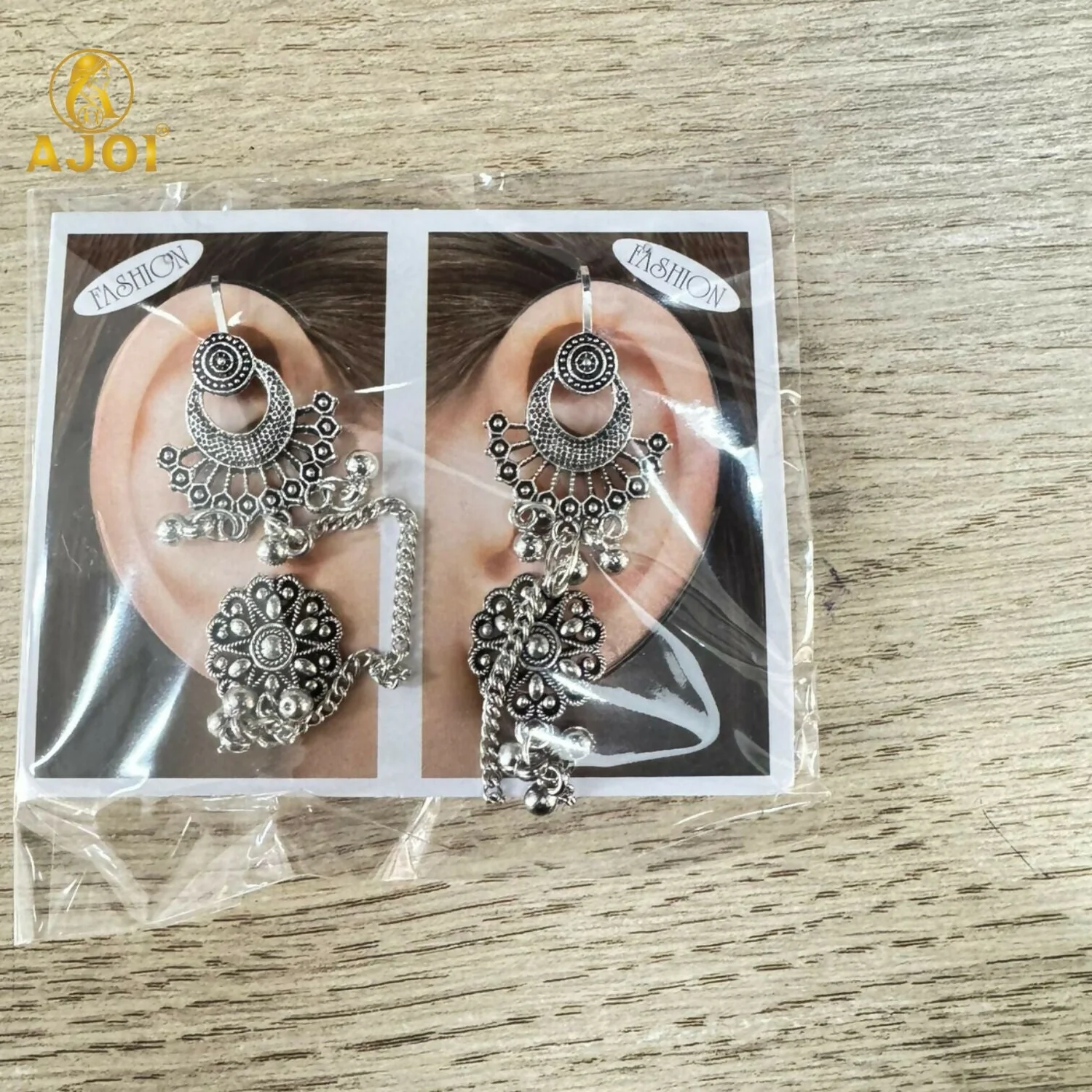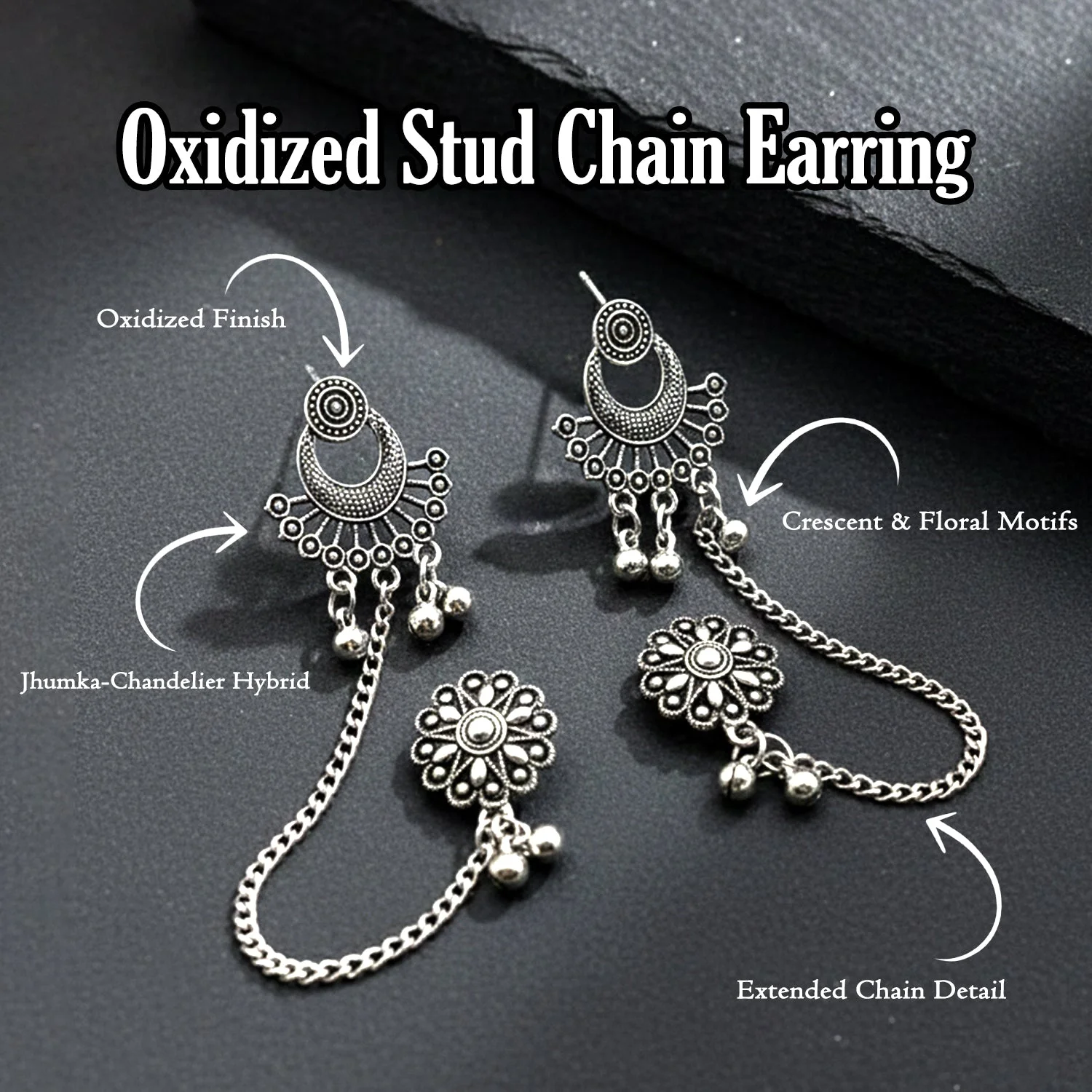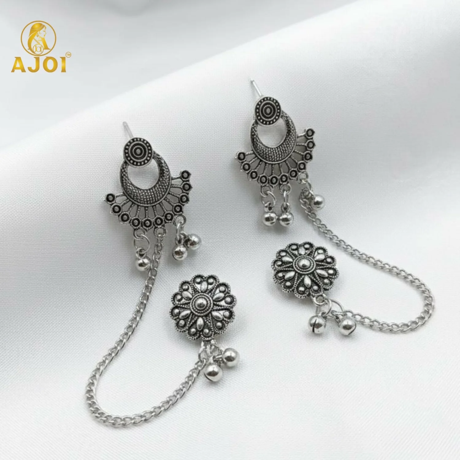 Inspired by traditional Indian tribal and boho jewelry, the earrings showcase fine oxidized detailing, circular motifs, and tiny ghungroo-style beads that add subtle movement and charm. The connecting chain drapes softly along the ear, giving a bold yet sophisticated appearance without the need for extra piercings.