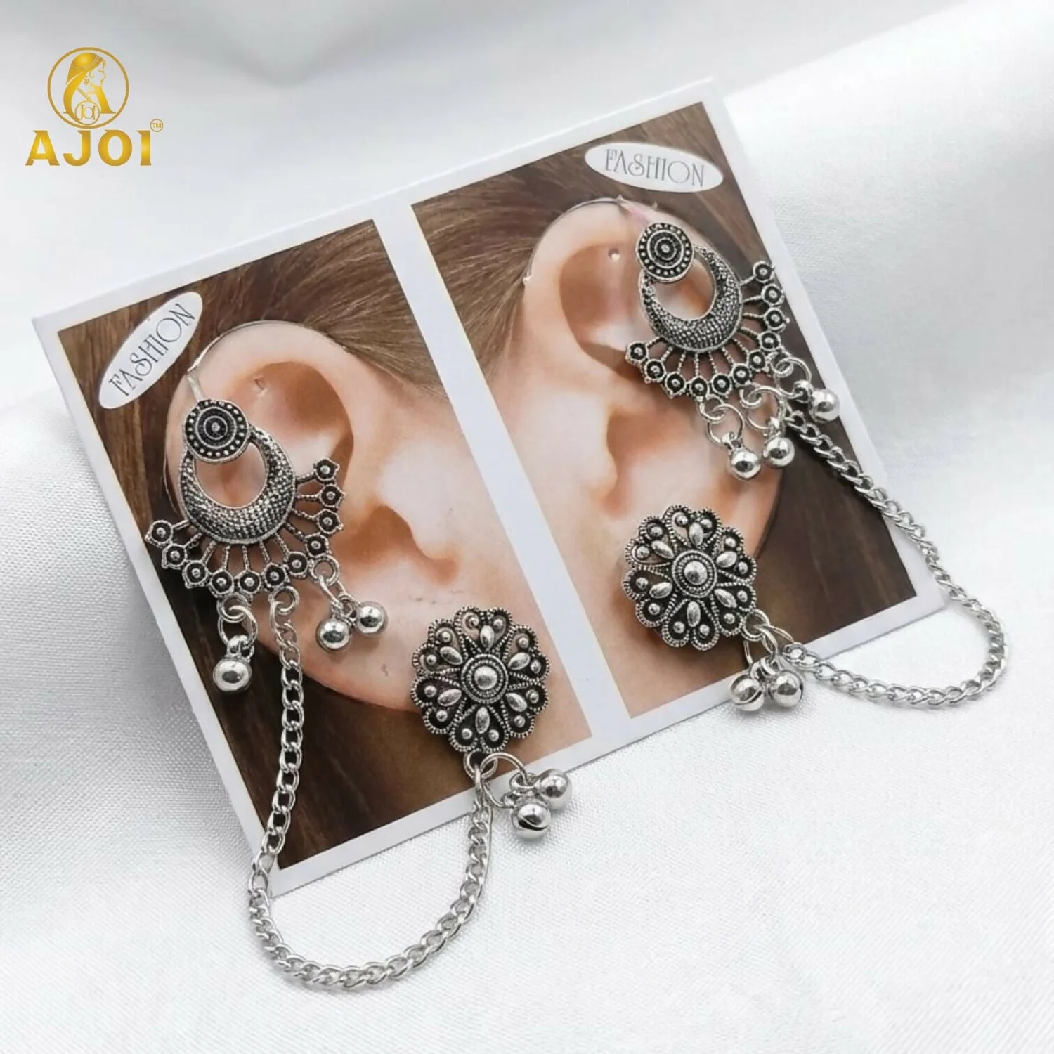 Enhance your ethnic look with these beautifully crafted oxidized silver ear cuff chain earrings, designed to add elegance and tradition to any outfit. This unique pair features intricately detailed stud earrings connected to decorative ear cuffs with delicate chains, creating a graceful and eye-catching style.