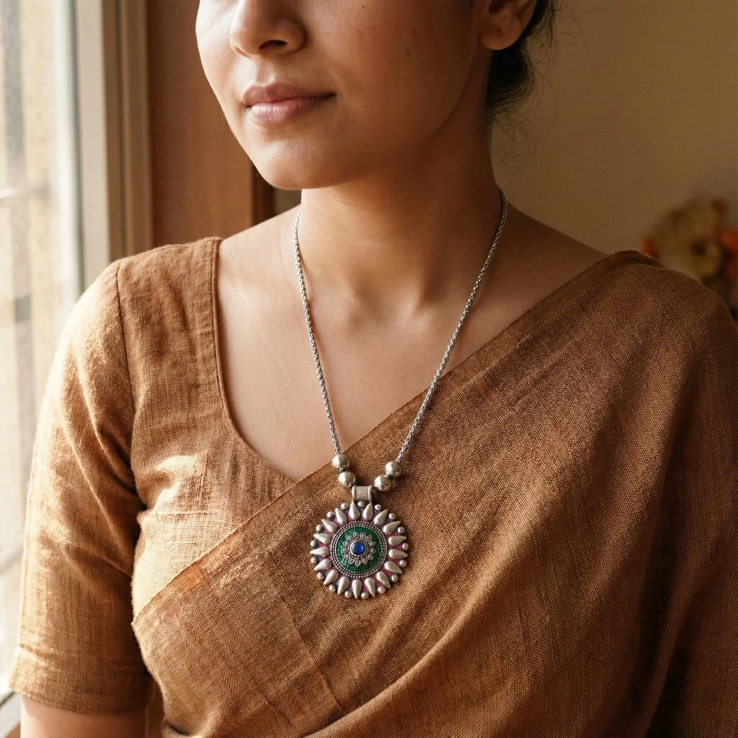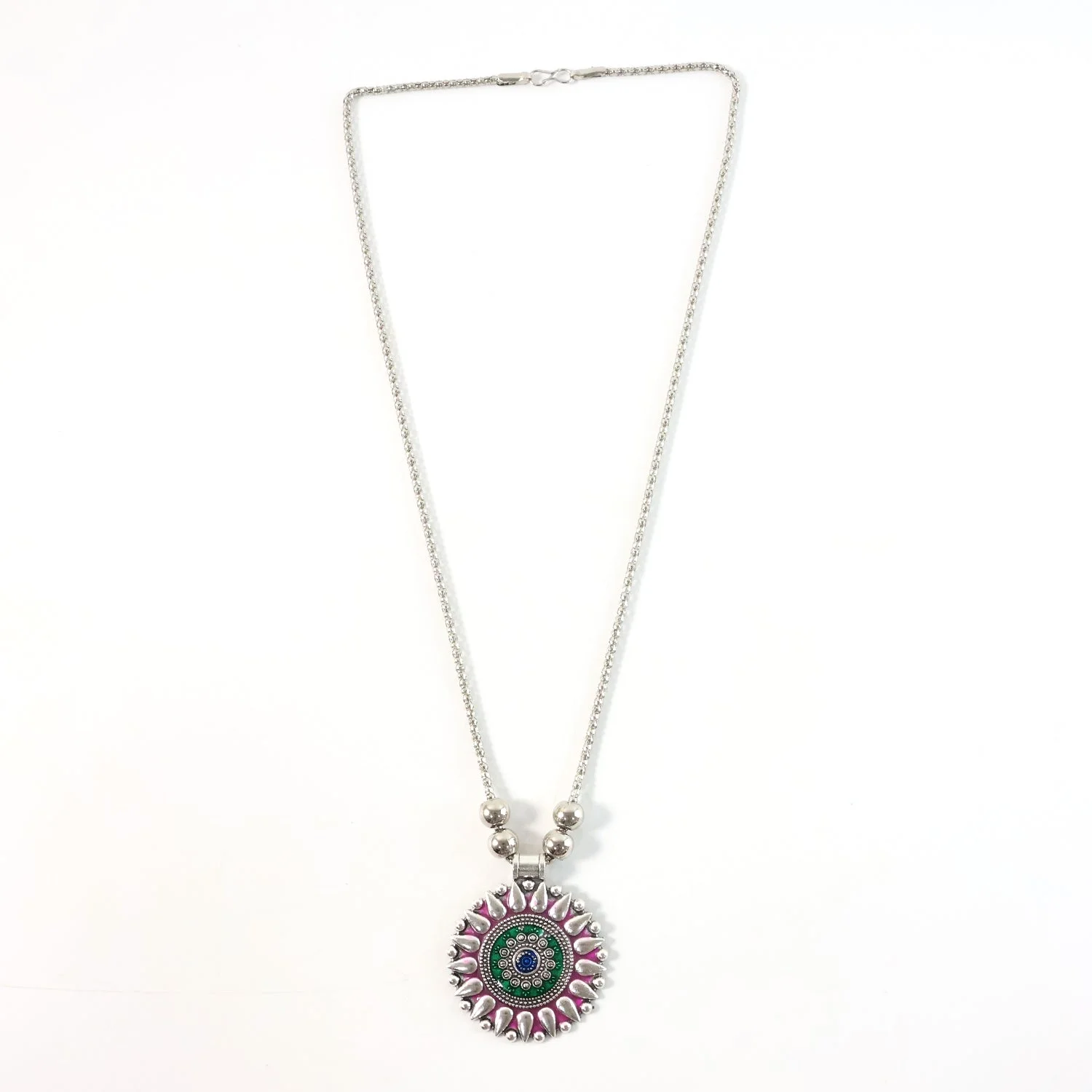 This beautifully crafted oxidized silver finish necklace features a traditional round mandala-style pendant accented with intricate detailing and vibrant enamel highlights. The finely designed pendant is paired with a sleek beaded chain that adds balance and elegance to the overall look. Inspired by classic ethnic jewellery aesthetics, this necklace effortlessly enhances sarees, kurtis, and fusion outfits. Its timeless appeal makes it suitable for everyday wear as well as festive and cultural occasions. A perfect blend of tradition and contemporary styling, this necklace adds grace and character to any jewellery collection.