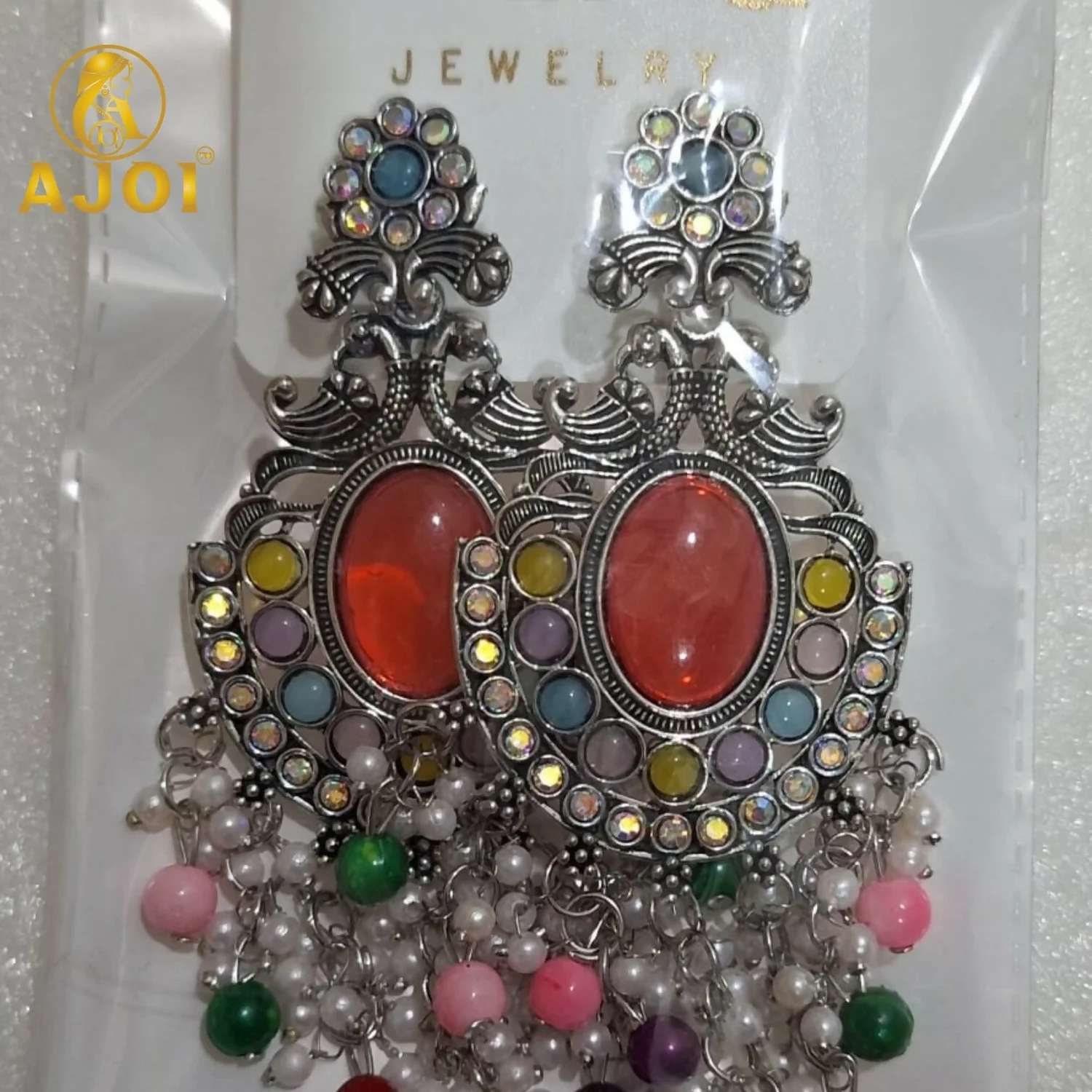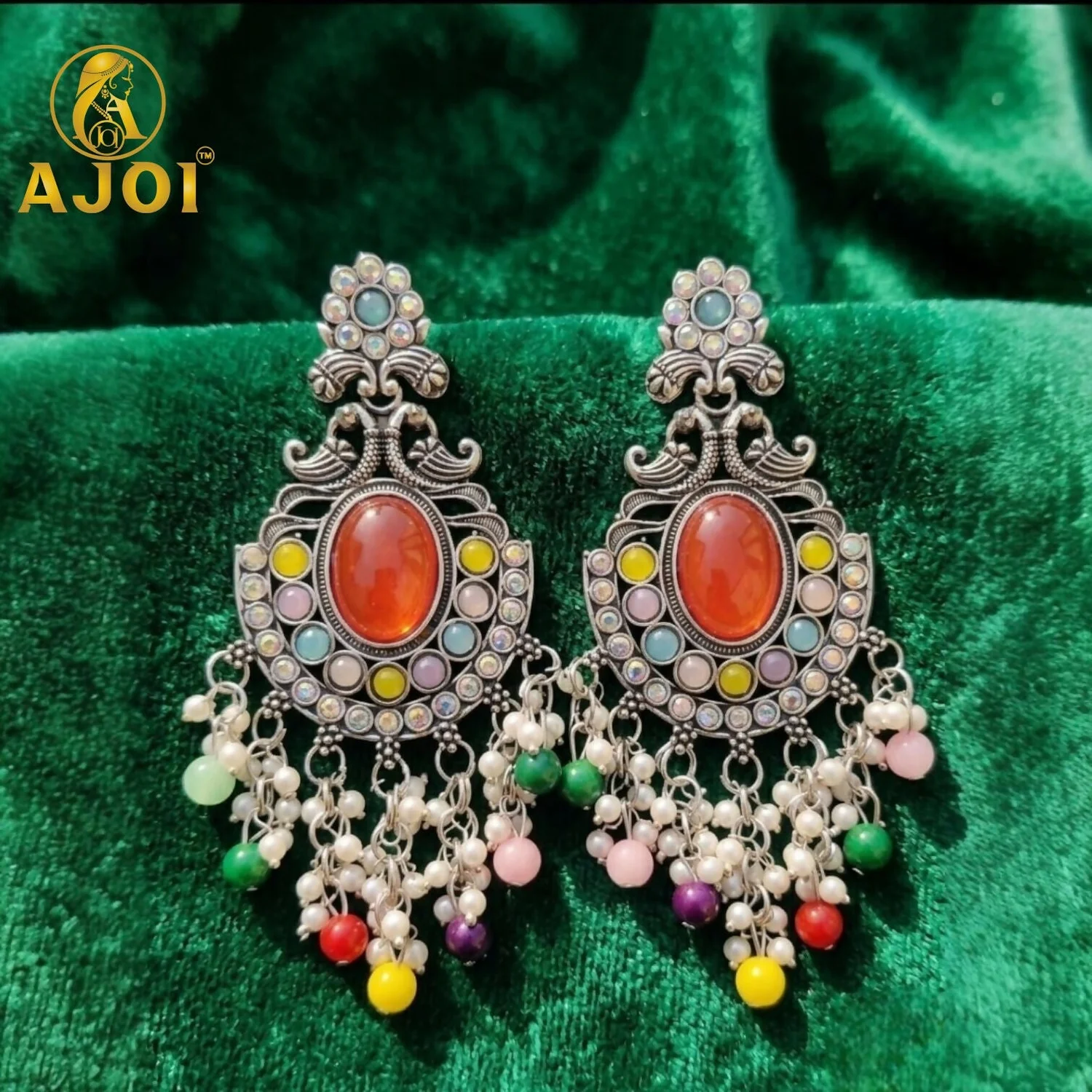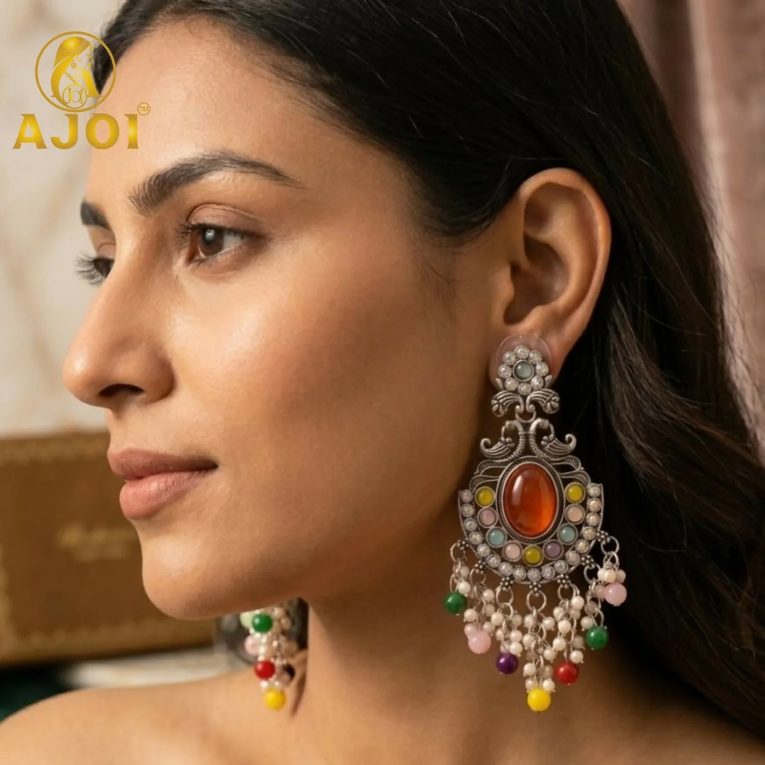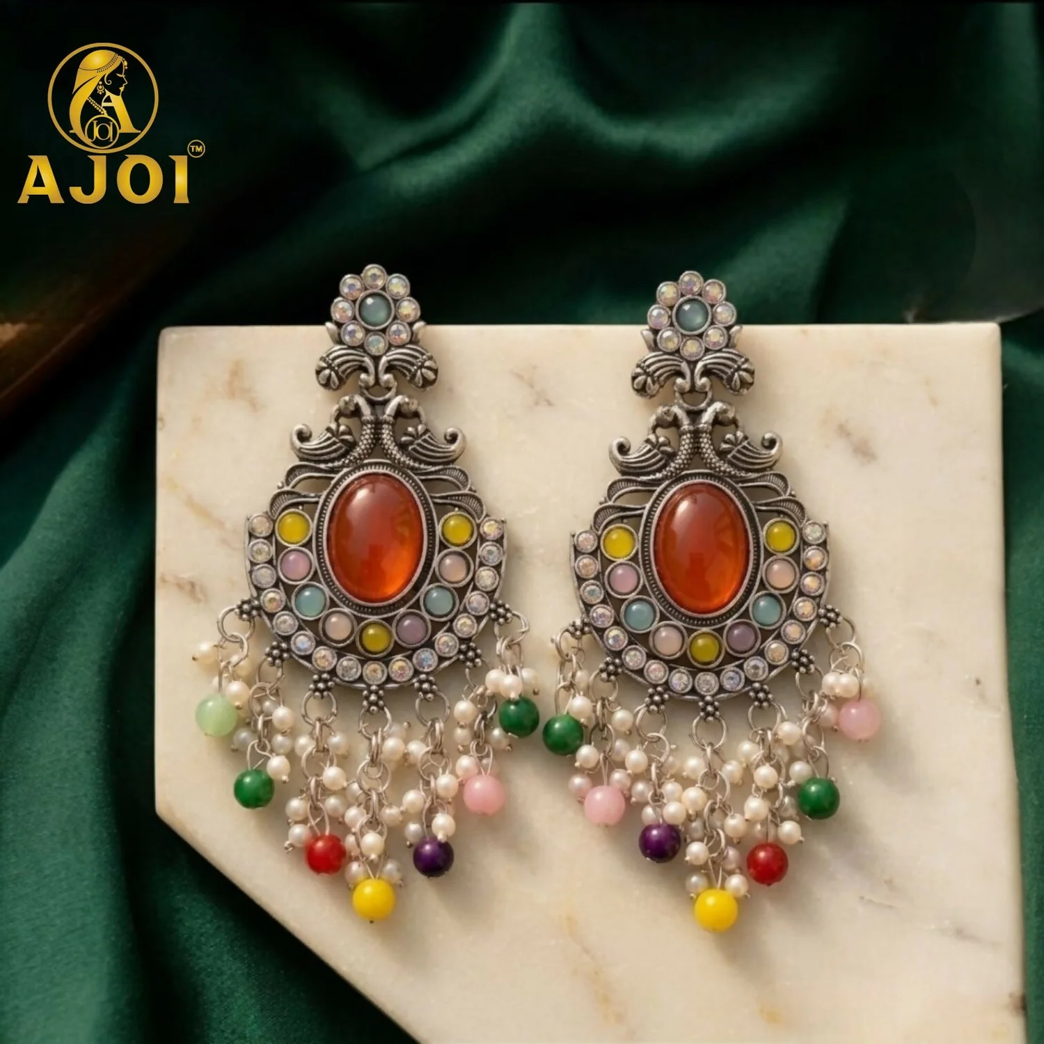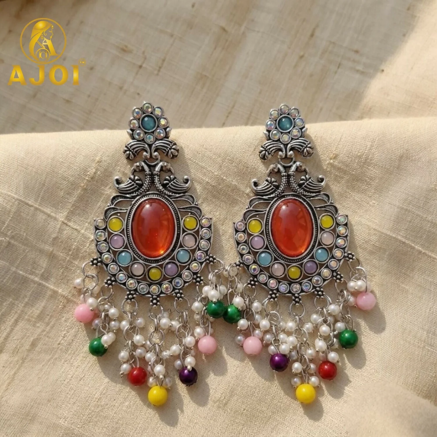 Be the first to review Oxidized Silver Multicolor Stone Chandbali Earrings with Pearl Bead Drops!
