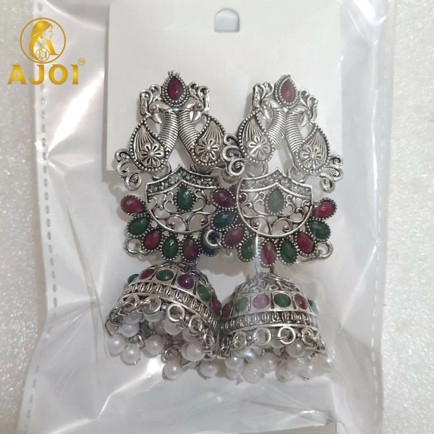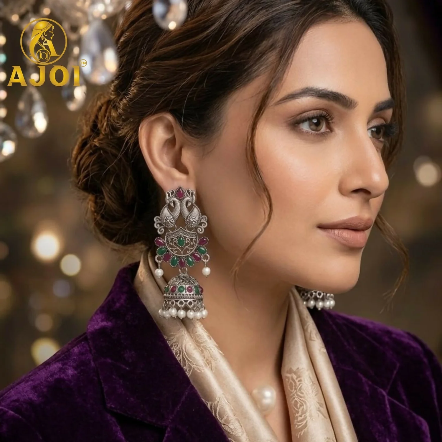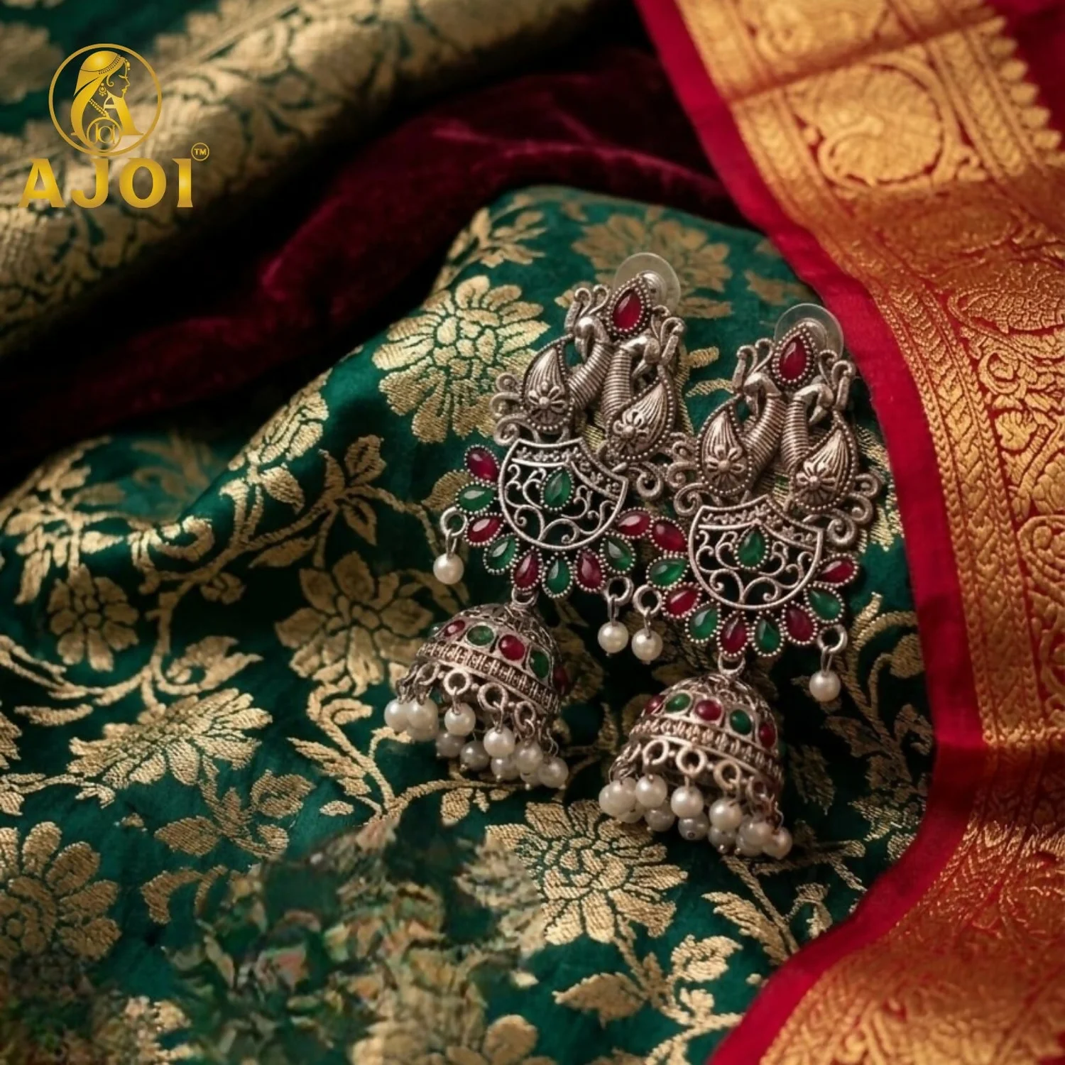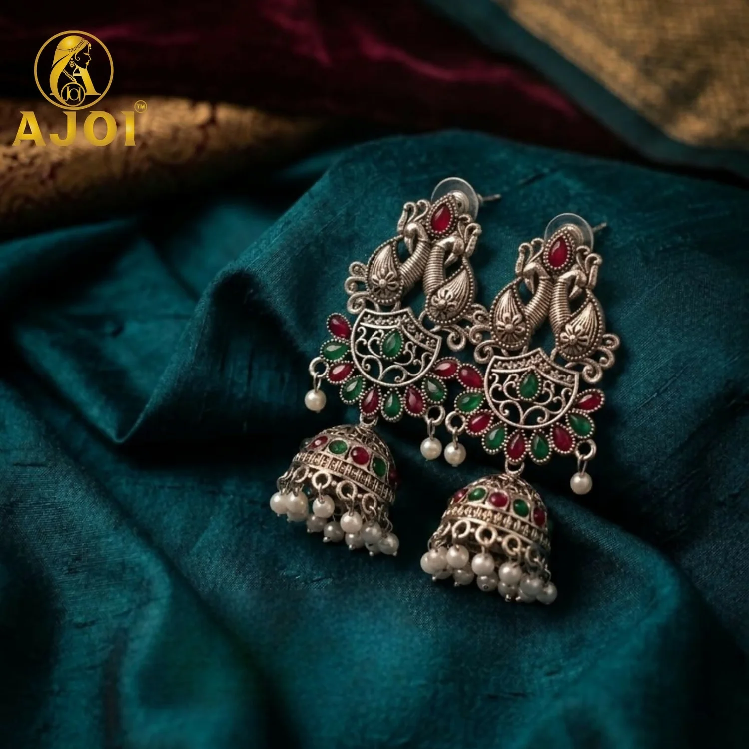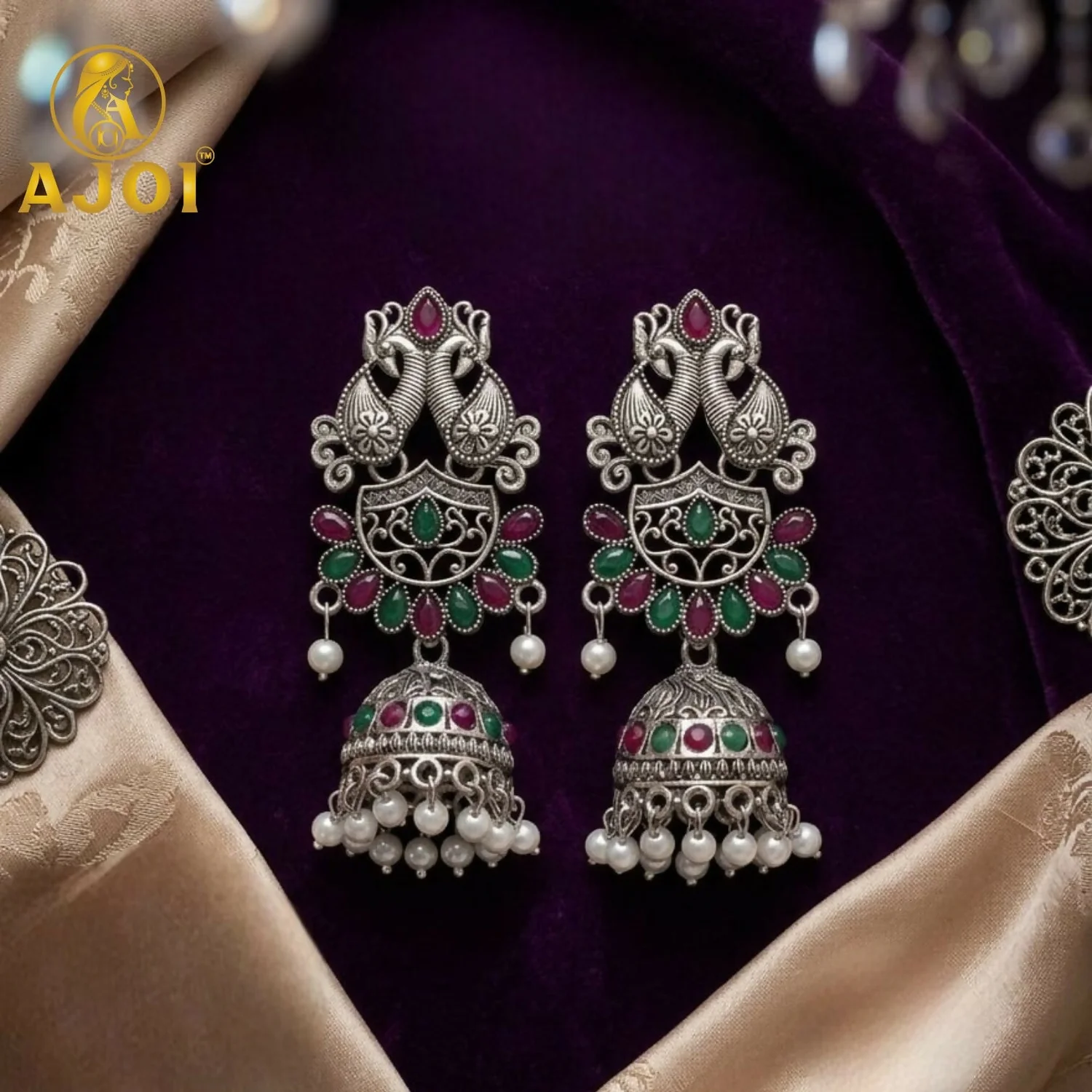 Be the first to review Oxidized Silver Peacock Jhumka Earrings with Ruby Green Stones & Pearls!