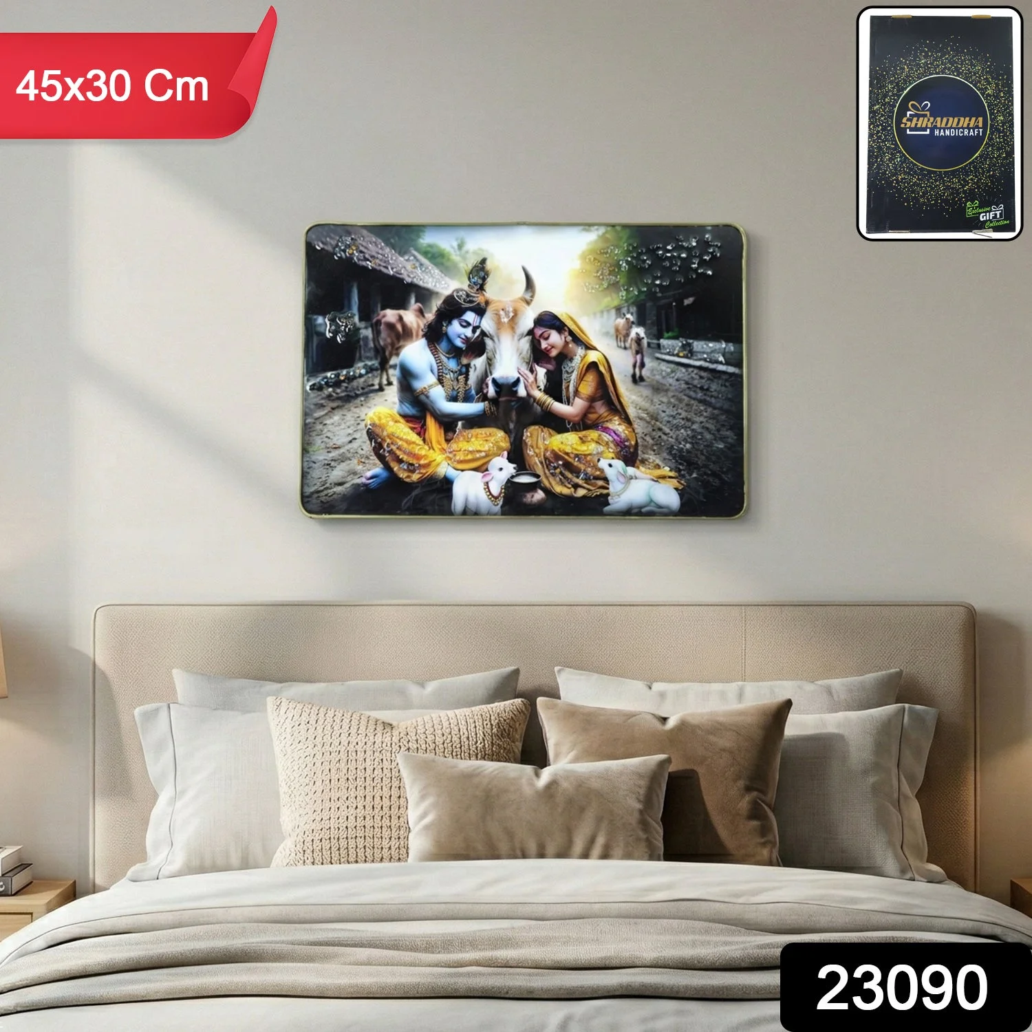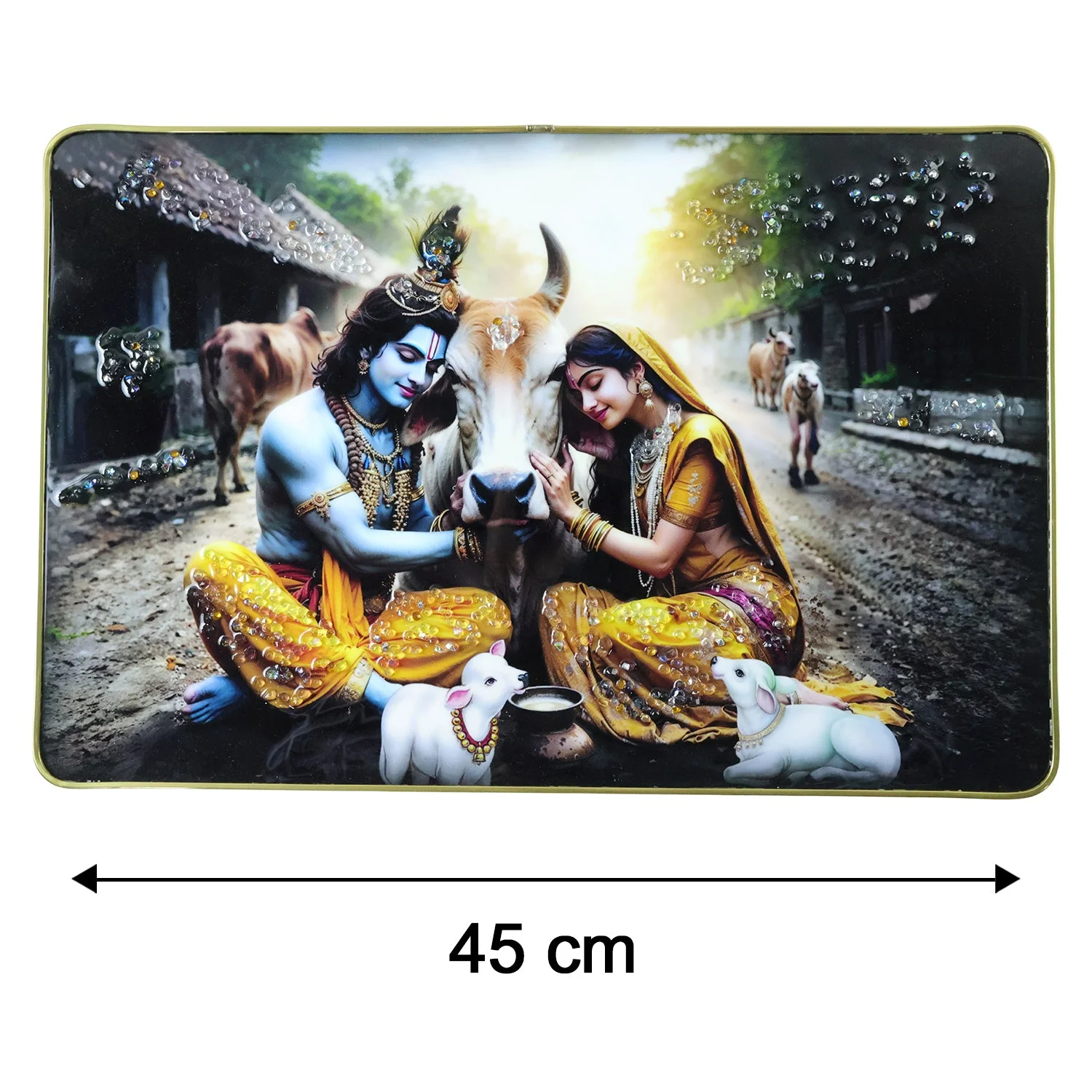 Peaceful Radha Krishna Village Scene Wall Art Frame 45x30 Cm 1 Pc – Premium Spiritual Decorative Panel with Cow Theme for Living Room Bedroom Temple Wall Décor