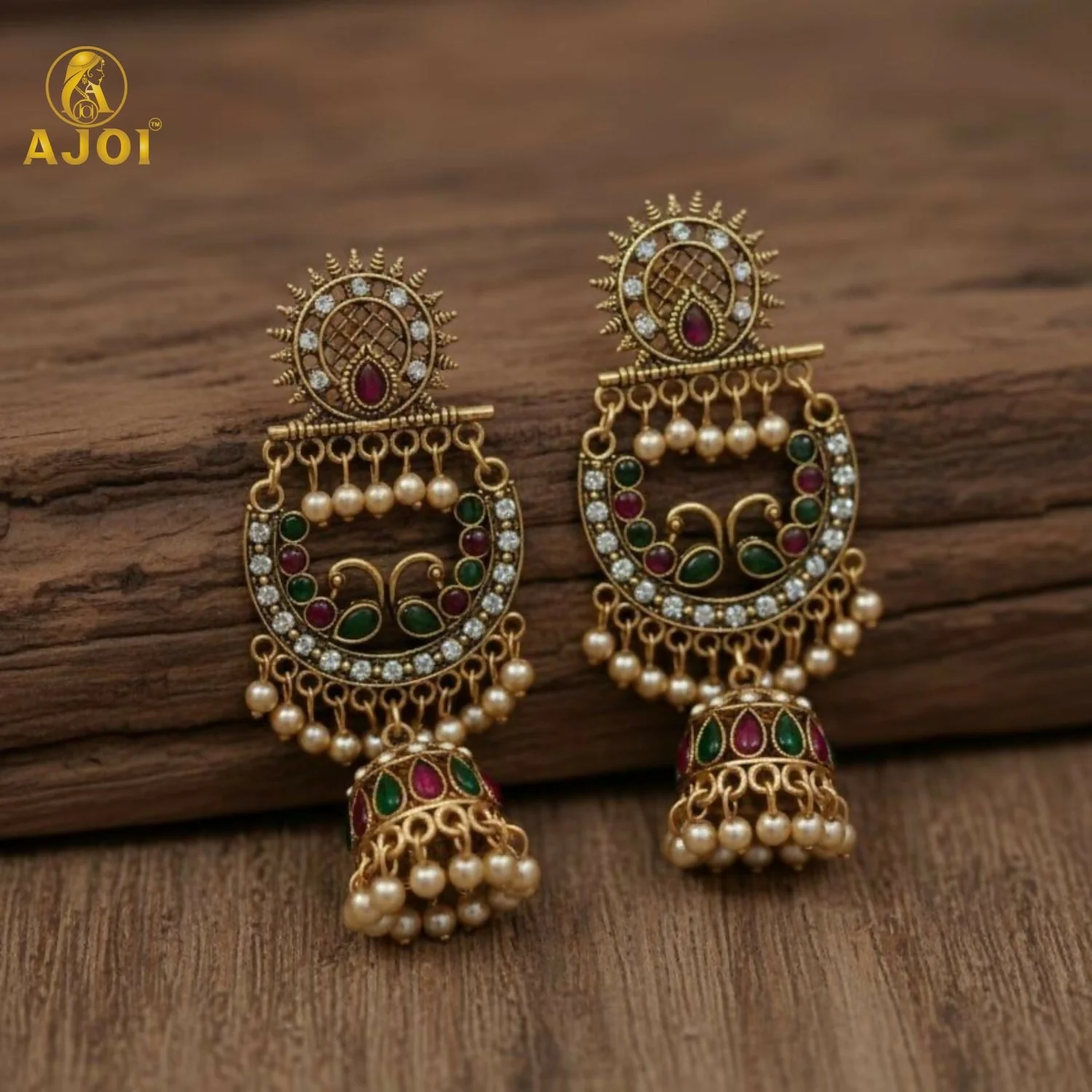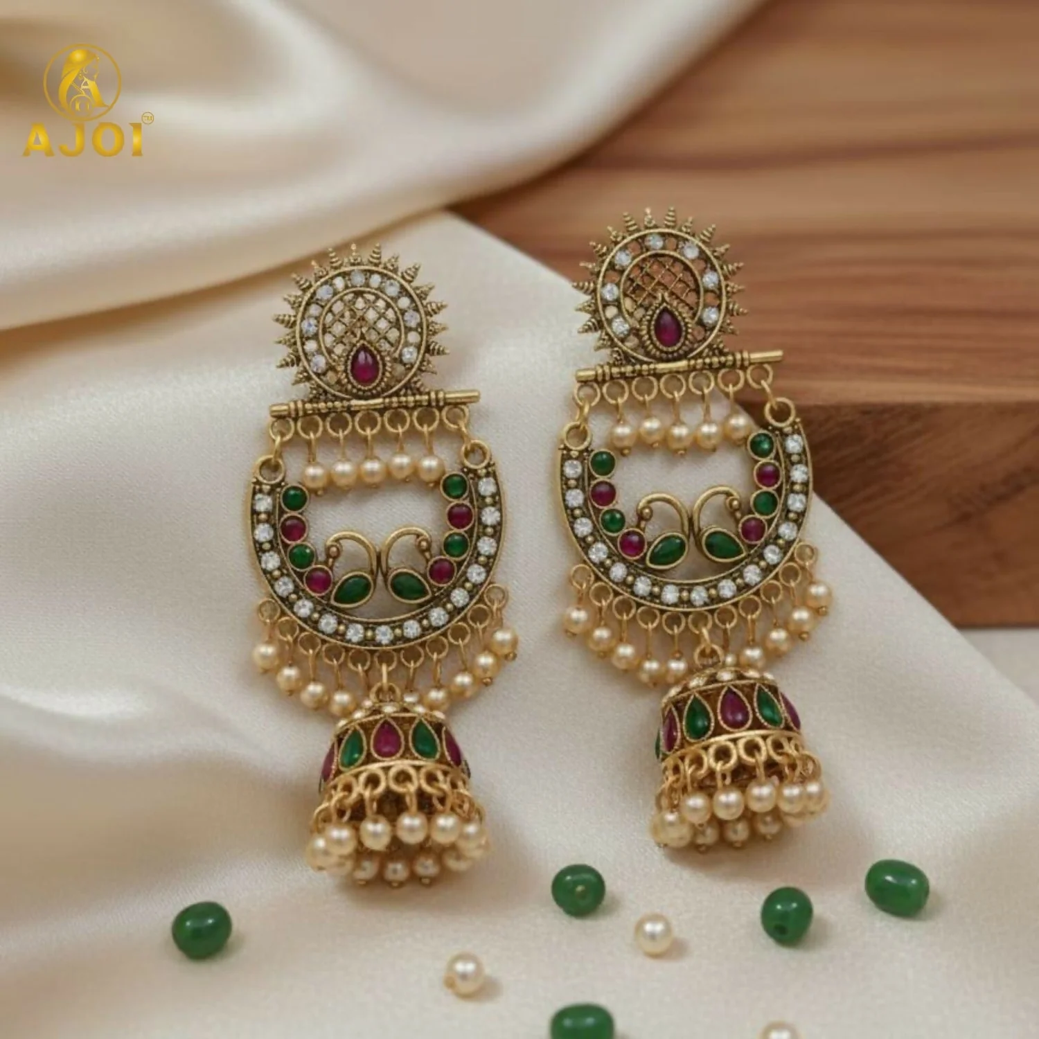 Celebrate timeless Indian artistry with these Peacock Motif Temple Jhumka Earrings, crafted to reflect royal elegance and traditional charm. Designed in an antique gold finish, the earrings feature a graceful peacock-inspired pattern adorned with rich green and ruby-toned stones, symbolizing prosperity and beauty. The circular chandbali structure is enhanced with delicate pearl hangings, while the classic jhumka drop adds movement and festive allure.