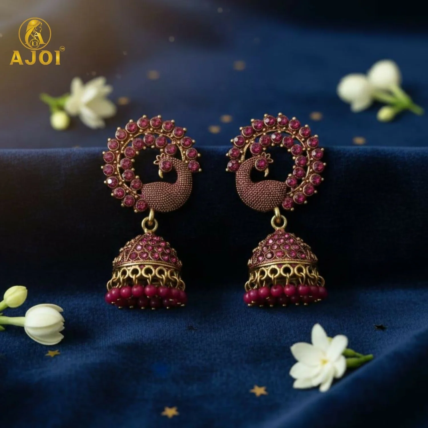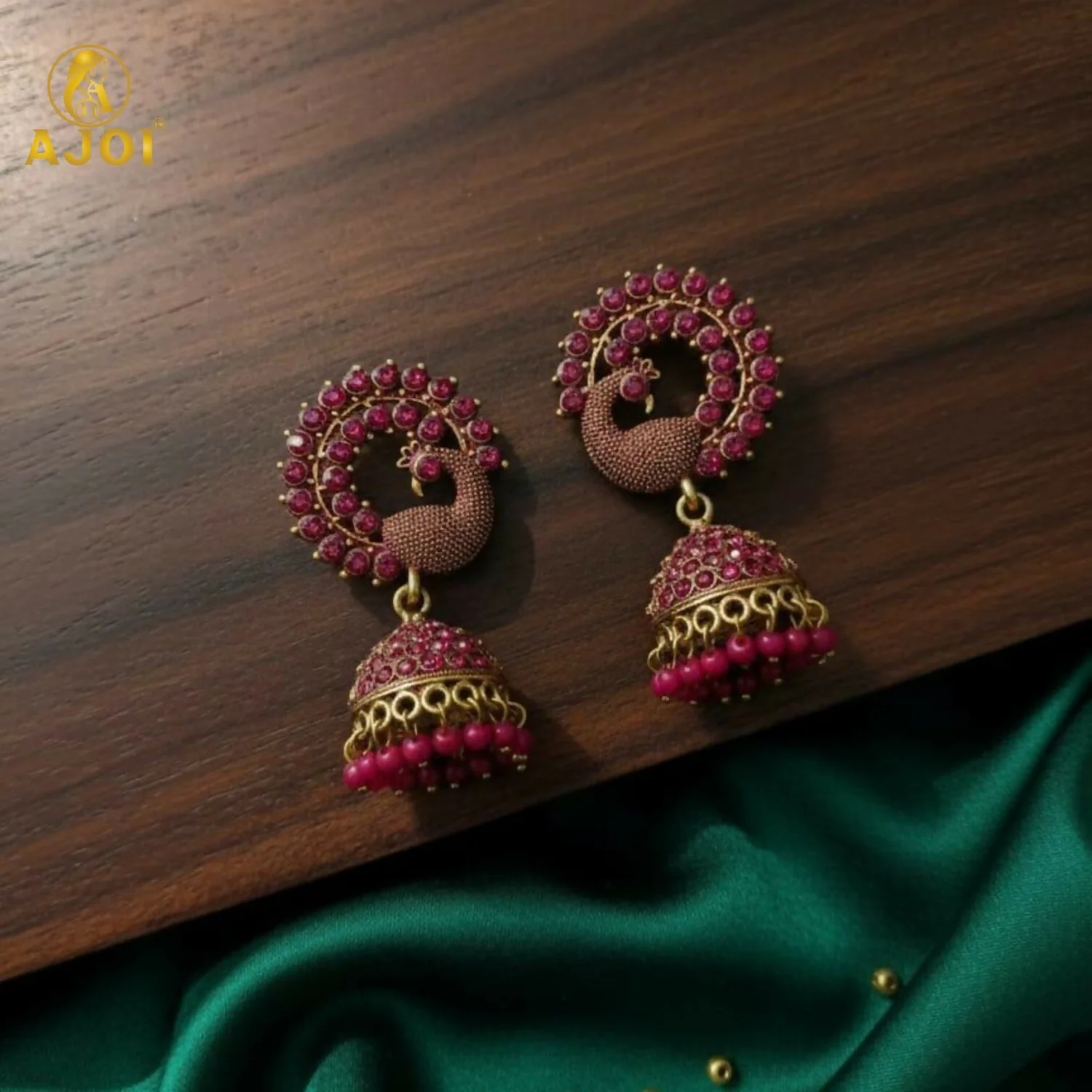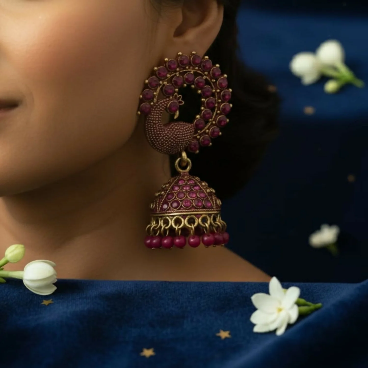 Be the first to review Peacock Motif Ruby-Tone Jhumka Earrings in Antique Gold Finish!
