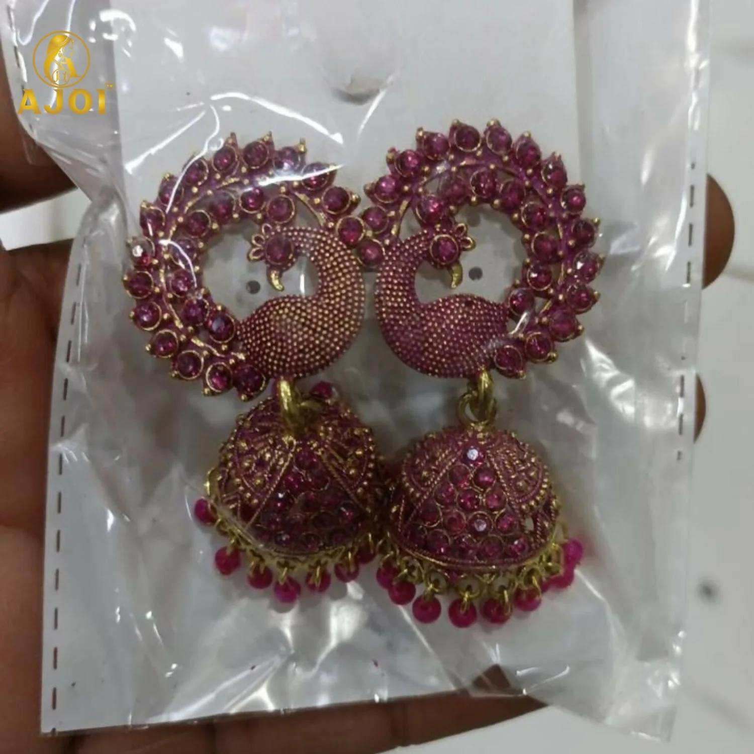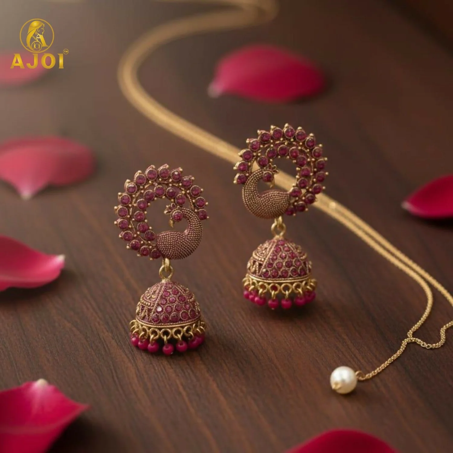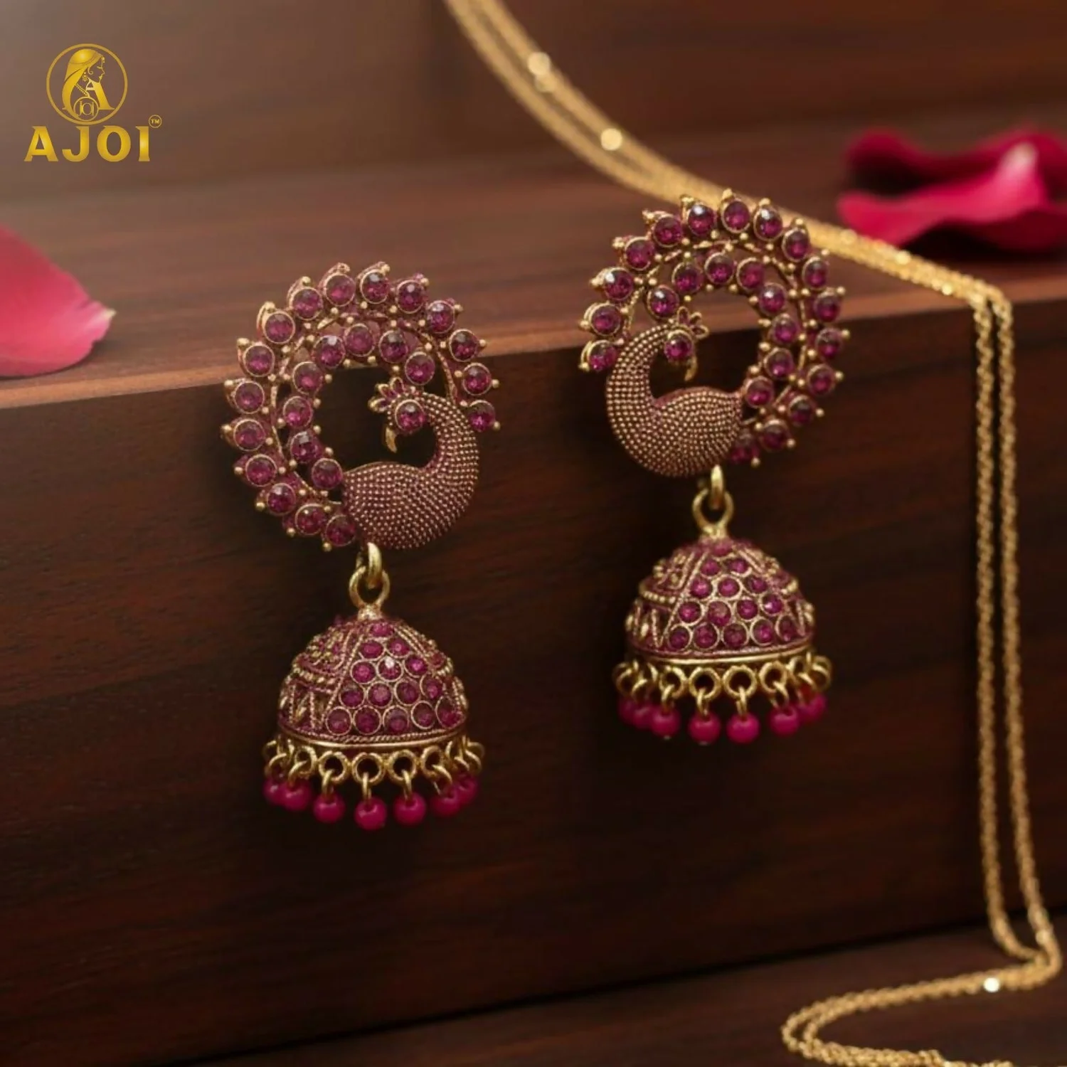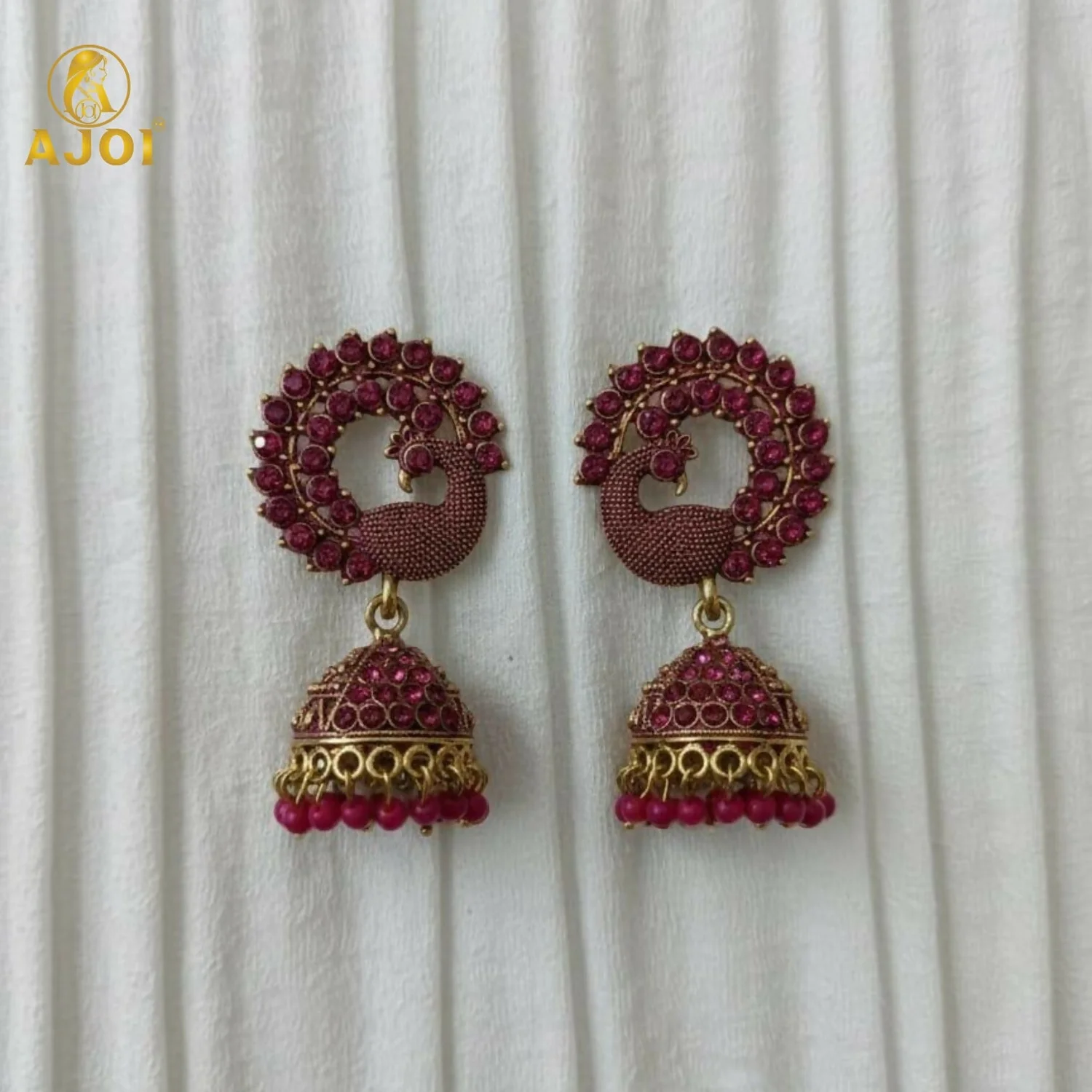 Be the first to review Peacock Motif Ruby-Tone Jhumka Earrings in Antique Gold Finish!